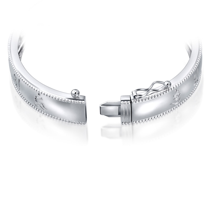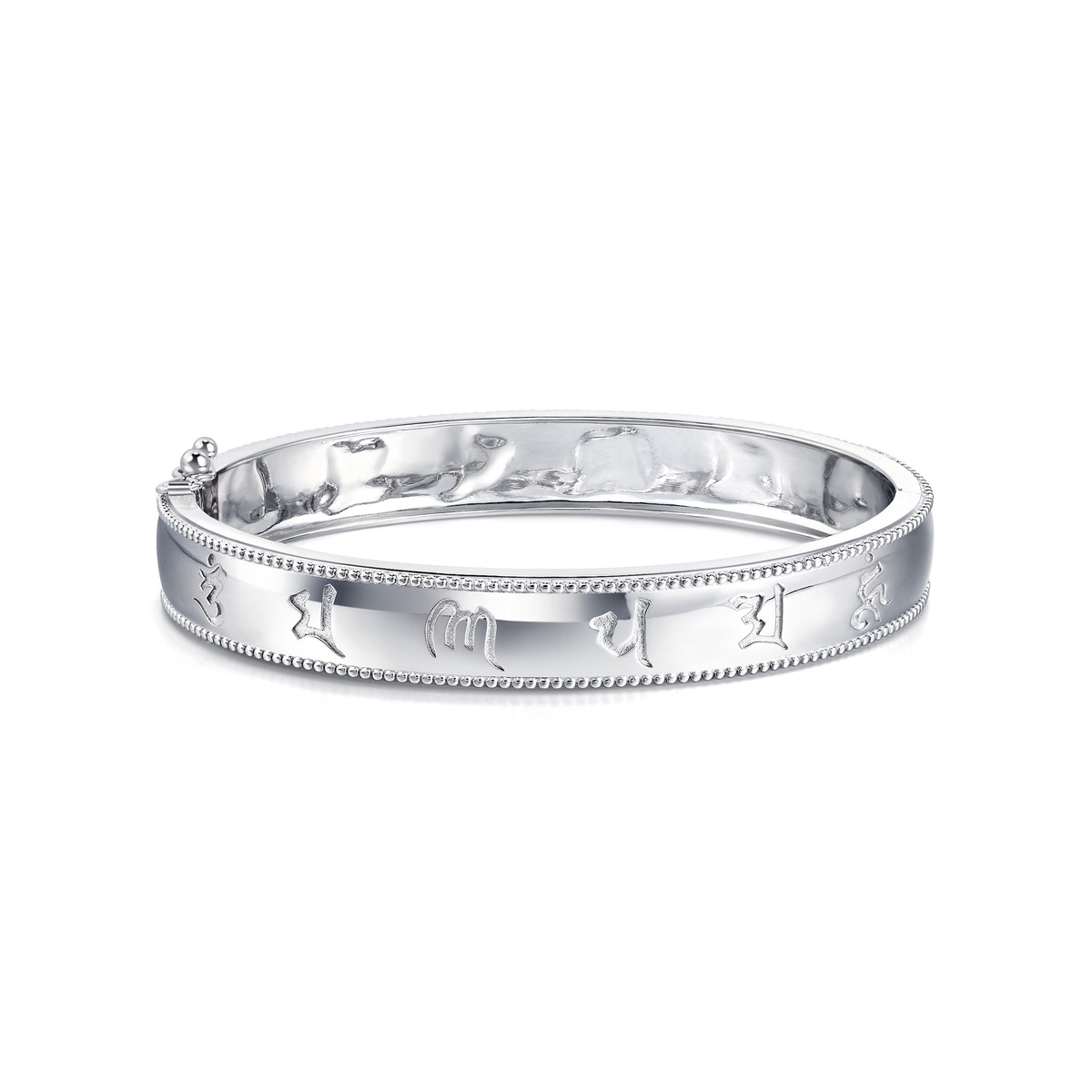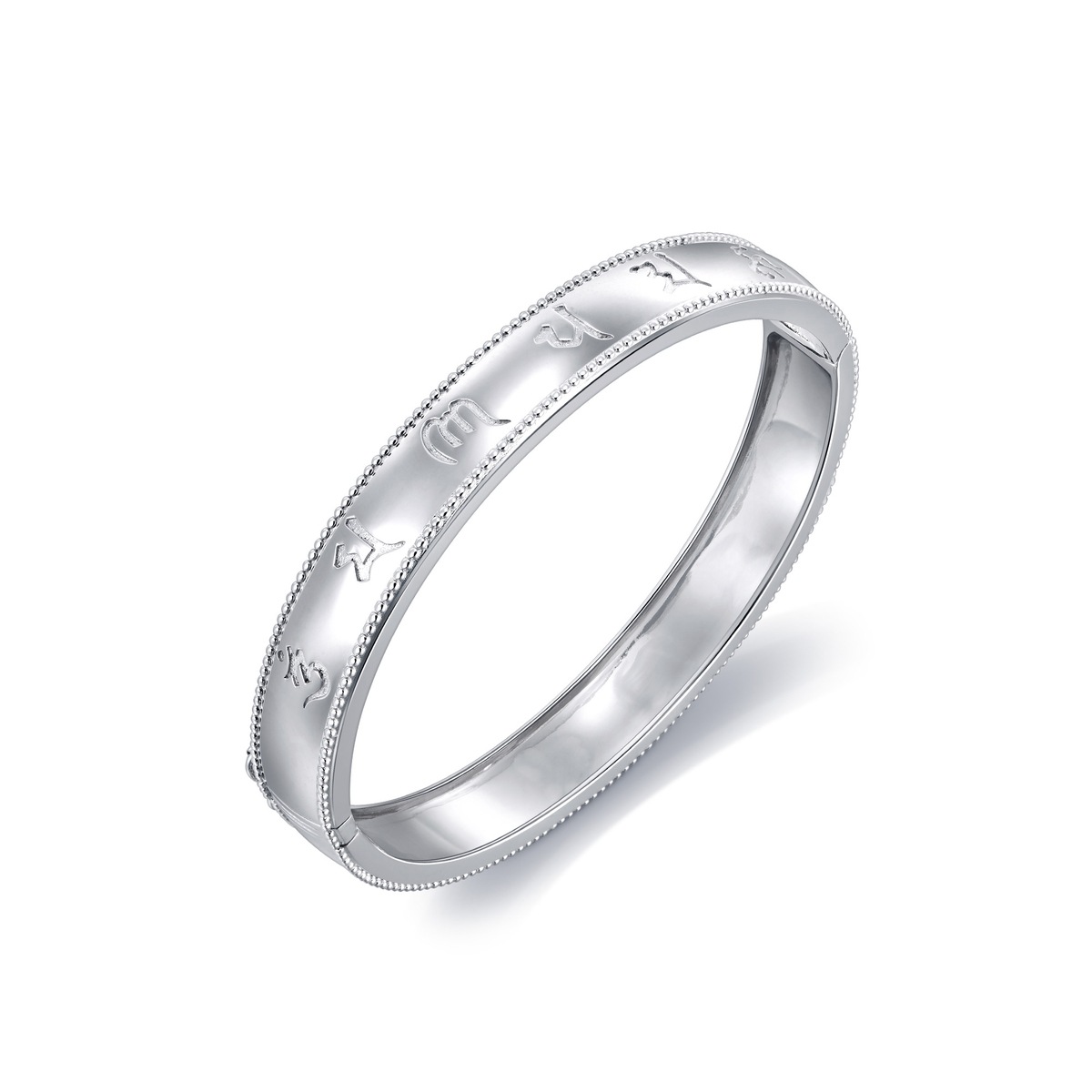 周生生950 鉑金手鐲,將大乘佛教中的六字大明咒經文「唵嘛呢叭咪吽」 概念融入飾品,寓意平安護身。