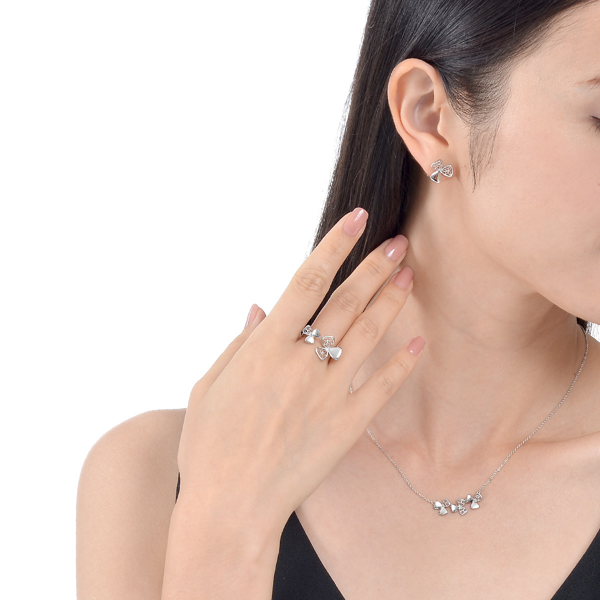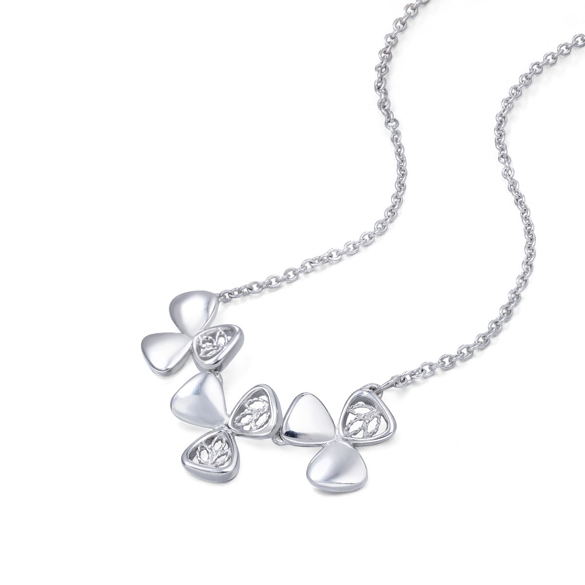 周生生靈感源自延齡草獨特的三葉形態,不對稱設計令形態更添趣味。啟發自印度奧裡薩(Orissa)的鏤空工藝,應用於鉑金 Lace 頸鍊之上,以蕾絲圖案代替葉紋,呈現優雅的女性美。