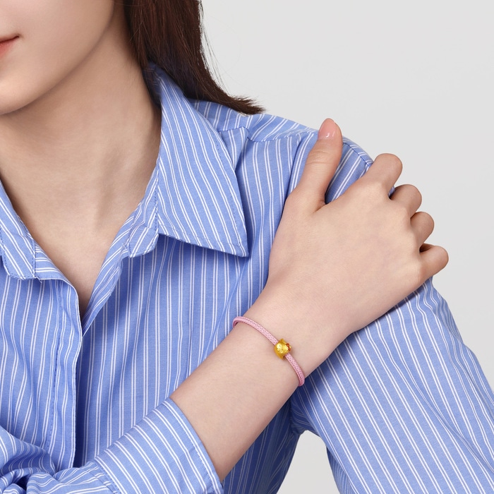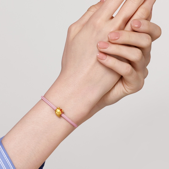 足金串珠以Monster主題的Hello Kitty為設計元素,特別採用彩繪塗層工藝,於黃金表面呈現繽紛色彩,營造維肖維妙的迷你鬼造型,形象活潑生動,趣怪可愛同時又玩味十足。