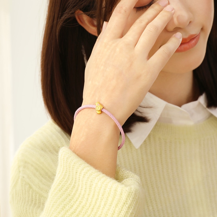 將Charme串珠按您預想的組合順序,逐一慢慢旋入配繩。串珠內壁設有硅膠,可幫助串珠固定在預想的位置,所以穿繩時感覺有點緊是正常現象。