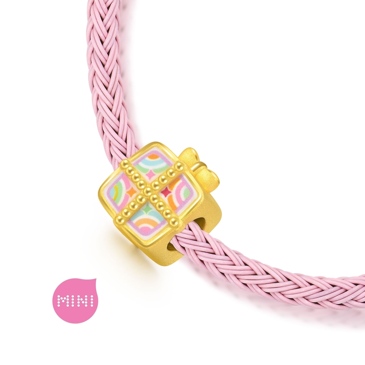 周生生Charme「寶貝」足金串珠,體積精緻小巧,工藝細緻,質感更顯細膩,配合彩繪塗層工藝,色彩繽紛奪目。以禮物盒為創作元素,立體造型可愛別緻,滿載驚喜與幸福,為佩戴者送上最真摯的祝願。