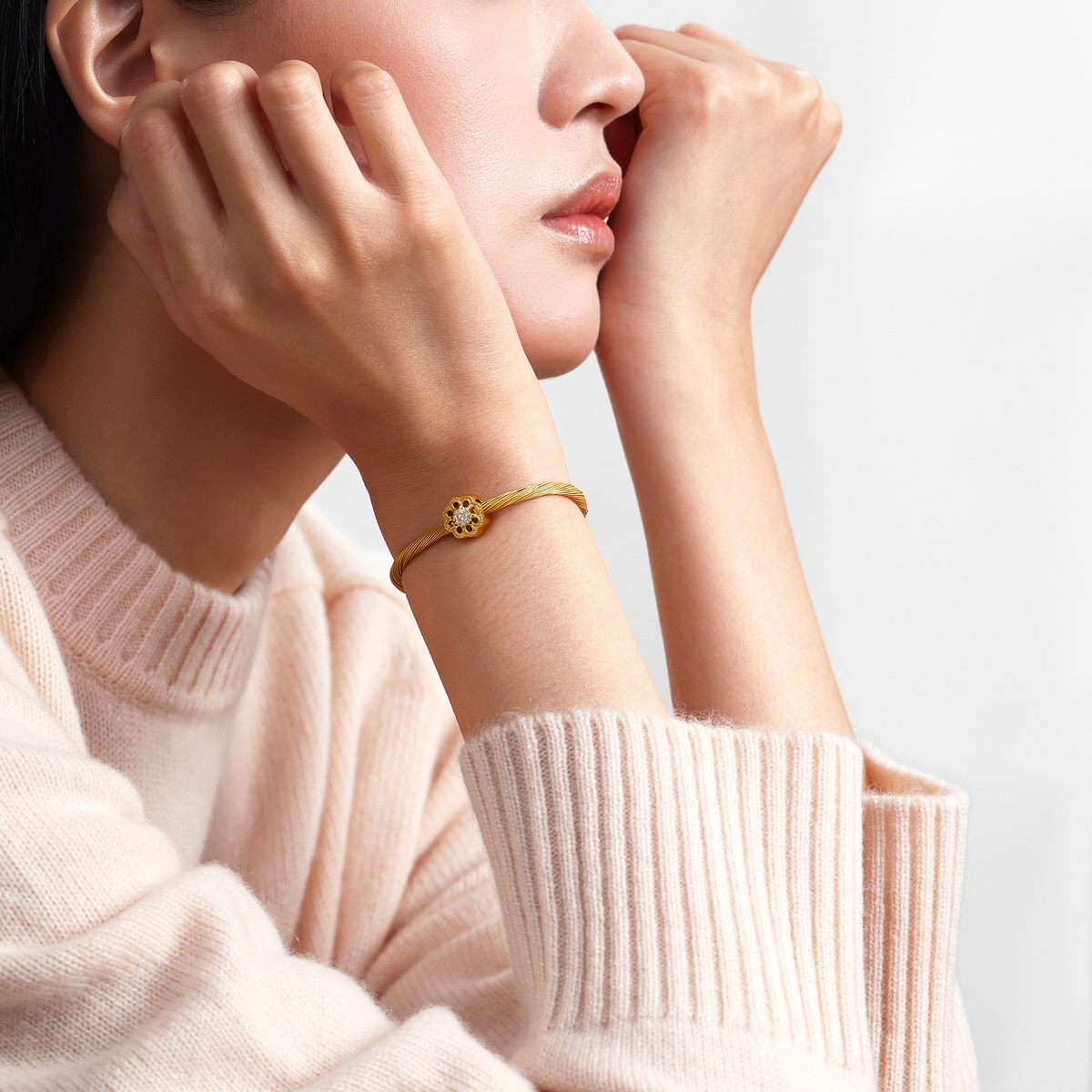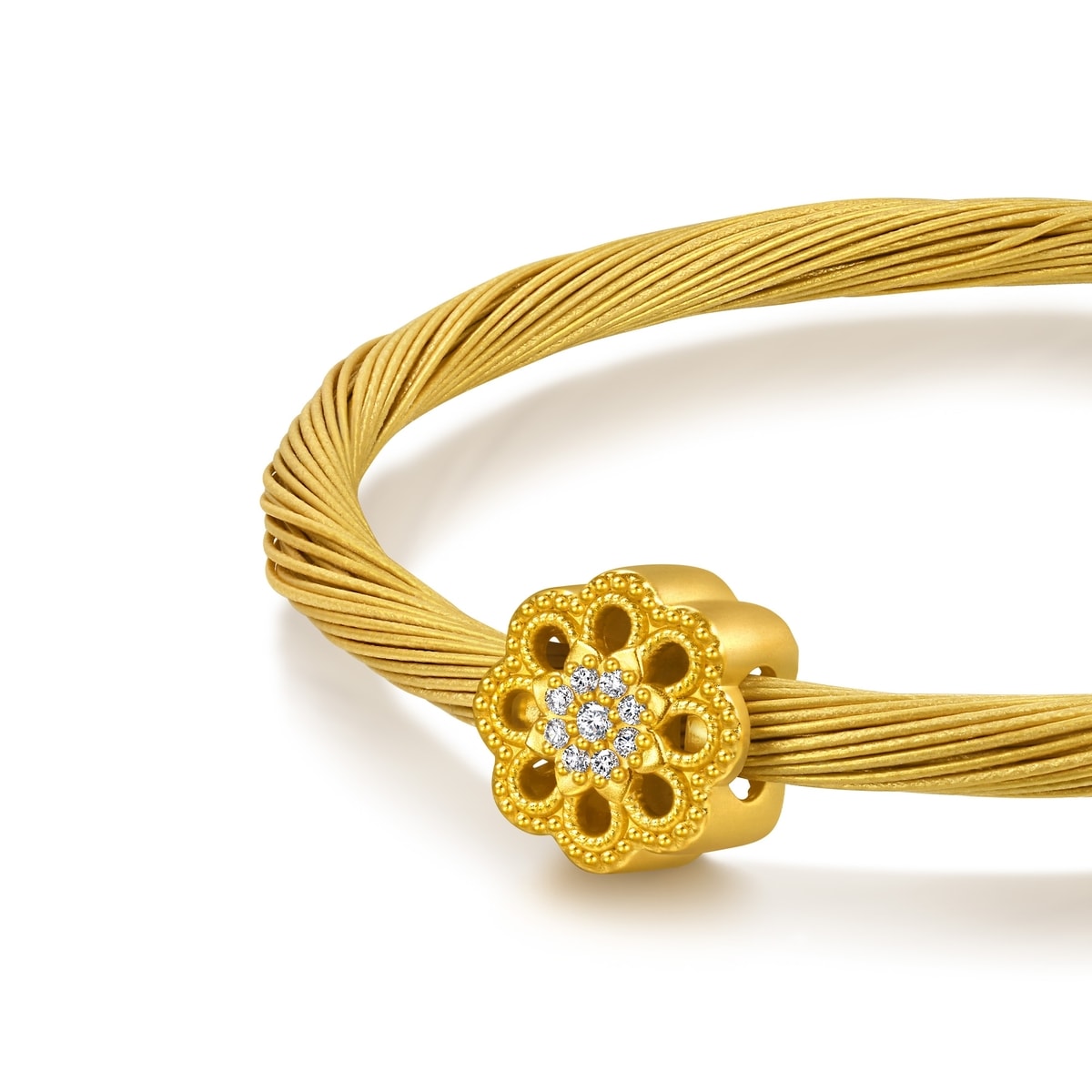 周生生足金鑽石串珠靈感源自佛教「曼陀羅」圖騰,細膩呈現圖案的對稱平衡之美。曼陀羅在梵文中意為「圓」,由幾何線條重複建構而成,無窮無盡、生生不息,象徵宇宙的秩序與和諧,被視為擁有聖神的力量,代表為身心帶來安寧、守護與祝福。