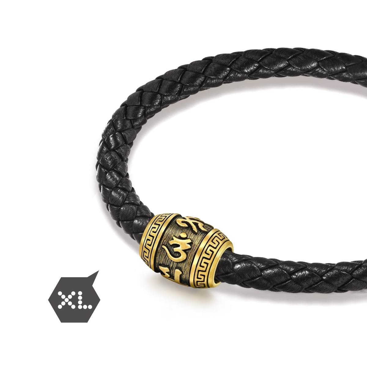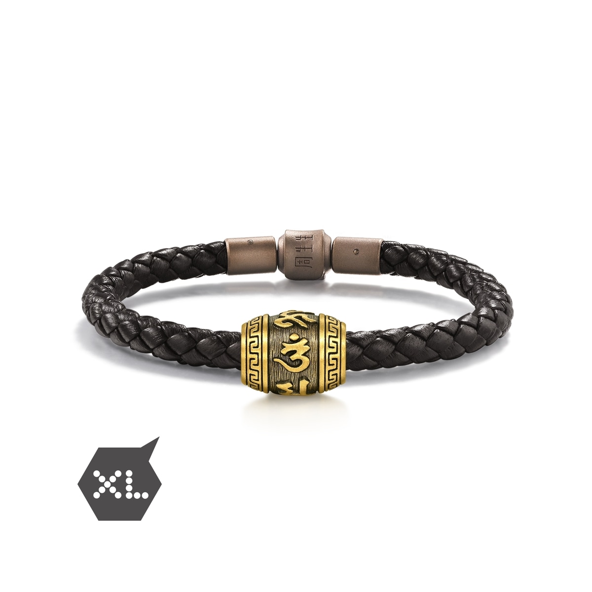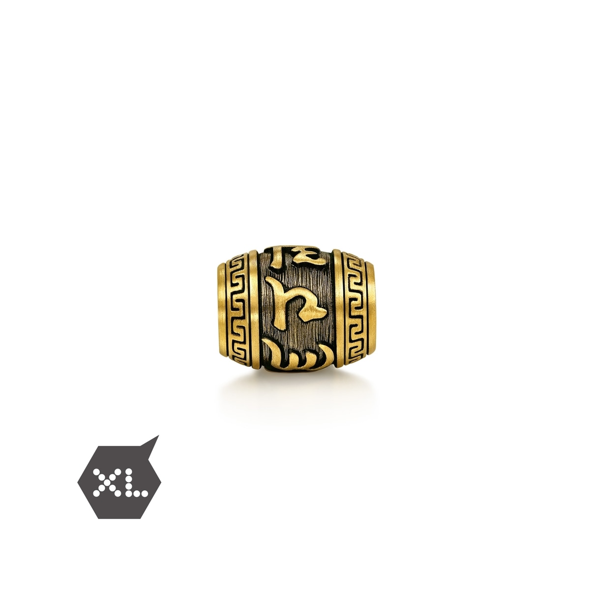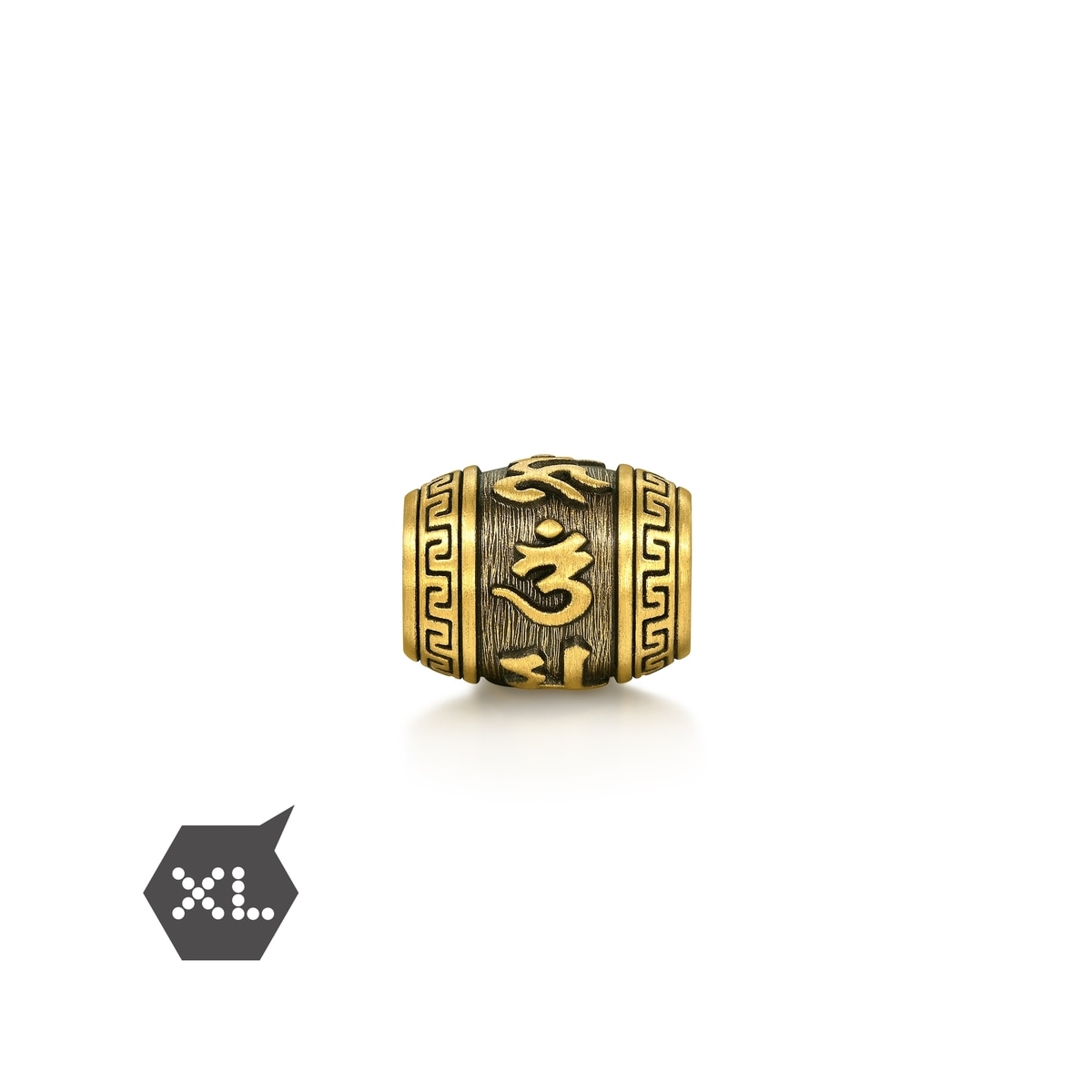 周生生足金串珠以佛教轉經筒為設計藍圖,結合硬金電鑄及酷黑工藝,造型立體分明。經筒表面刻有大明咒六字真言「唵嘛呢叭咪吽」,祈求平安護身、淨化俗世煩惱。