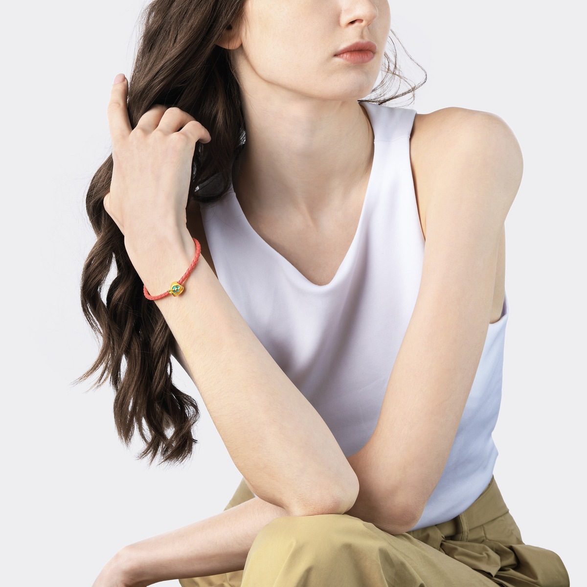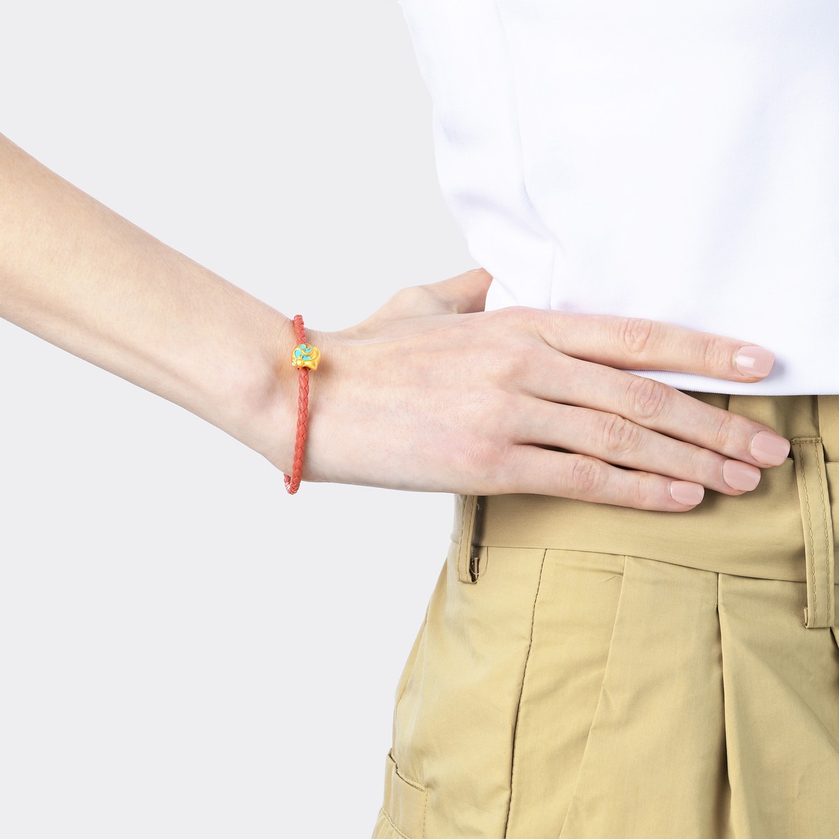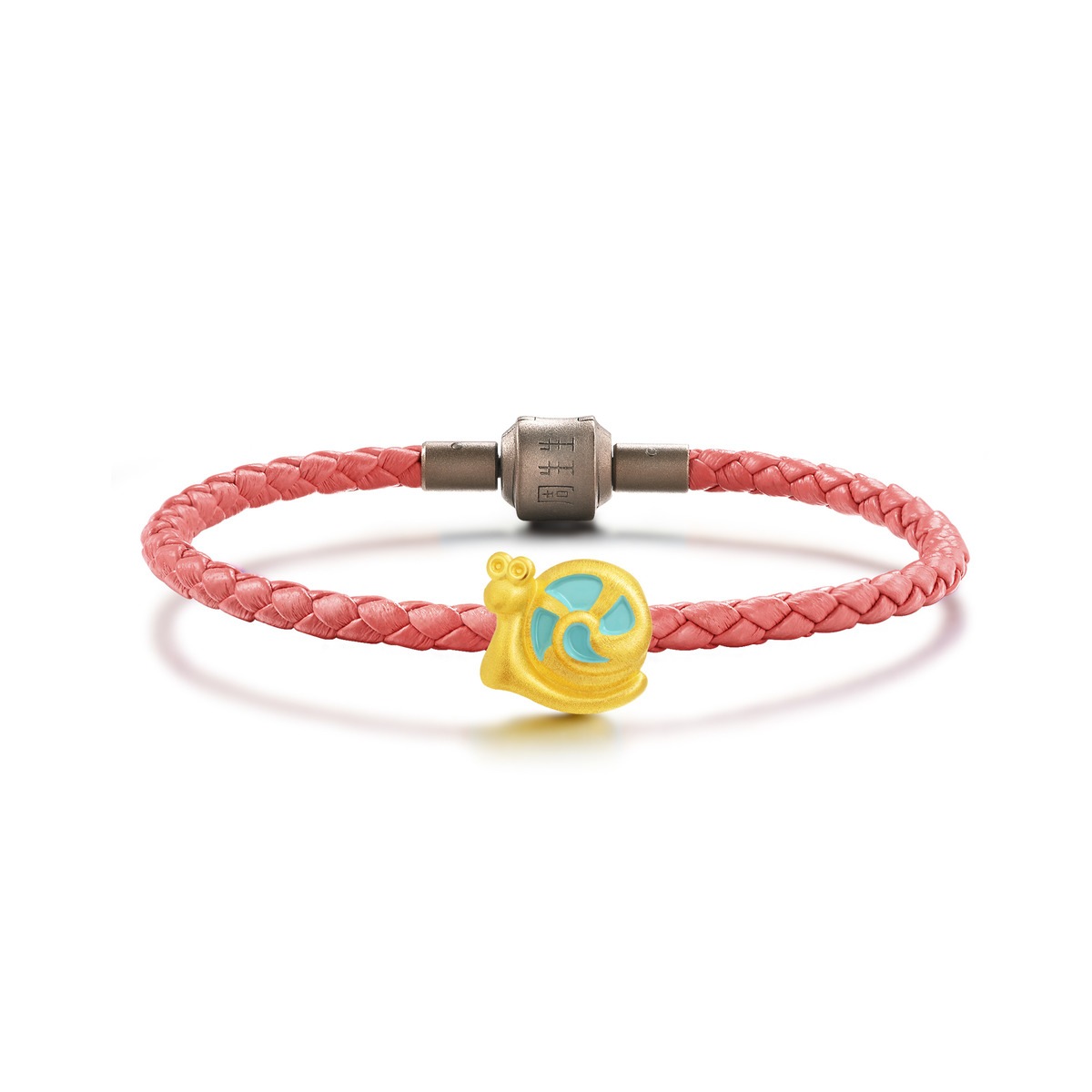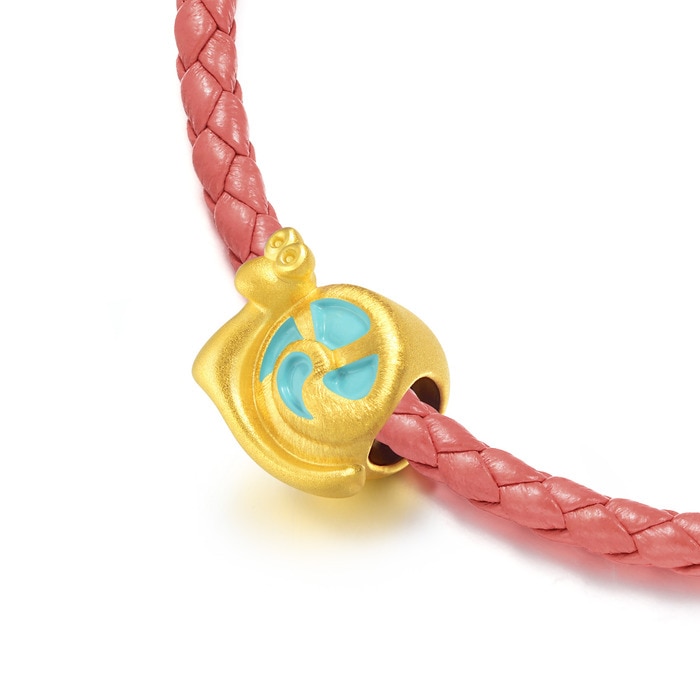 小蝸牛在腕間緩緩前進,可愛討喜。黃金串珠造型生動,加上透明彩繪塗層,令色彩層次更顯豐富。