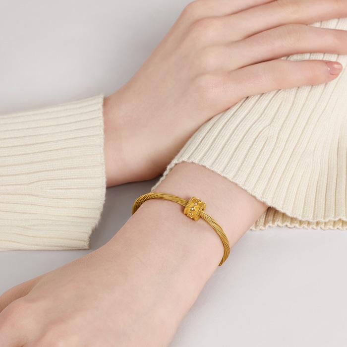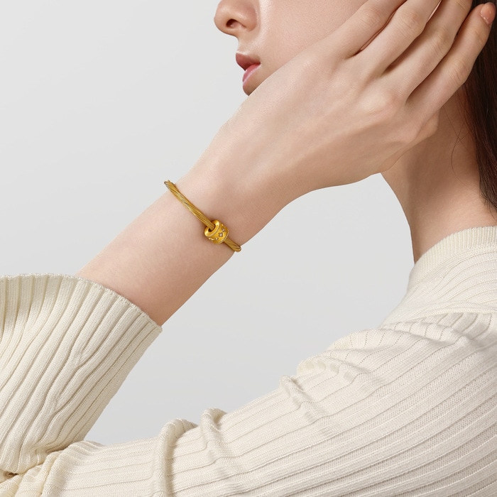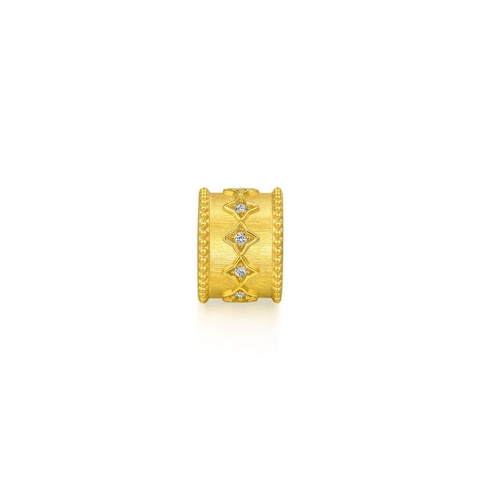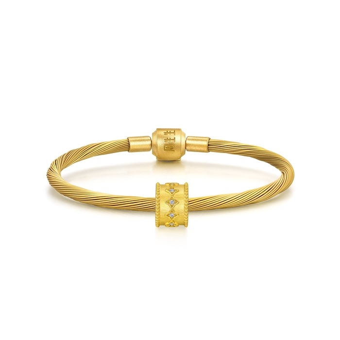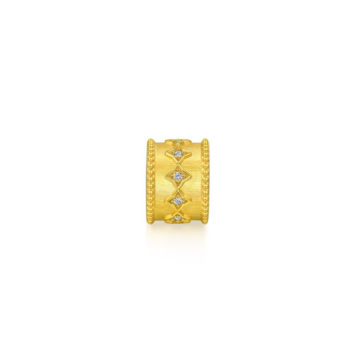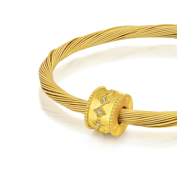 周生生足金鑽石串珠靈感源自北極星,採用卓越硬黃金電鑄工藝及精緻勾絲工藝,傾注時間以人手打造黃金細緻質感,以閃耀美鑽化作迷人星光,寓意用星光守護幸福,指引方向,兩側綴有立體珠邊花紋,別具浪漫復古風格,集時尚與祝福於一身。