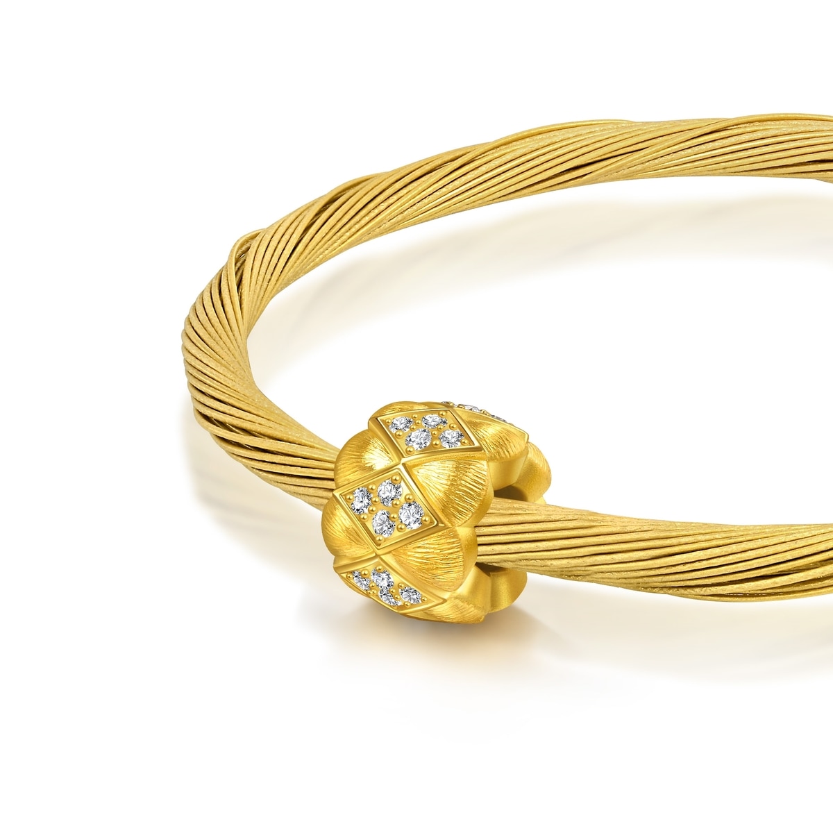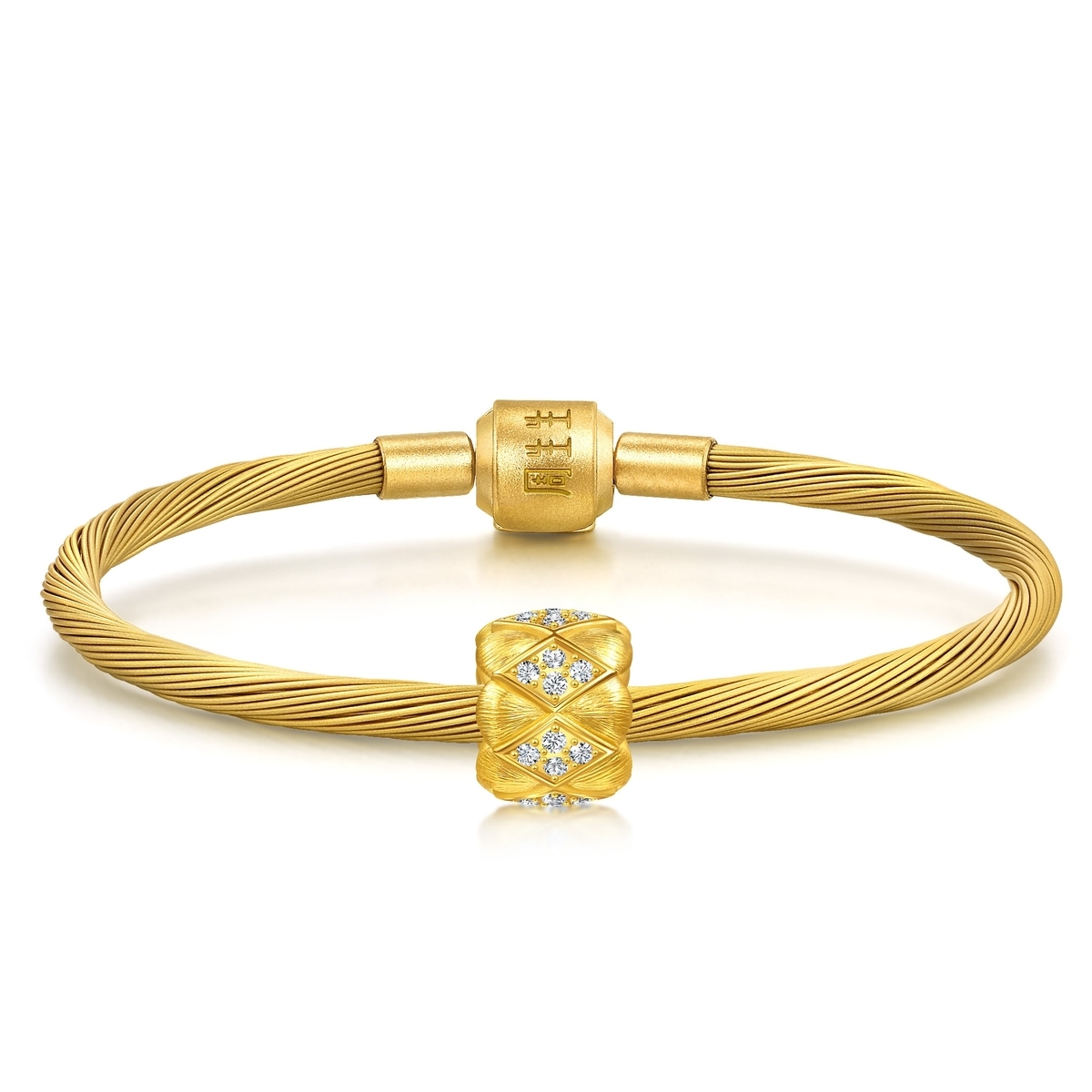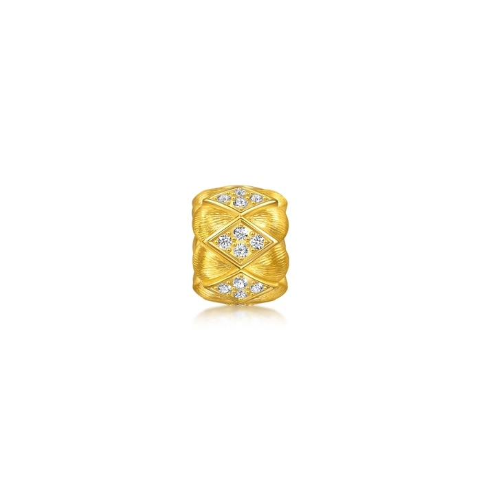 周生生足金鑽石串珠靈感源自幸運象徵「銀杏葉」,採用卓越硬金電鑄及手工勾絲工藝,賦予黃金高貴復古質感。銀杏葉象徵幸福的愛情,更代表財富與智慧,串珠表面特別排列七組葉子,精鑲美鑽相間其中,象徵一週七天都被幸福環繞,滿載美滿祝福。