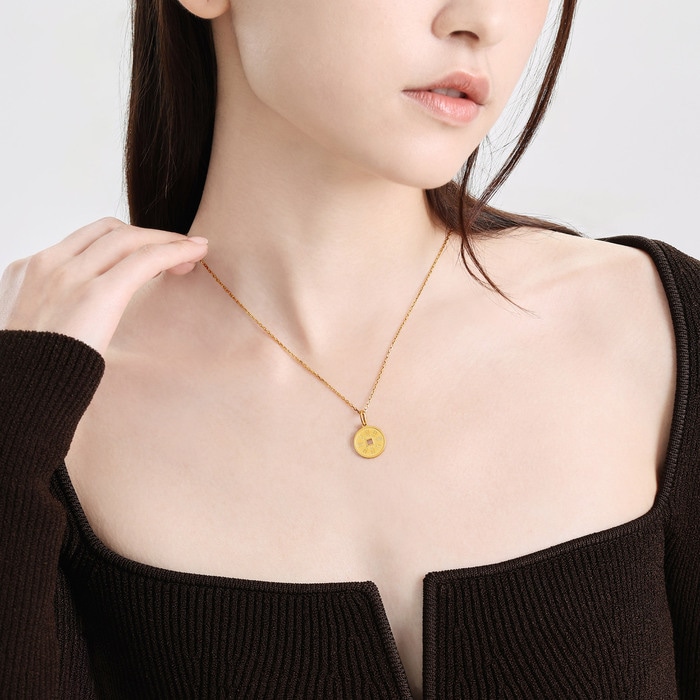 周生生足金吊墜以道教法器「山鬼花錢」為設計藍圖,結合卓越黃金工藝及古祖黃金工藝,呈現細緻啞光質感,別具東方古典韻味。花錢表面刻有太上老君咒文及八卦之數,寓意招財旺運、護佑平安。