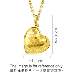 周生生足金吊墜採用心形外框設計,內襯六邊形蜂巢切割面,以創新黃金工藝,打造出具高光鏡面的效果,反射閃爍金光。設計極具現代感。特別刻有“Forever”一字,象徵永恆無盡的愛,工藝精緻,質感細膩,輕易配搭各種時尚風格。