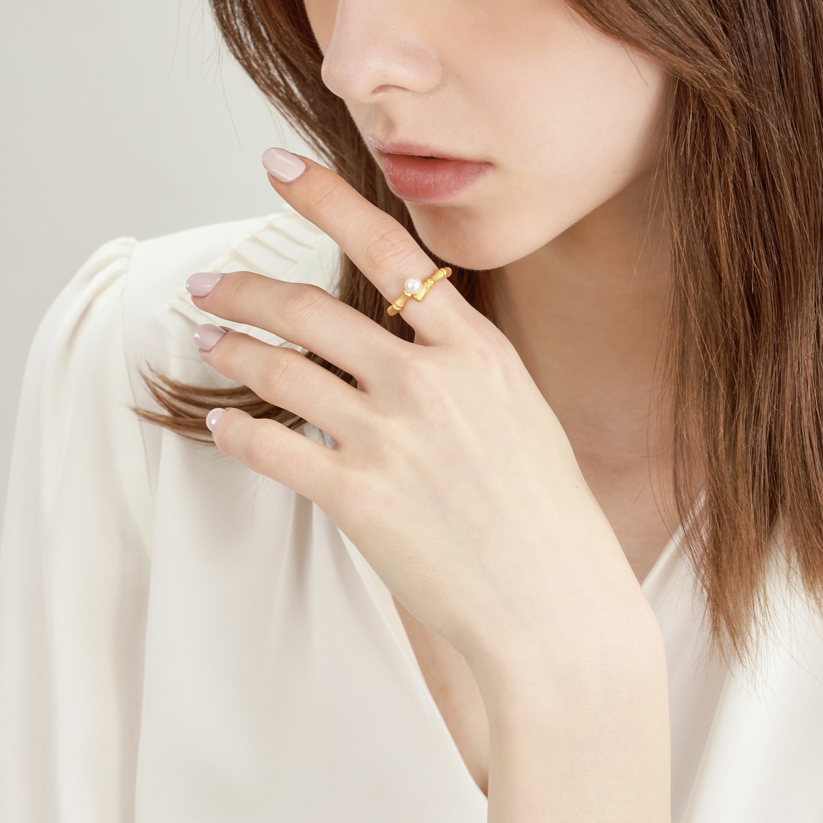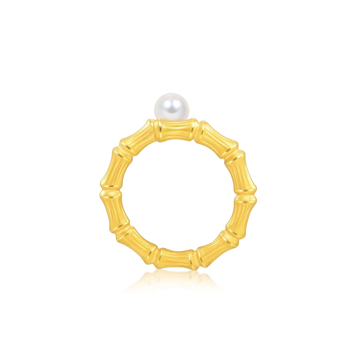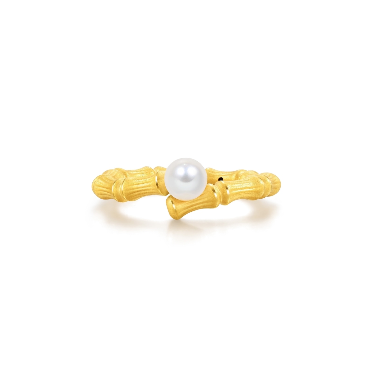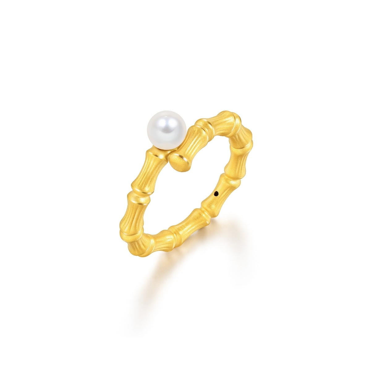周生生足金珍珠戒指,以「 竹」為靈感之源,採用硬金電鑄工藝,呈現細膩質感。「竹」自古被譽為「四君子」之一,生而有節、彎而不折,象徵柔中有剛、品格高尚正直,其翠色長存,更寓意健康長壽、青春永駐。與「珍珠」相互映襯,蘊藏「珍愛、珍惜」的豐富含義,設計古典清雅,更滿載對佩戴者的美好祝福。
