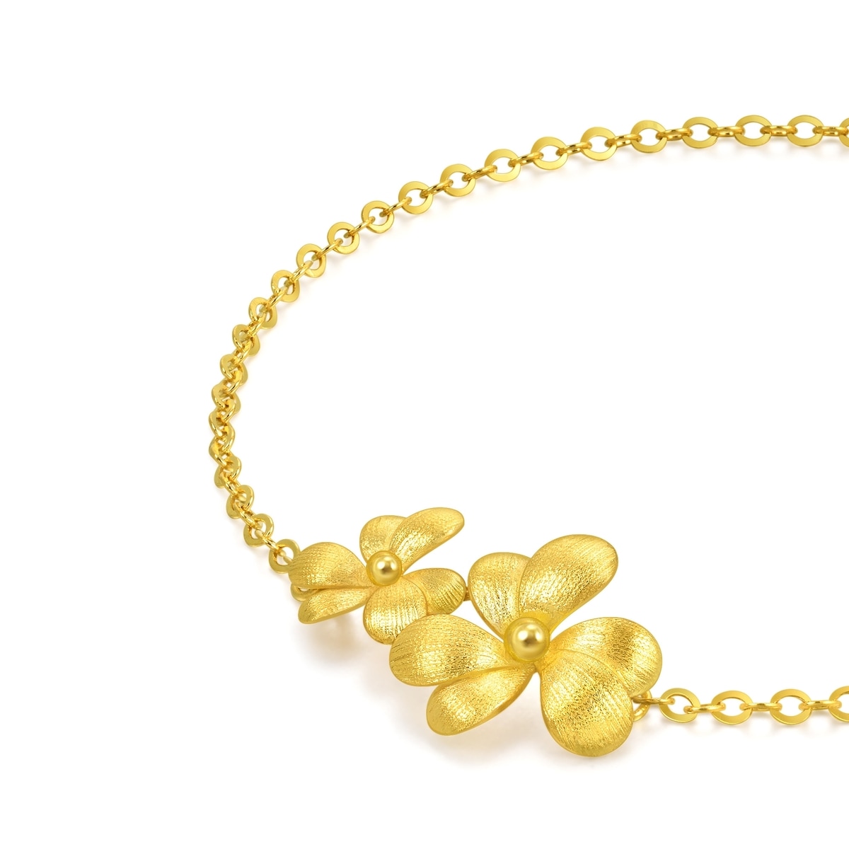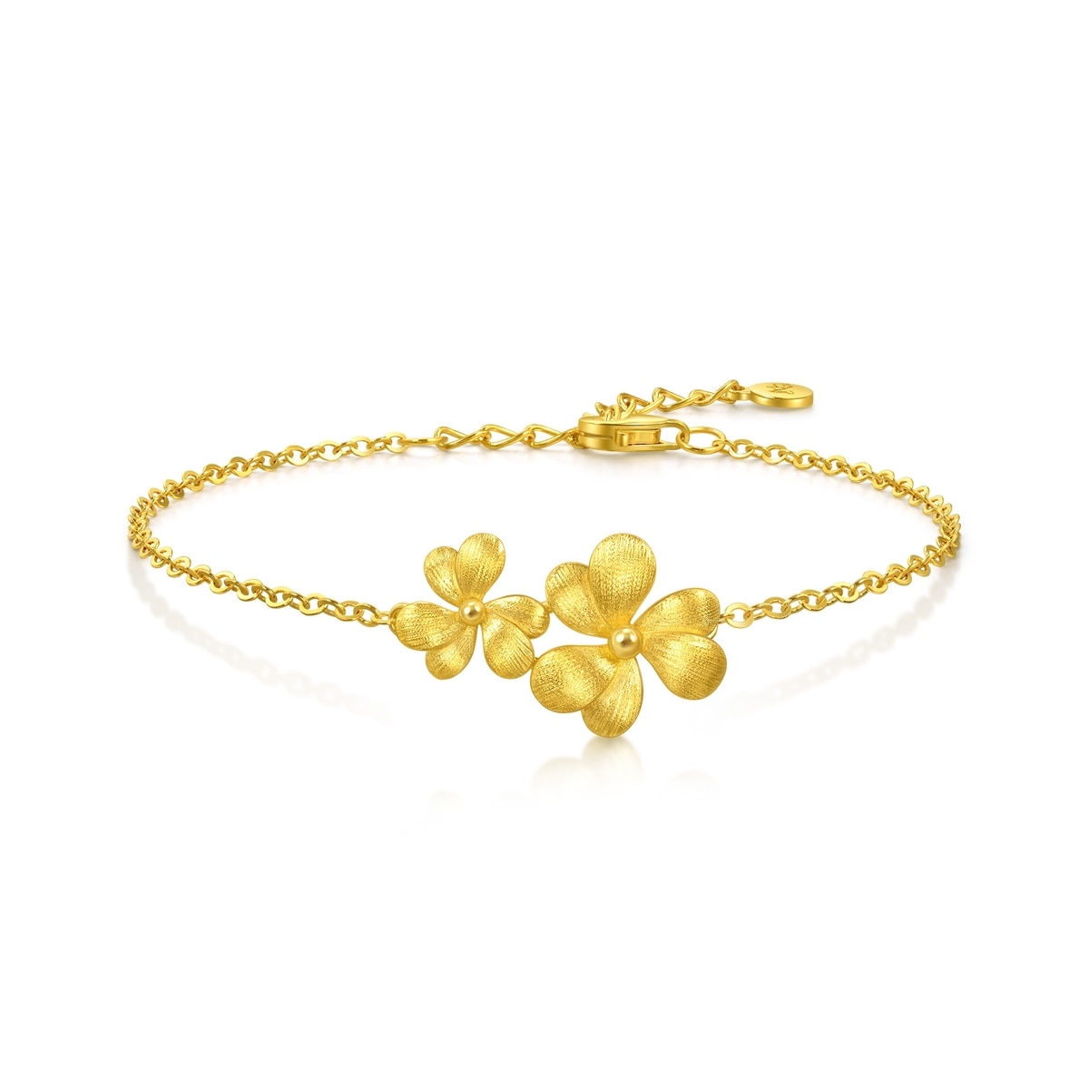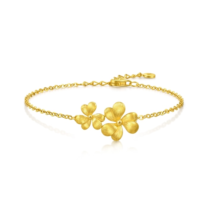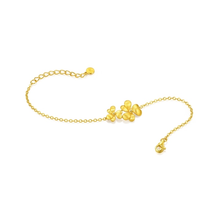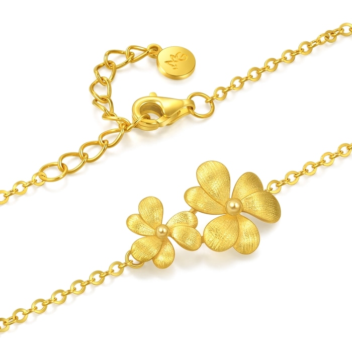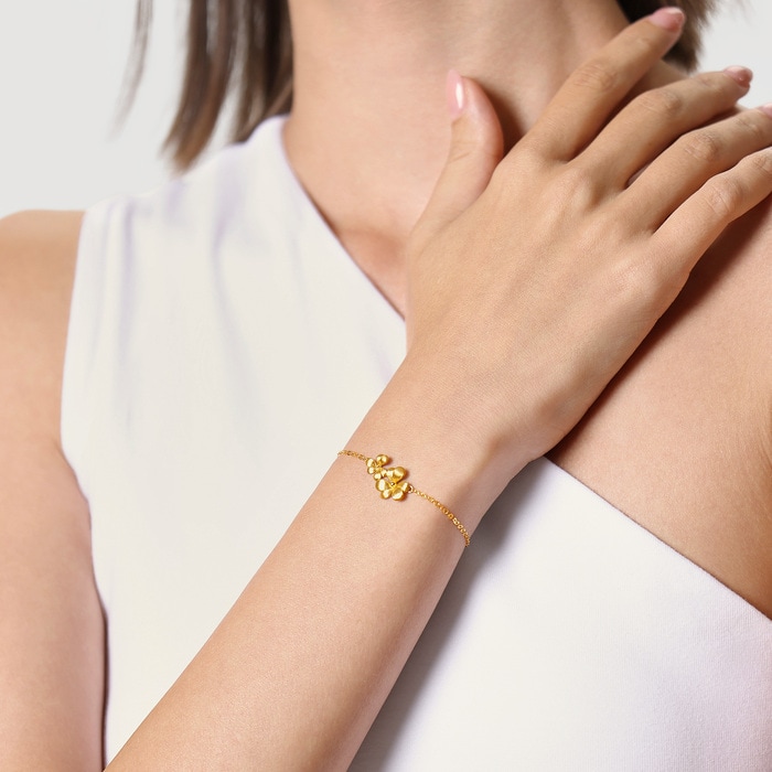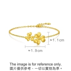 周生生微糖黃金手鍊,靈感源自三片心形拼接而成的三葉草,採用卓越黃金及拉絲工藝,用平行線的方式切割金屬表面,間隔比髮絲還細密,讓金面質感絲滑如綢緞,光芒溫潤如滿月,呈現出獨具一格的光澤與質感。 「三葉草」是幸運的象徵,三片葉子分別代表信仰、希望、愛情,蘊含堅定追尋美好幸福與未來的寓意。