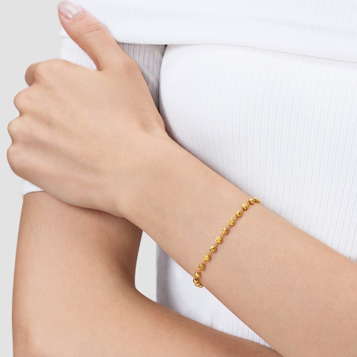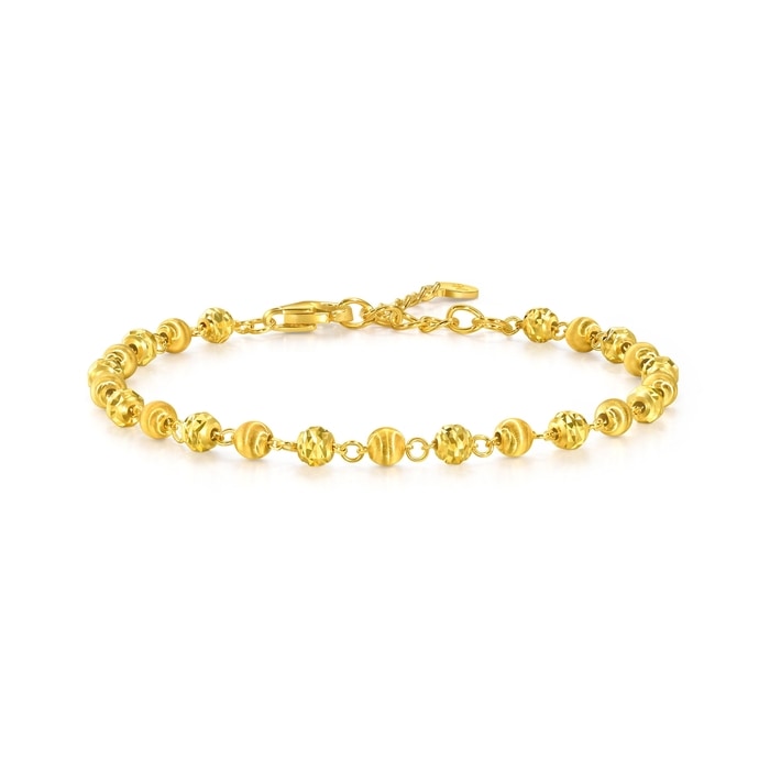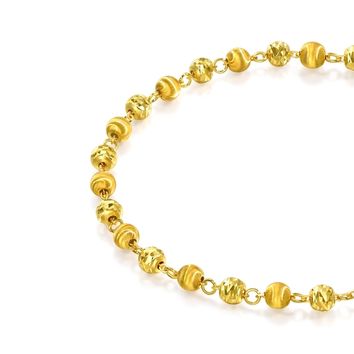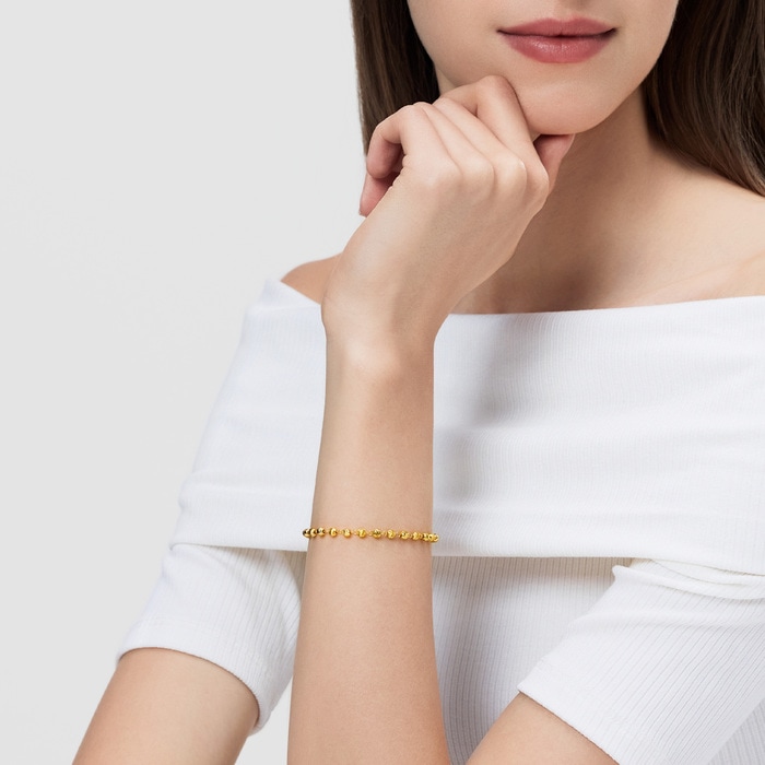 周生生以5G硬金工藝結合貓眼砂及幾何批花作表面處理,金珠可隨光線變化而折射不同的光澤,為日常穿搭增添時尚。