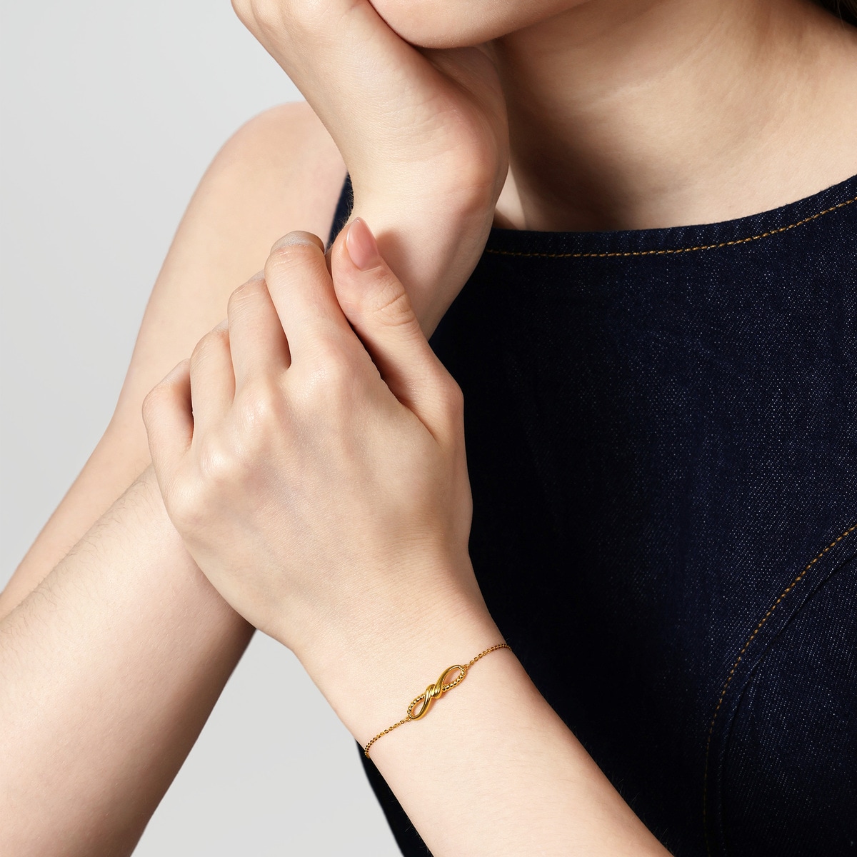 周生生追風足金手鍊,靈感源自無拘無束的風,流動且相互交疊的線條就像風的形狀。採用卓越黃金工藝,設計簡約大方,線條柔和,具有流線感。寓意擁抱自我,釋放內在的能量,讓心靈自由自在地穿梭在大自然中。
