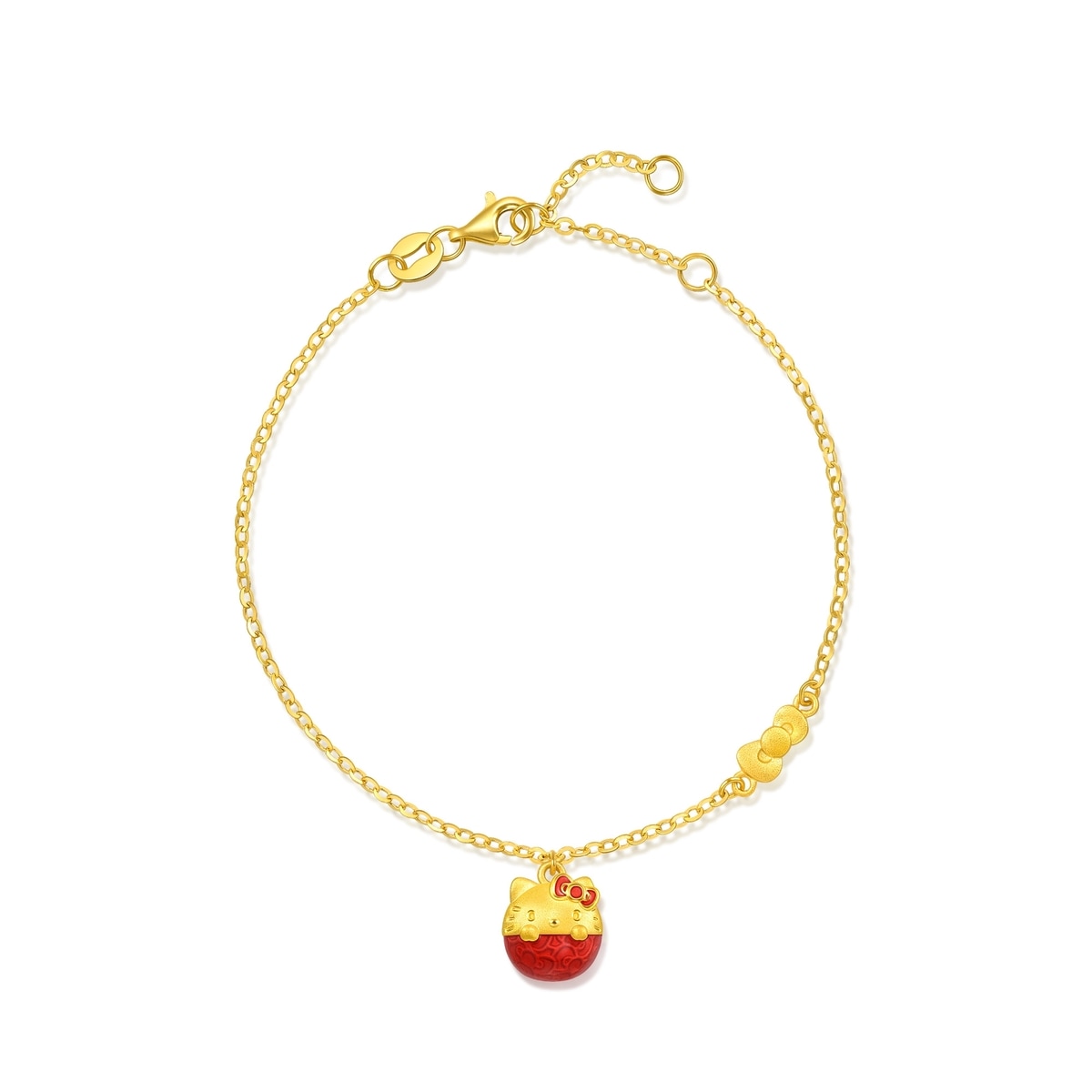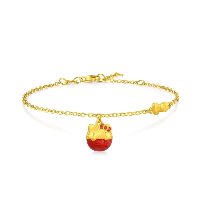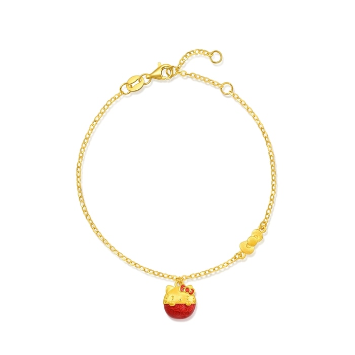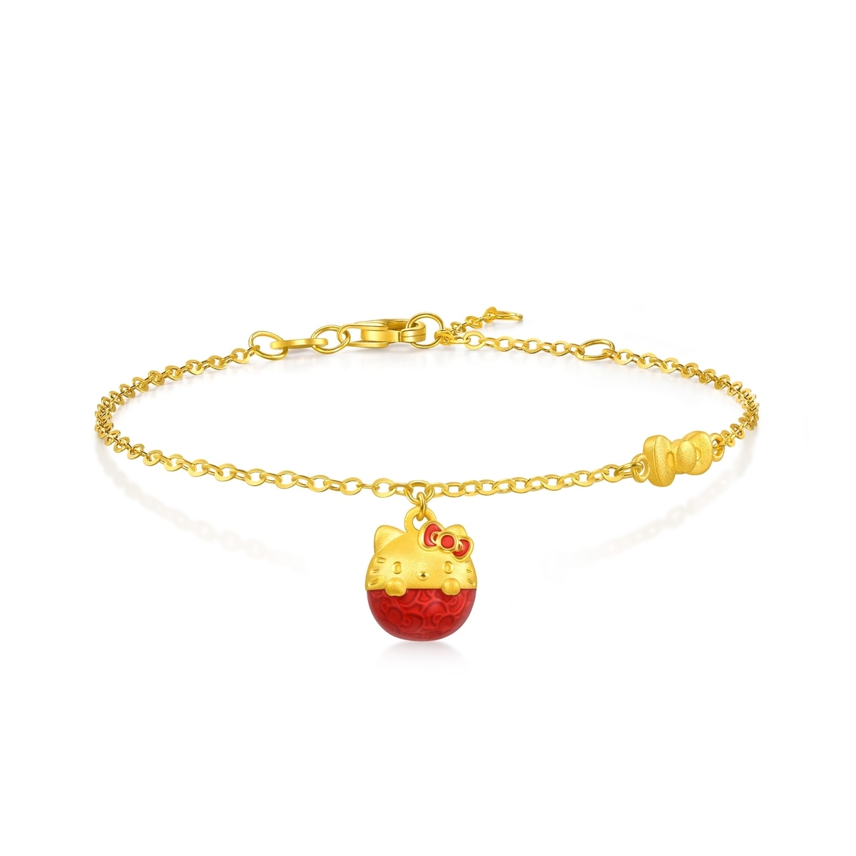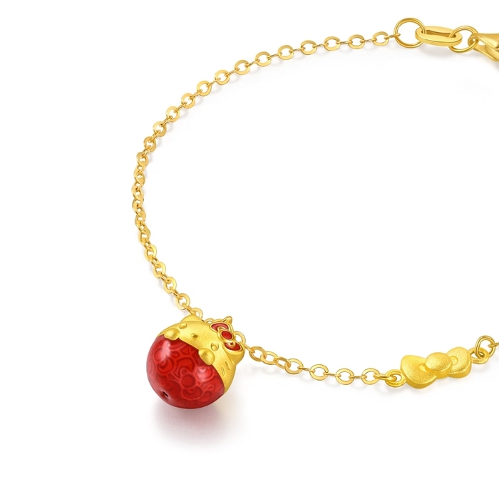周生生足金手鍊以Hello Kitty為設計元素,採用噴砂處理及卓越黃金工藝,配合透色琺瑯工藝 ,於鮮艷透亮的透明釉上呈現Hello Kitty經典蝴蝶結標誌,突顯Hello Kitty圓潤飽滿、活潑可愛的造型。