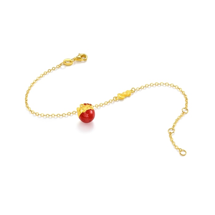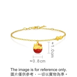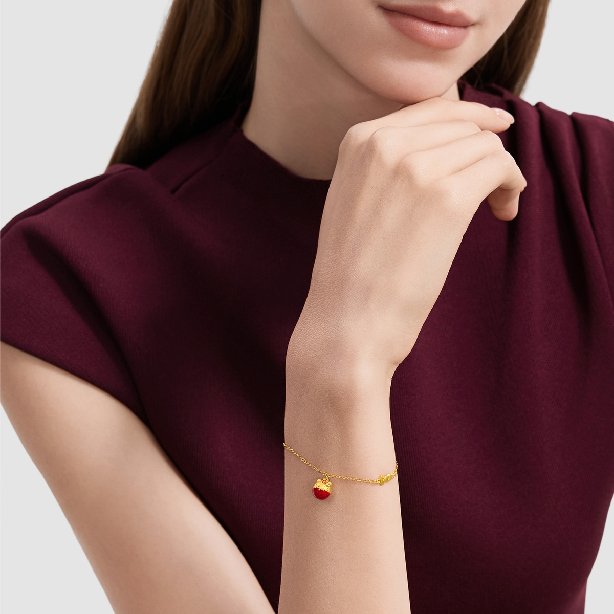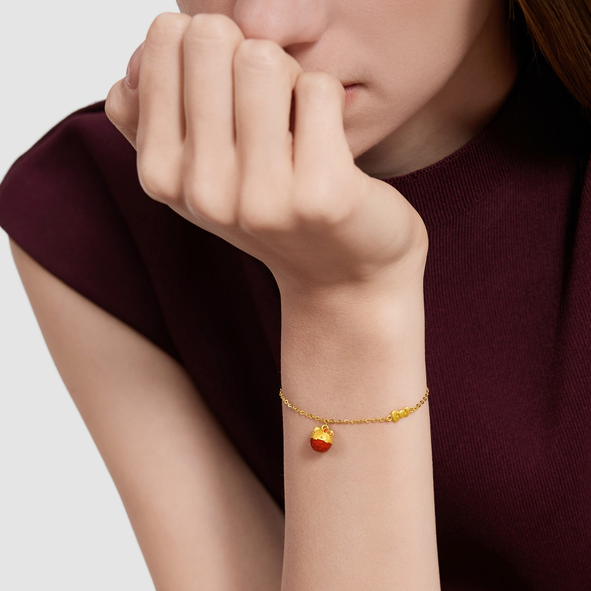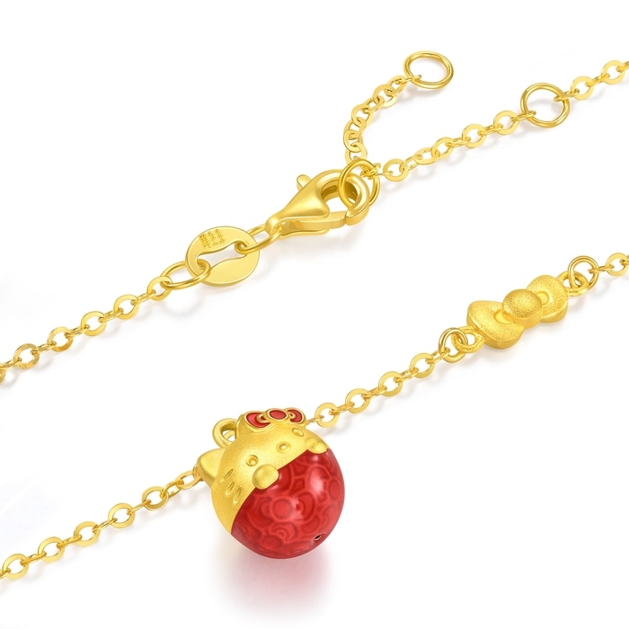 周生生足金手鍊以Hello Kitty為設計元素,採用噴砂處理及卓越黃金工藝,配合透色琺瑯工藝 ,於鮮艷透亮的透明釉上呈現Hello Kitty經典蝴蝶結標誌,突顯Hello Kitty圓潤飽滿、活潑可愛的造型。