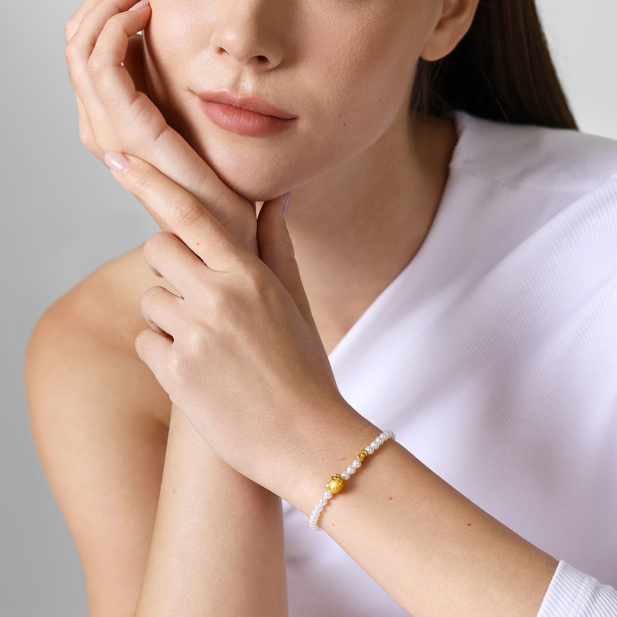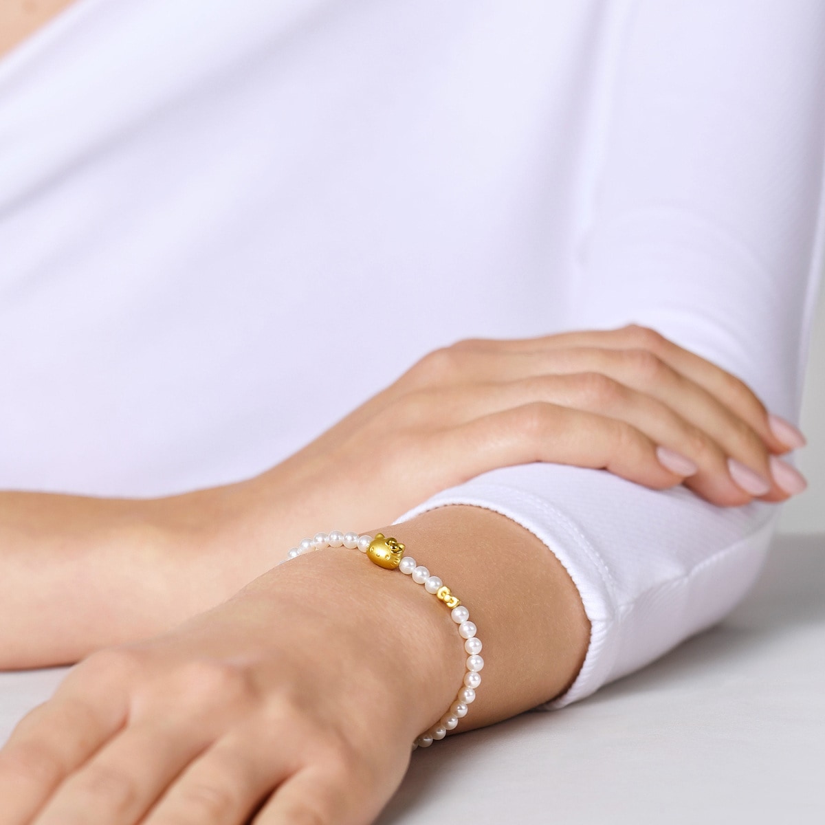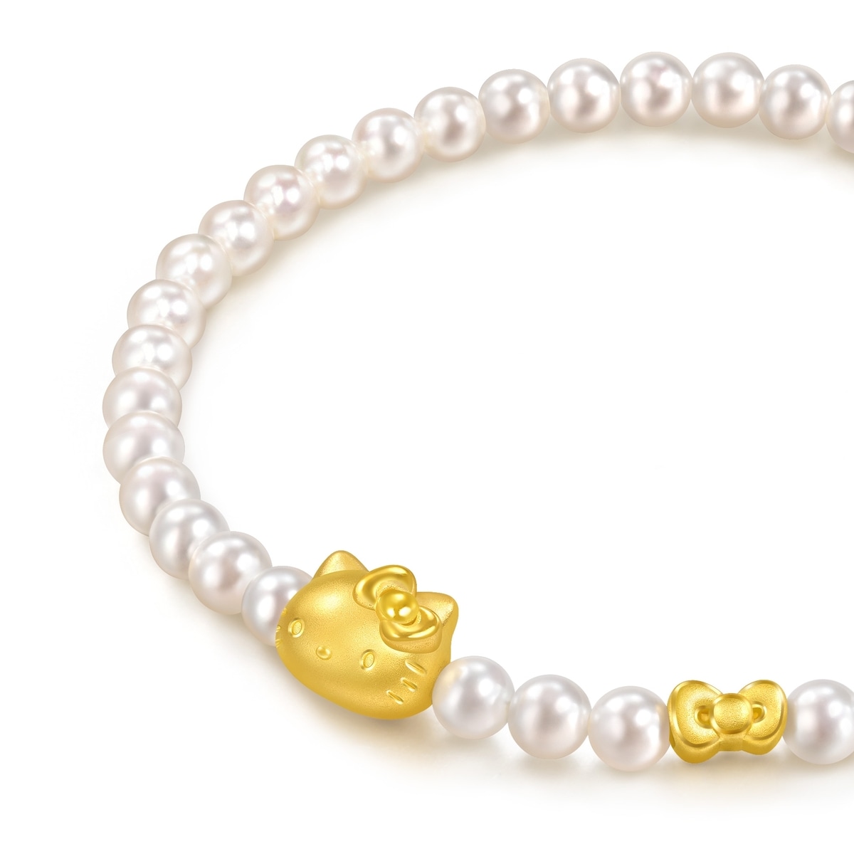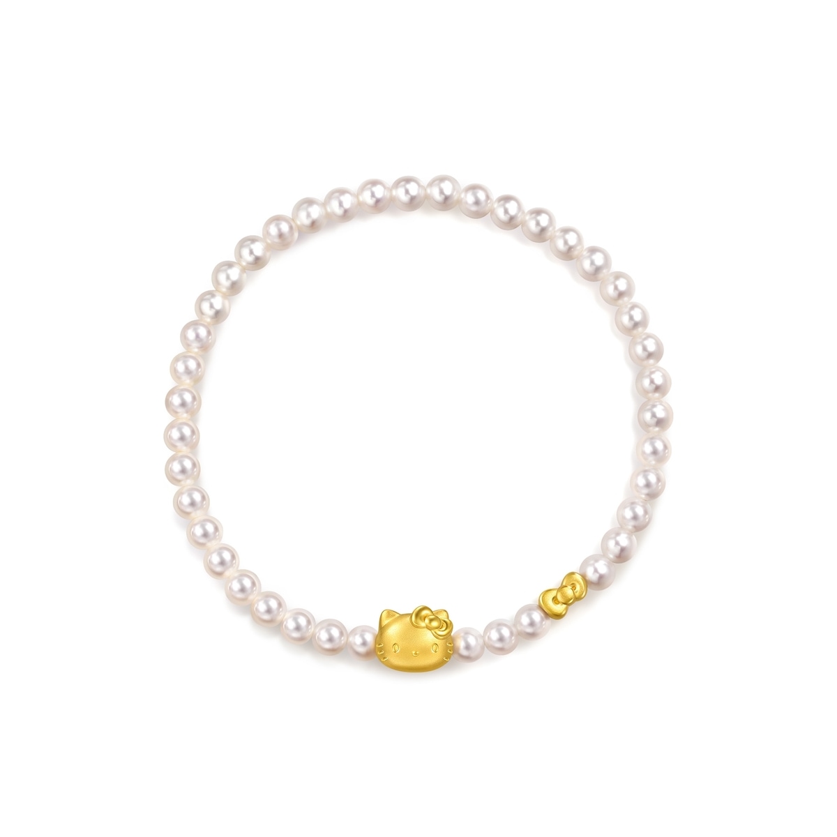 周生生足金珍珠手鍊以Hello Kitty為設計元素,採用卓越硬黃金電鑄工藝,細膩刻劃Hello Kitty的活潑造型,特別以淡水養殖珍珠配搭經典蝴蝶結串珠,風格可愛甜美,洋溢歡樂氣息。