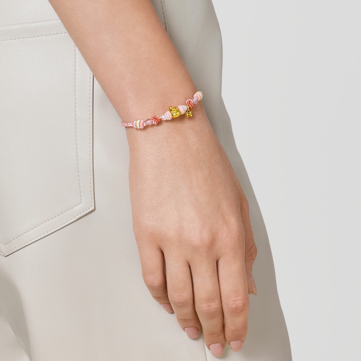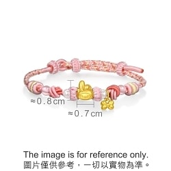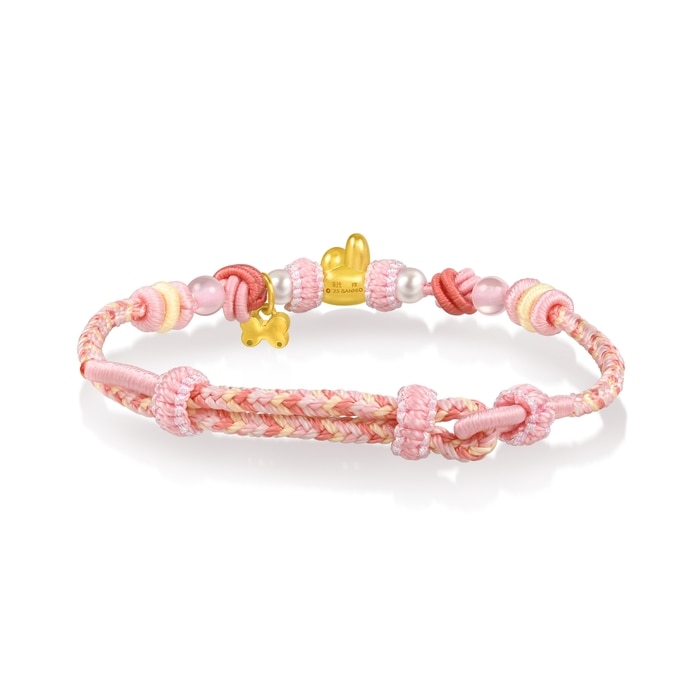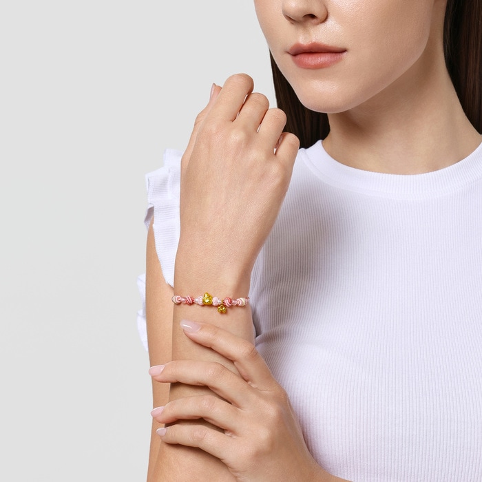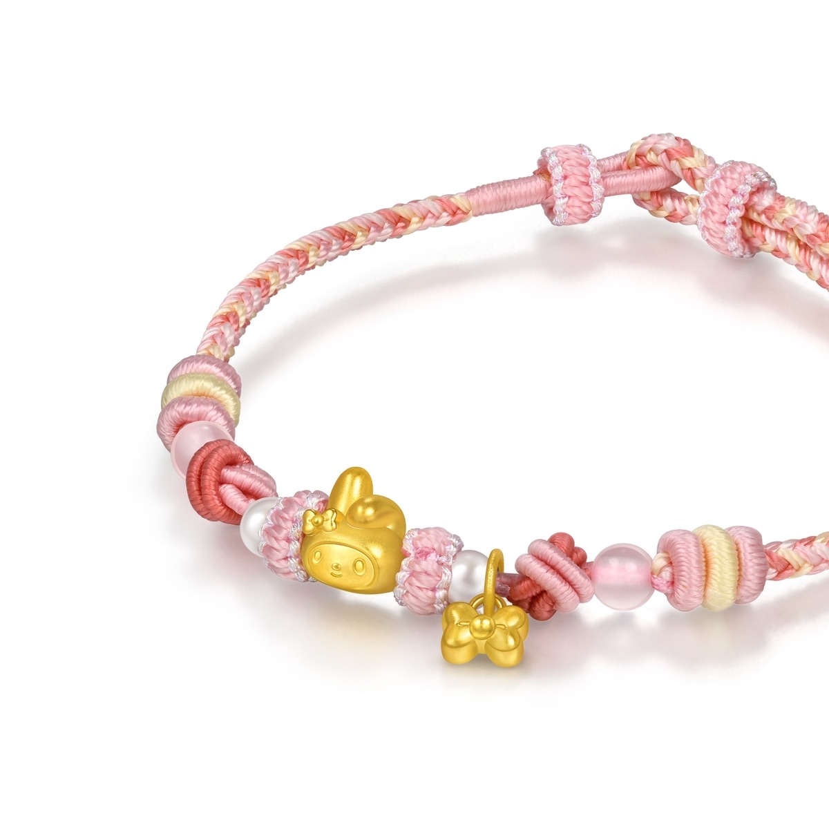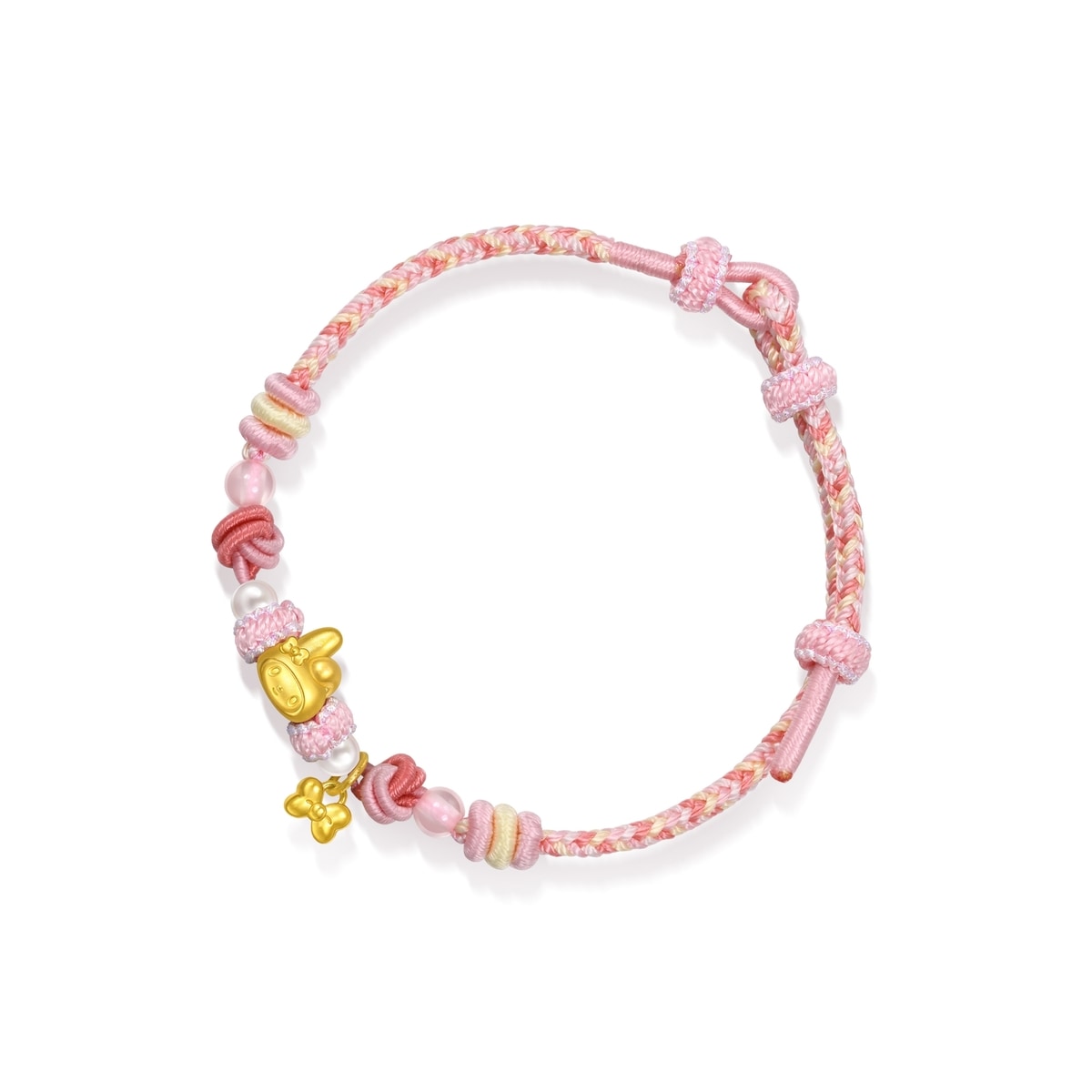 周生生足金手繩以Sanrio人氣角色My Melody為設計元素,採用卓越硬黃金電鑄工藝,迷你足金串珠精緻立體,將My Melody的開朗率真躍然眼前,結合天然珍珠、粉晶及粉紅色漸變編織手繩,配搭經典足金蝴蝶結吊飾,夢幻甜美,守護愛與幸福。