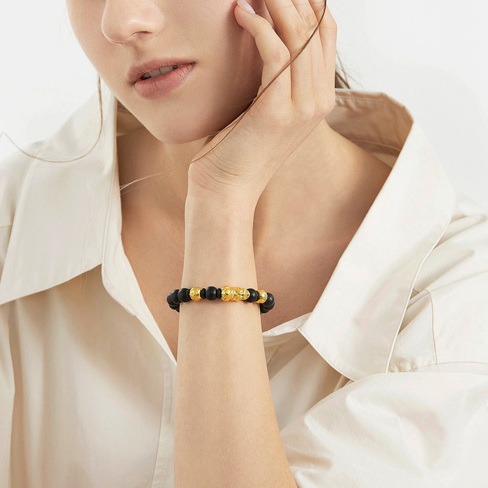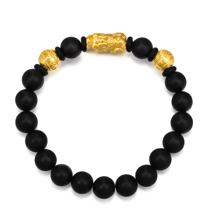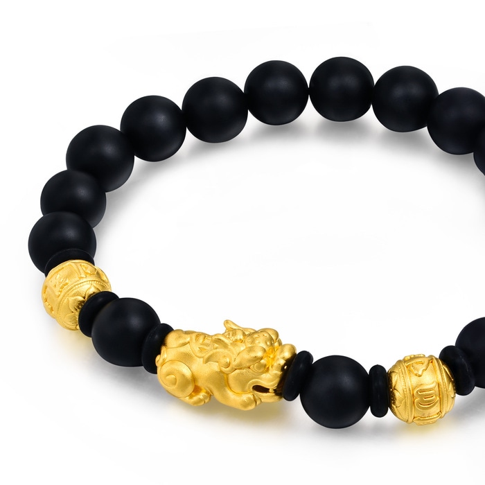 Chow Sang Sang - Wade-Giles has a fierce image carrying the power to ward off evil spirits and traditional meaning of luck and wealth. This traditional yet trendy pure gold bracelet is the best divine blessing for a promising future, enhanced by brushed texture for a matte finish on the meticulous design. With the six characters of the mantra recited by Mahayana Buddhists engraved on both sides of the beads to signify auspiciousness hovers above you to bring you peace and joy at all times, this traditional yet trendy bracelet has 19 pieces of black chalcedony that multiply the blessing power of bringing peace and positive energy.