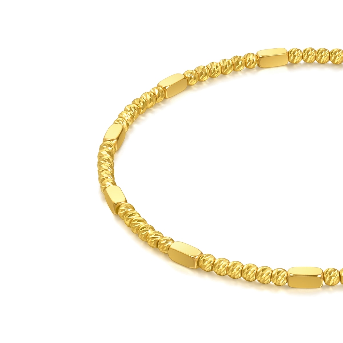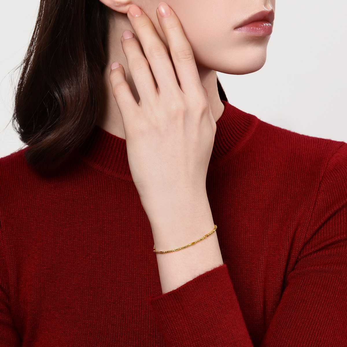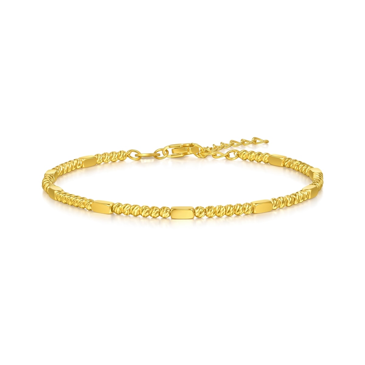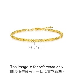 周生生足金手鍊採用卓越黃金工藝,以兩種紋理的黃金金珠相間排列,兩種質感碰撞出鮮明對比,從四面八方高度反射光線,璀璨耀眼,輕易成為時尚焦點。