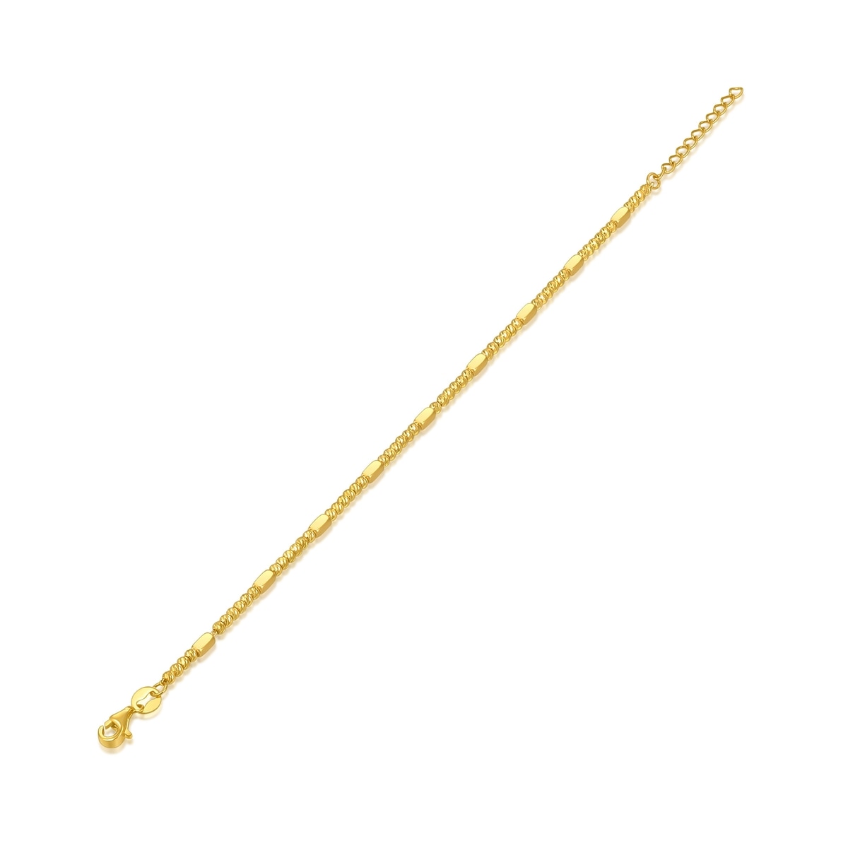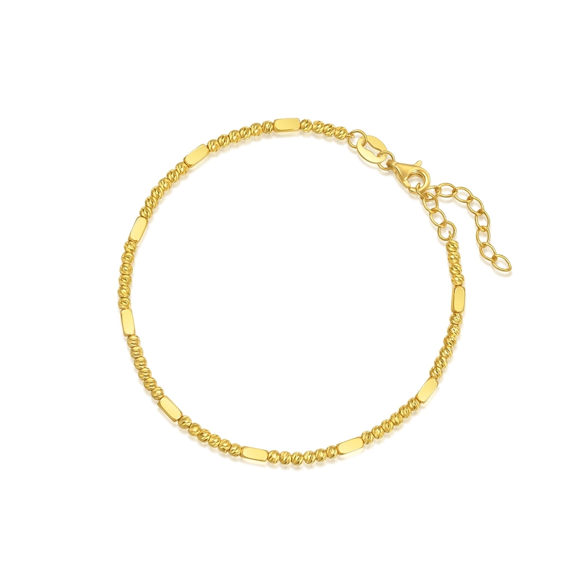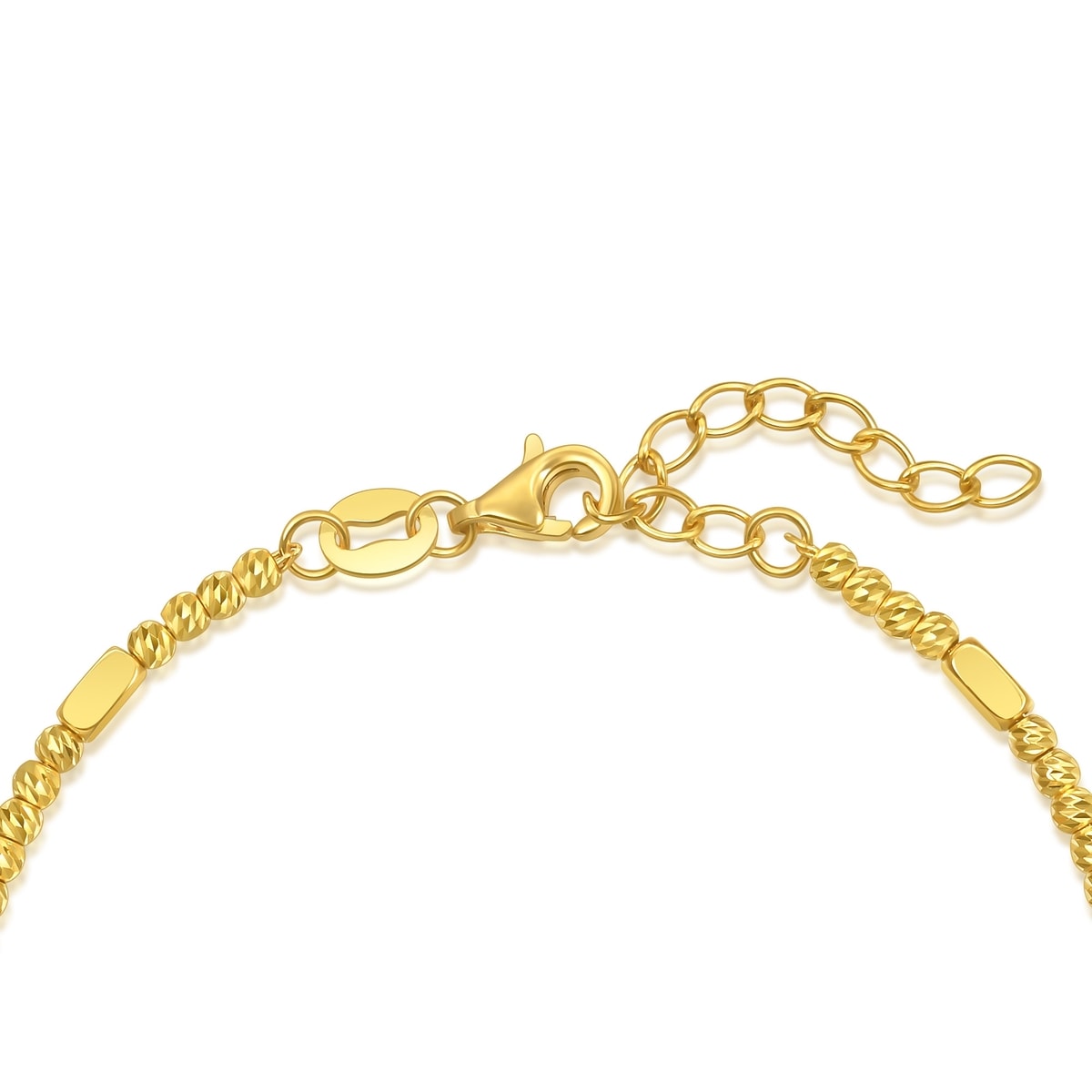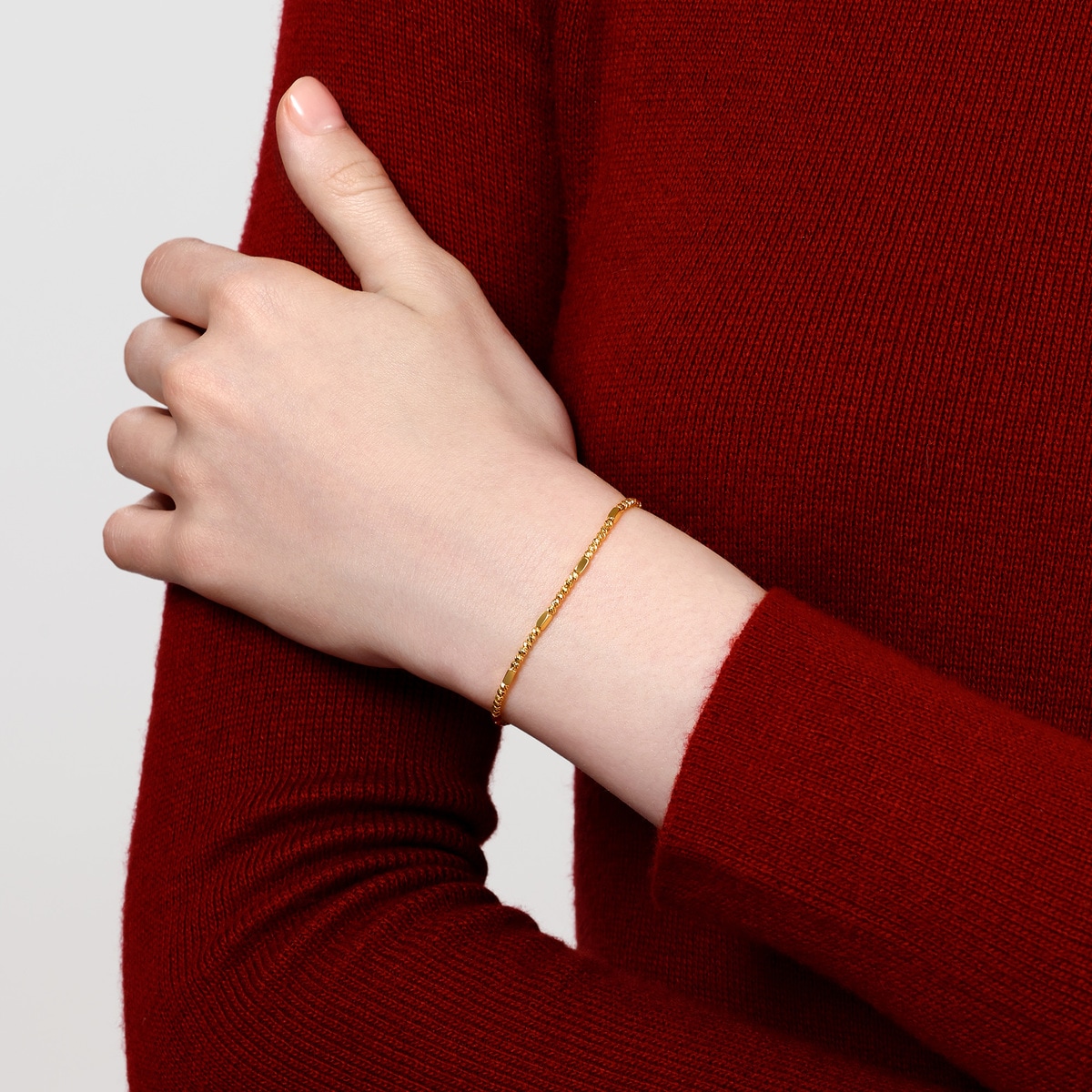 周生生足金手鍊採用卓越黃金工藝,以兩種紋理的黃金金珠相間排列,兩種質感碰撞出鮮明對比,從四面八方高度反射光線,璀璨耀眼,輕易成為時尚焦點。