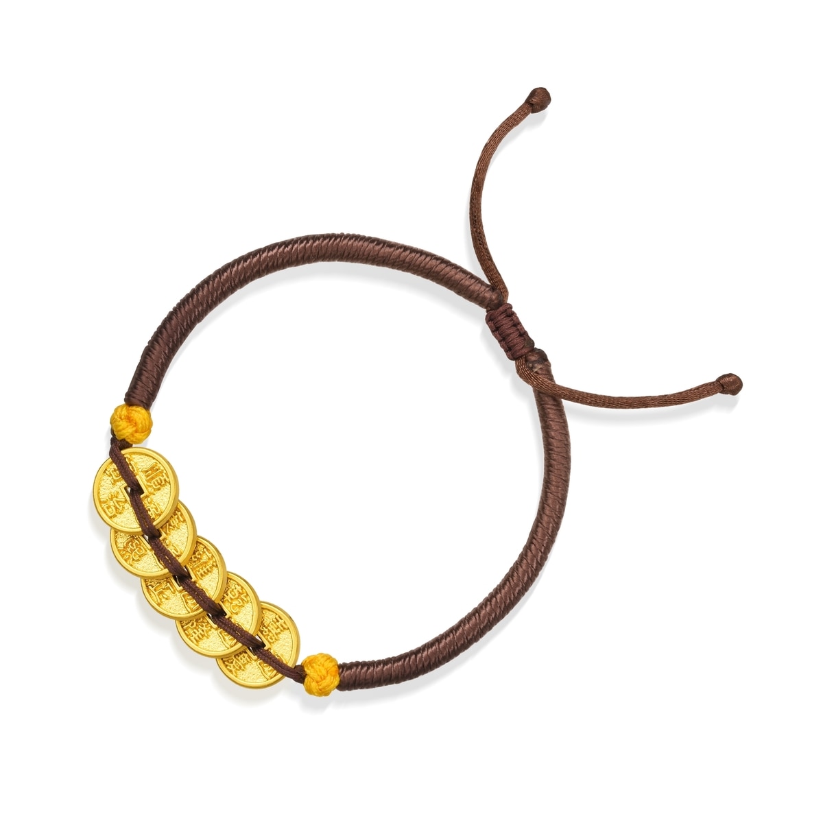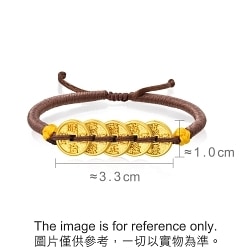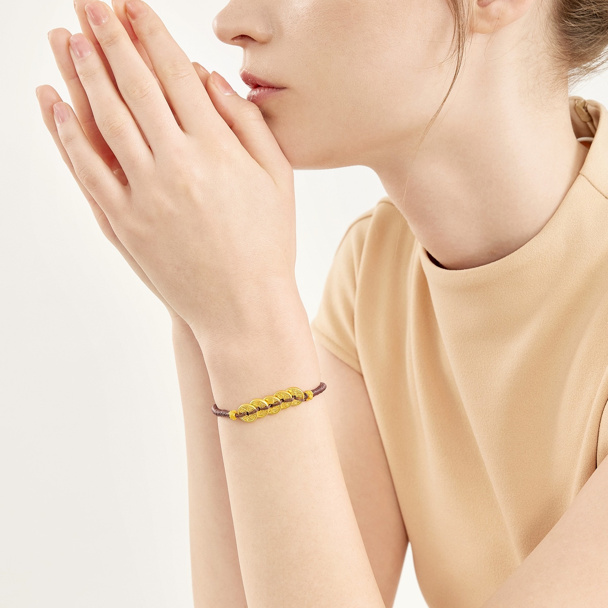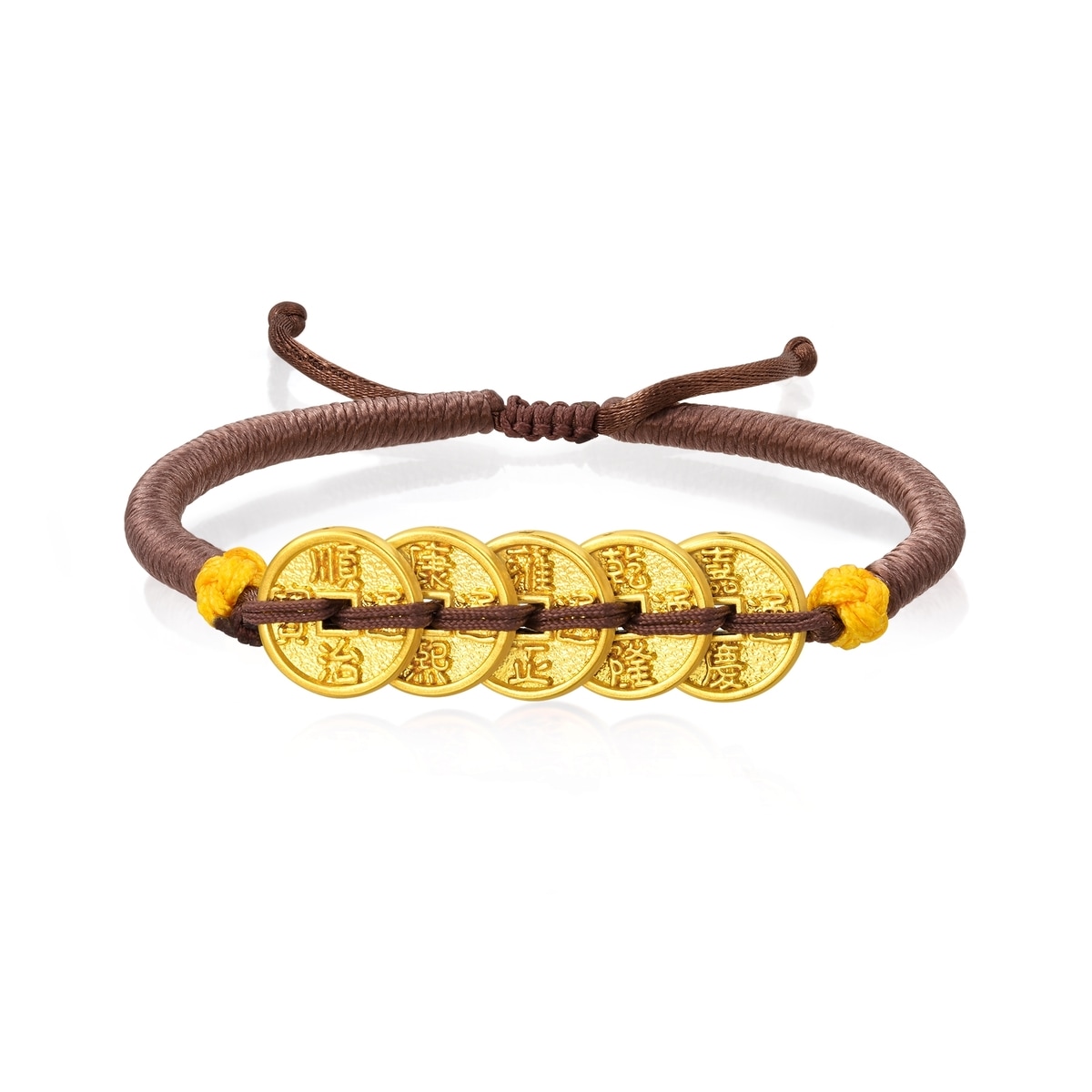 This gold bracelet features the Chinese ancient coins used in the times ruled by Shunzhi, Kangxi, Yongzheng, Qianlong and Jiaqing Emperor. Believed to have a power of seeking luck and avoiding calamity, it brings ample blessings to the wearer.