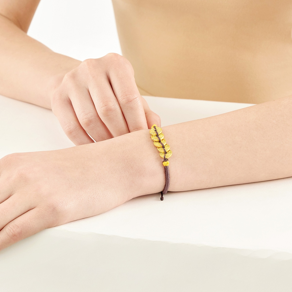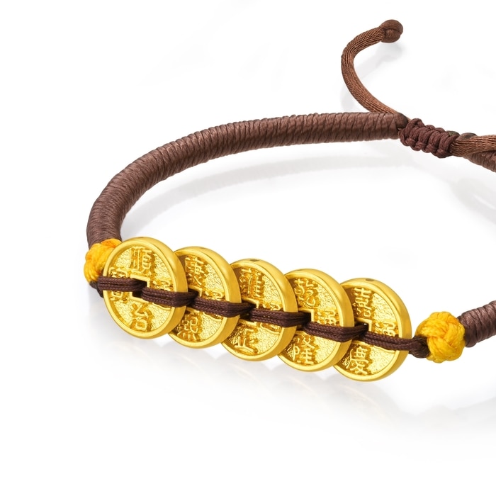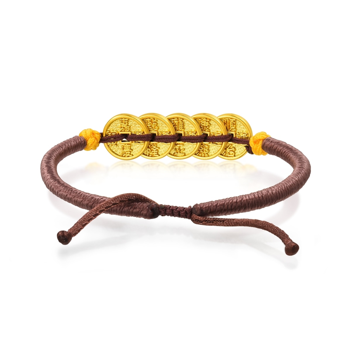This gold bracelet features the Chinese ancient coins used in the times ruled by Shunzhi, Kangxi, Yongzheng, Qianlong and Jiaqing Emperor. Believed to have a power of seeking luck and avoiding calamity, it brings ample blessings to the wearer.