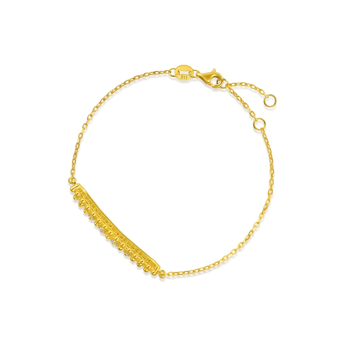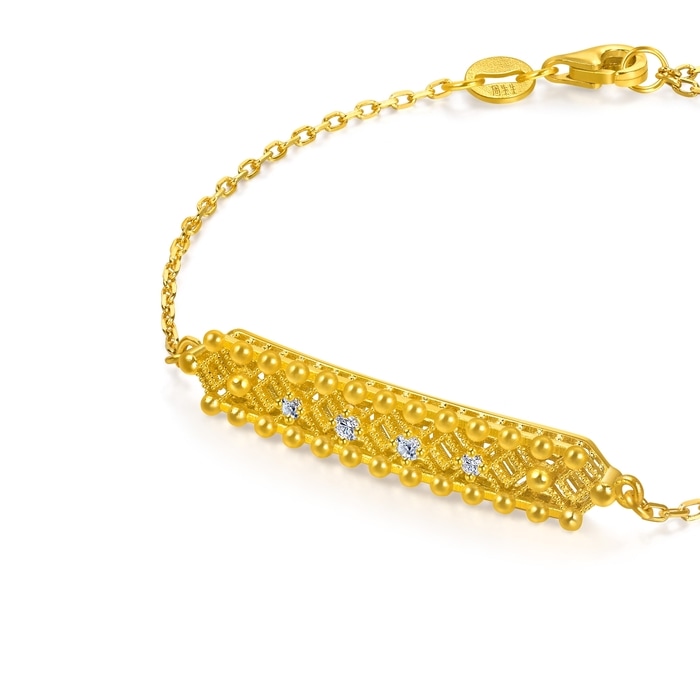 周生生足金鑽石方勝紋手鏈結合3D打印技術和卓越硬黃金等工藝打造,配合工匠人手打磨,更綴以閃耀美鑽。鏤空連續的方勝紋,有同心相通之意,寓意吉祥如意、成功勝利。