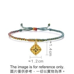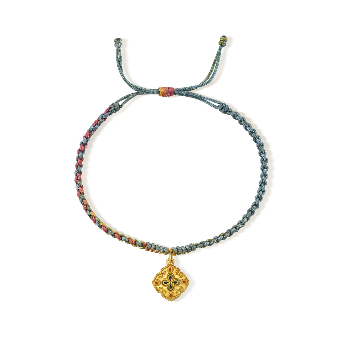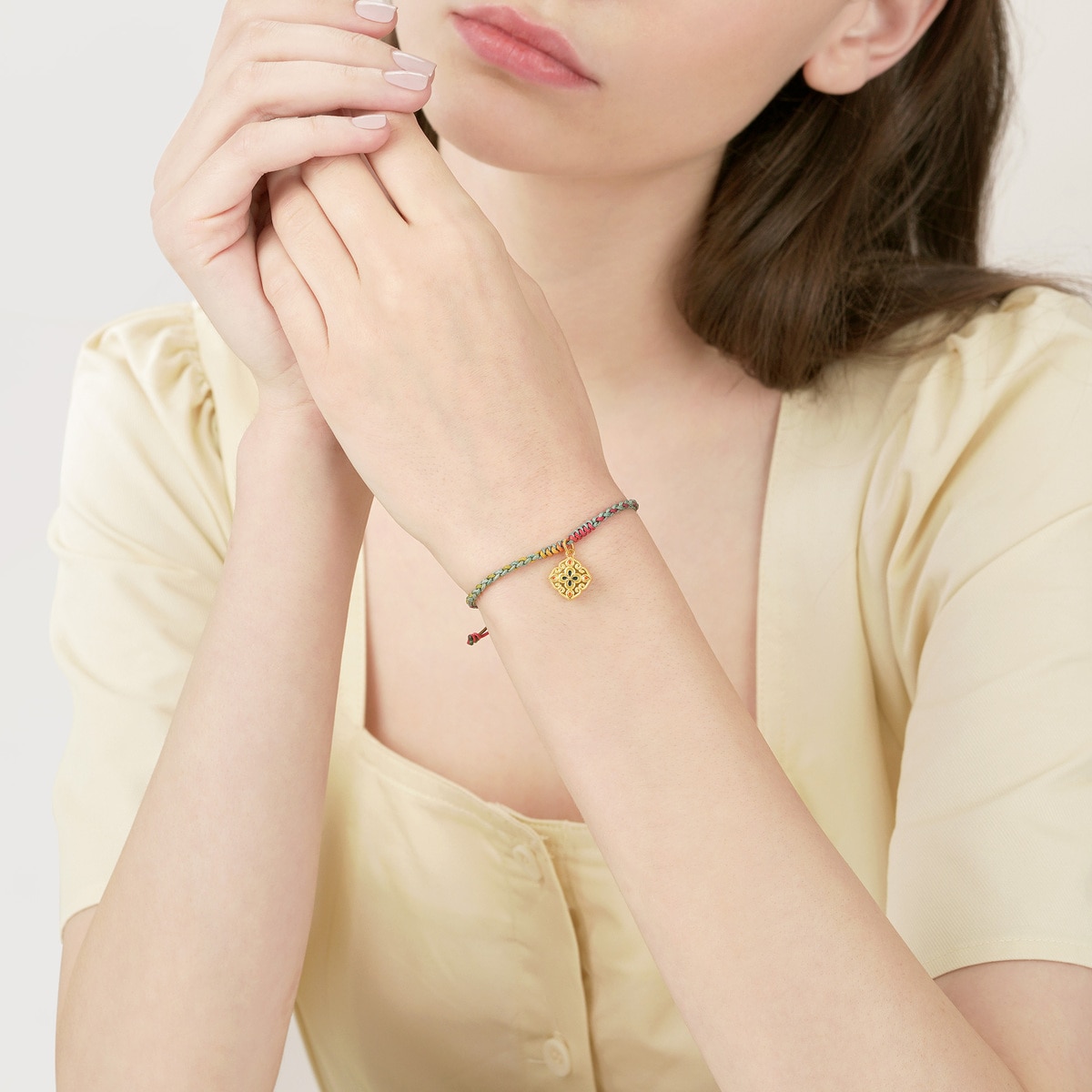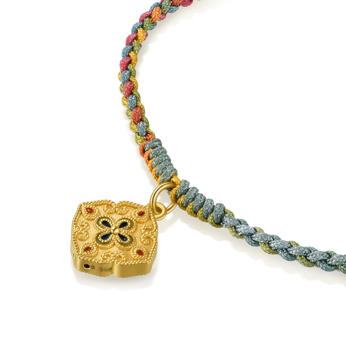 周生生足金四方如意手繩,以「國潮風」為創作元素,融合傳統中國文化及潮流時尚風格,採用低溫琺瑯彩繪圖層及細膩珠邊工藝,拼湊出繽紛奪目色彩及豐富立體感,四方如意造型搭配可調整的五彩繩,寓意「萬事如意、平安吉祥」,為佩戴者帶來美好祝福。