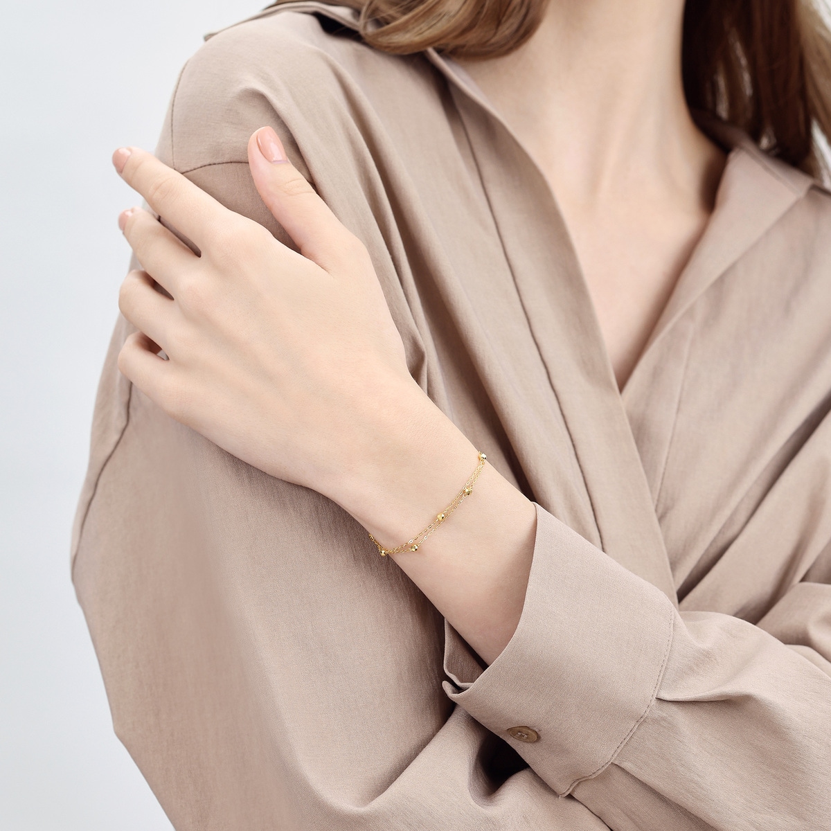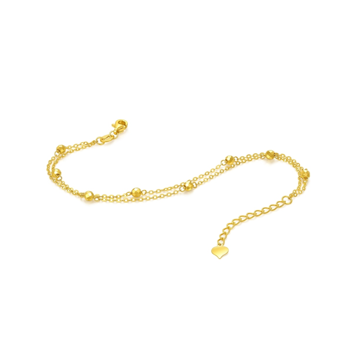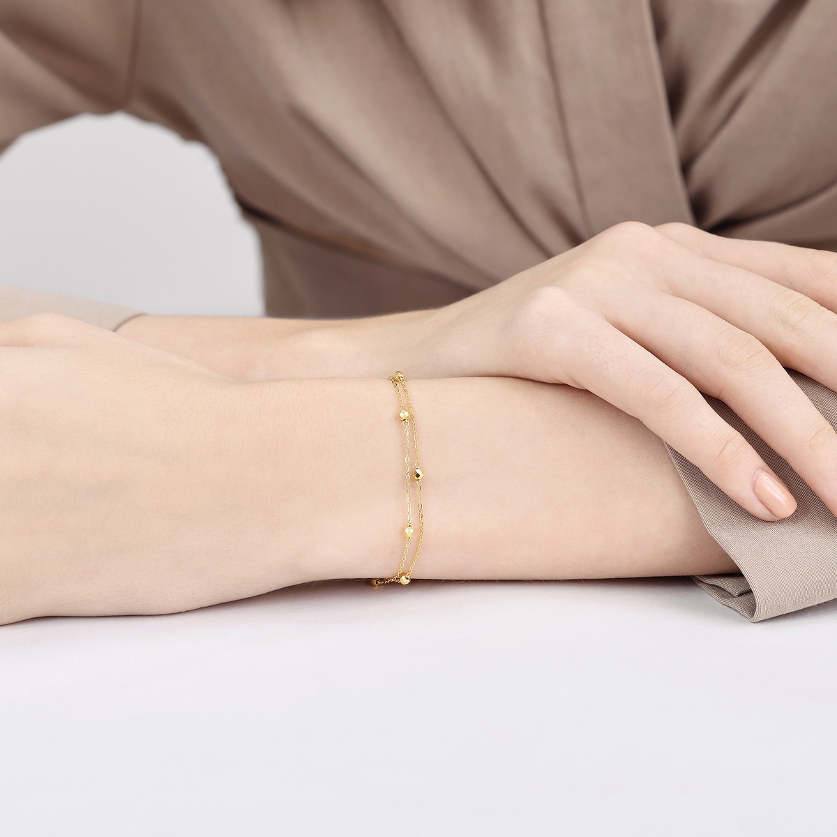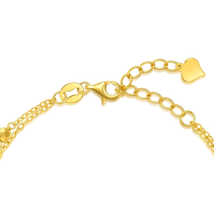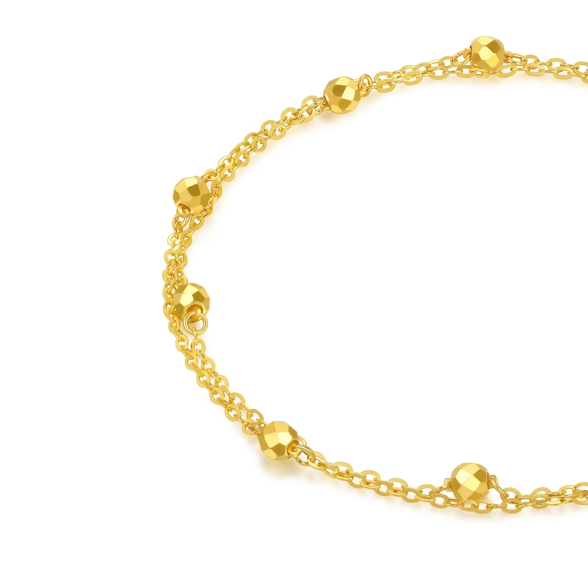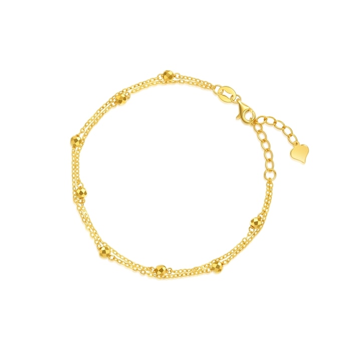 周生生足金手鍊採用創新5G多元黃金工藝提升黃金硬度,以雙鍊設計結合車花金圓珠,營造出層次豐富的疊戴效果,靈動優雅,為日常風格注入時尚魅力。