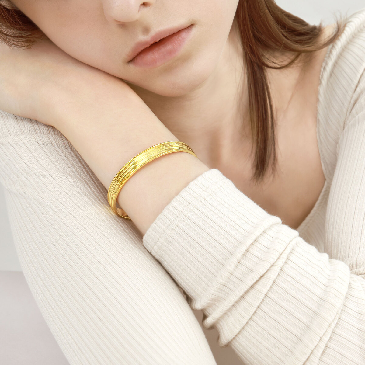 周生生足金實心手鐲採用創新5G黃金技術,令黃金硬度大大提升,配以多元黃金工藝,打造出更精緻的足金飾品。手鐲以魚尾圖案為元素,造型立體、層次豐富,呈現炫目時尚切面,打造出高光鏡面效果,從不同角度反照出耀眼光芒。飾品將先進工藝注入潮流美學,成為黃金飾品的時尚新寵。