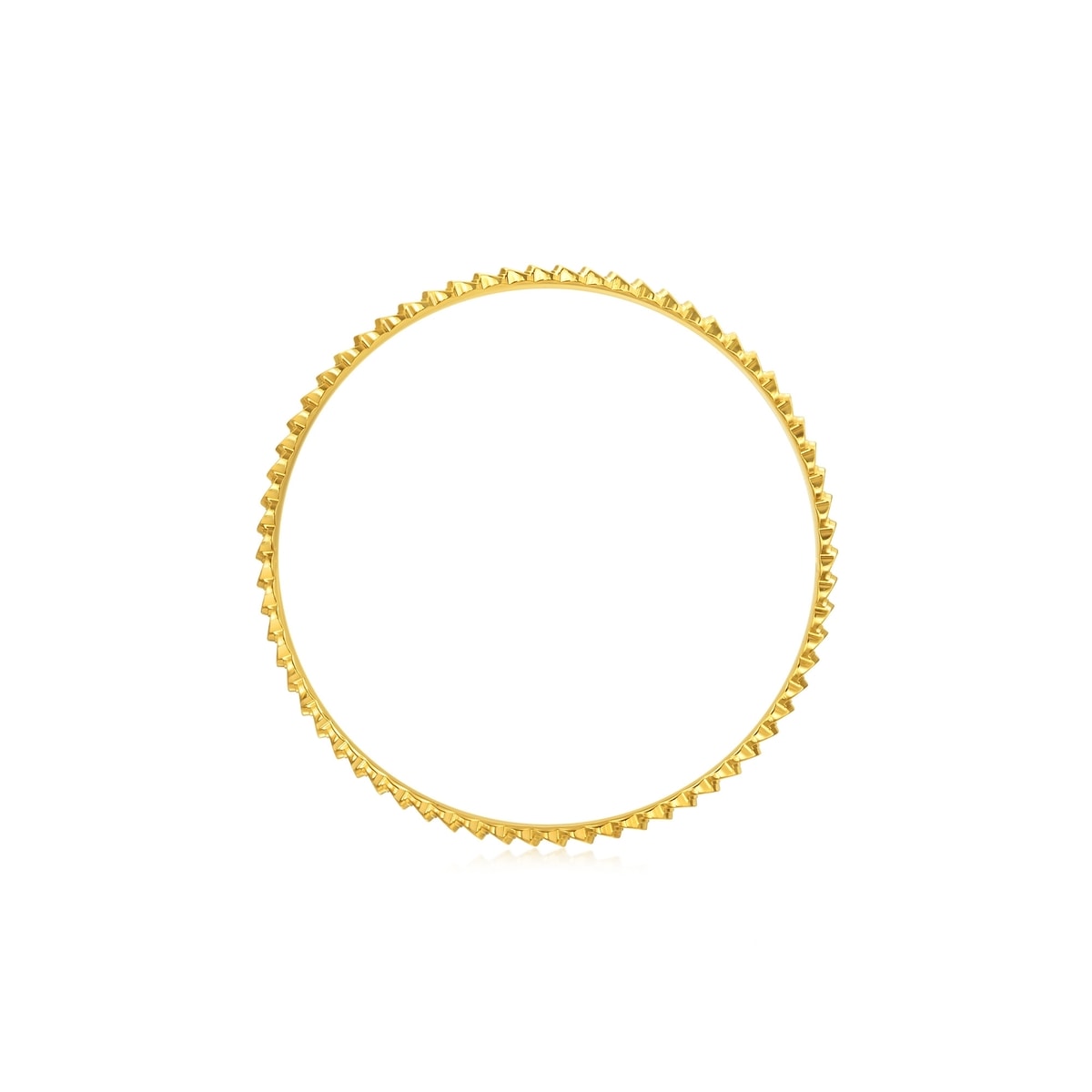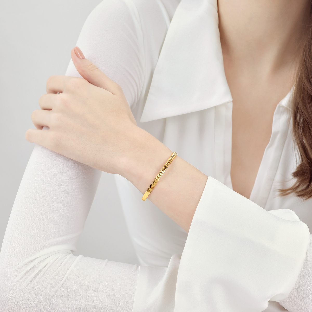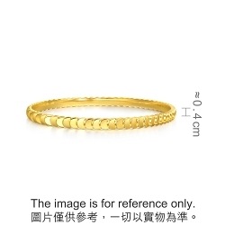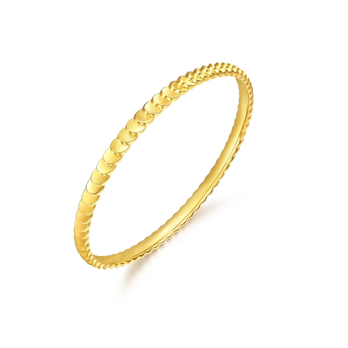 周生生足金手鐲採用創新5G多元黃金工藝提升黃金硬度。手鐲以鱗片造型疊搭出立體層次,彰顯細膩質感,呈現炫目時尚切面,打造出高光鏡面效果,從不同角度反照出耀眼光芒,為日常造型注入時尚氣息。