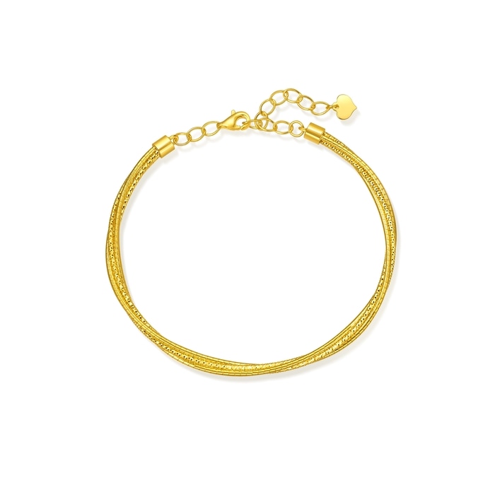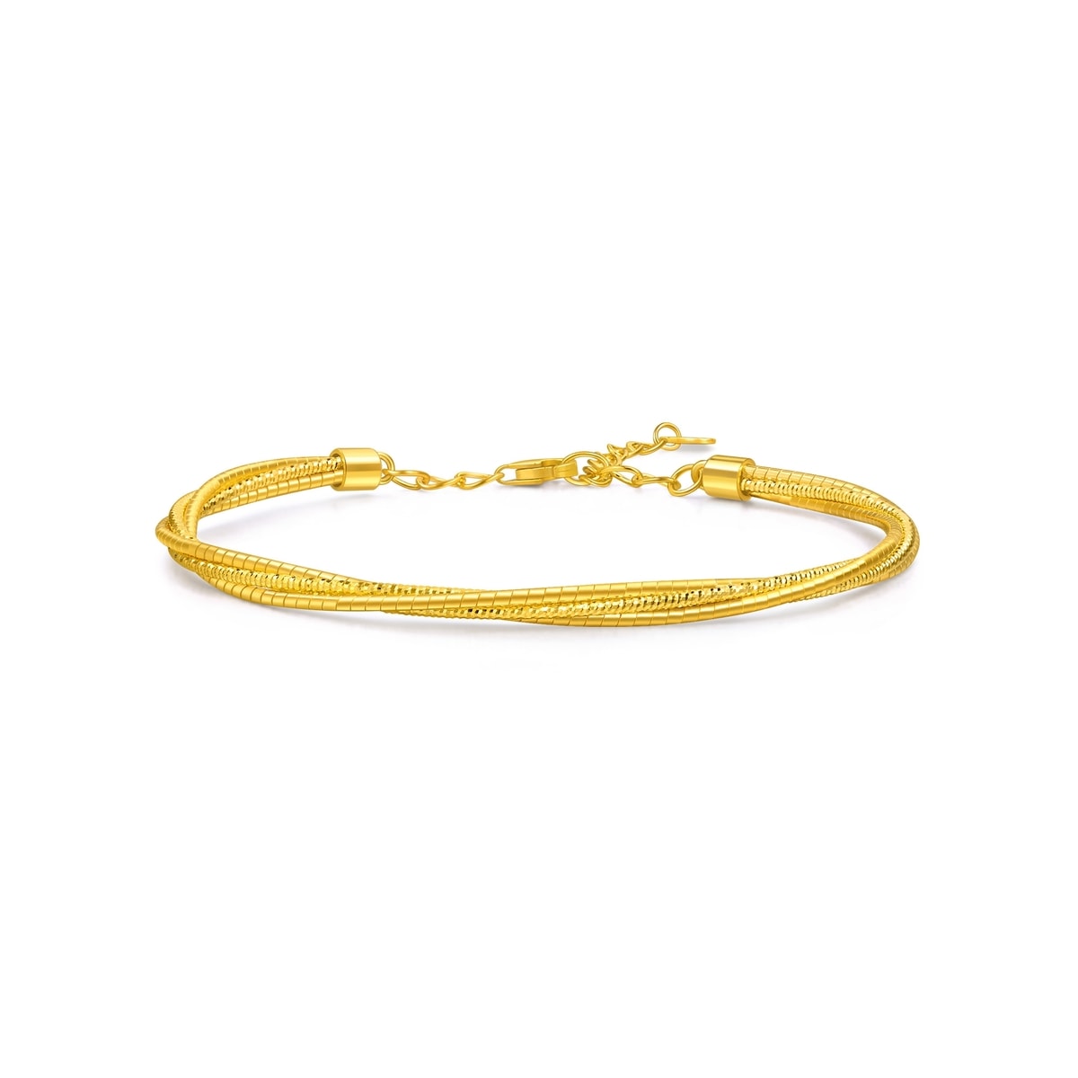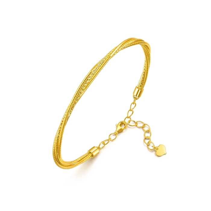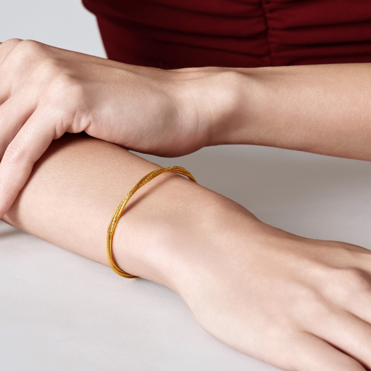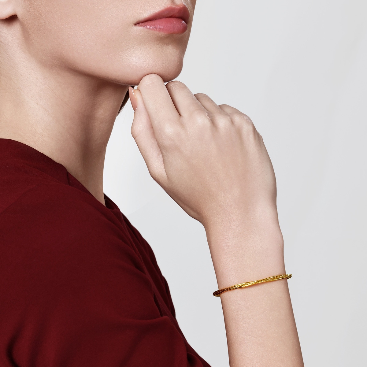 周生生足金手鐲採用卓越黃金工藝,於黃金表面呈現獨特質感,紋理相互交織,營造出動感線條,造型立體精緻,為日常造型注入時尚風格。