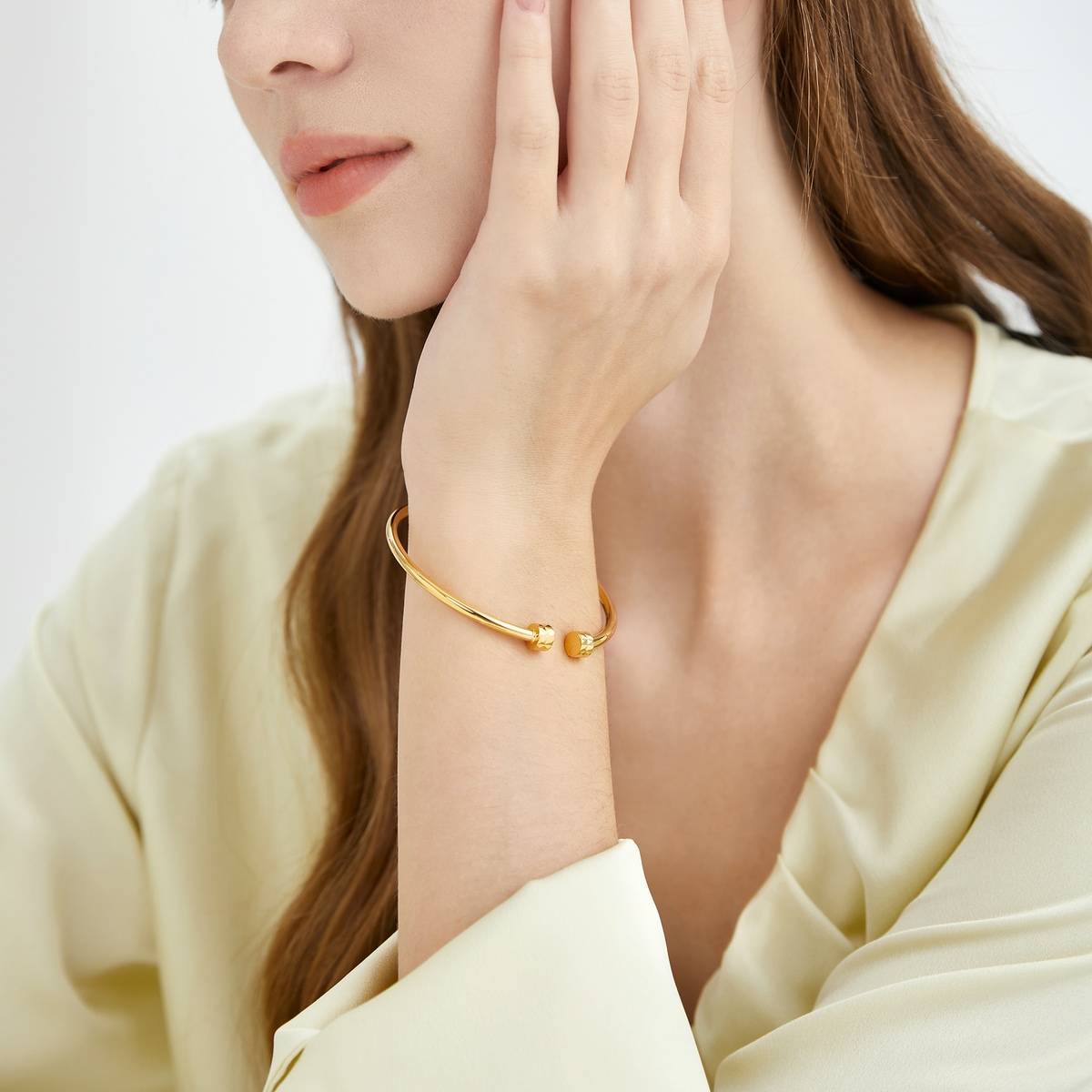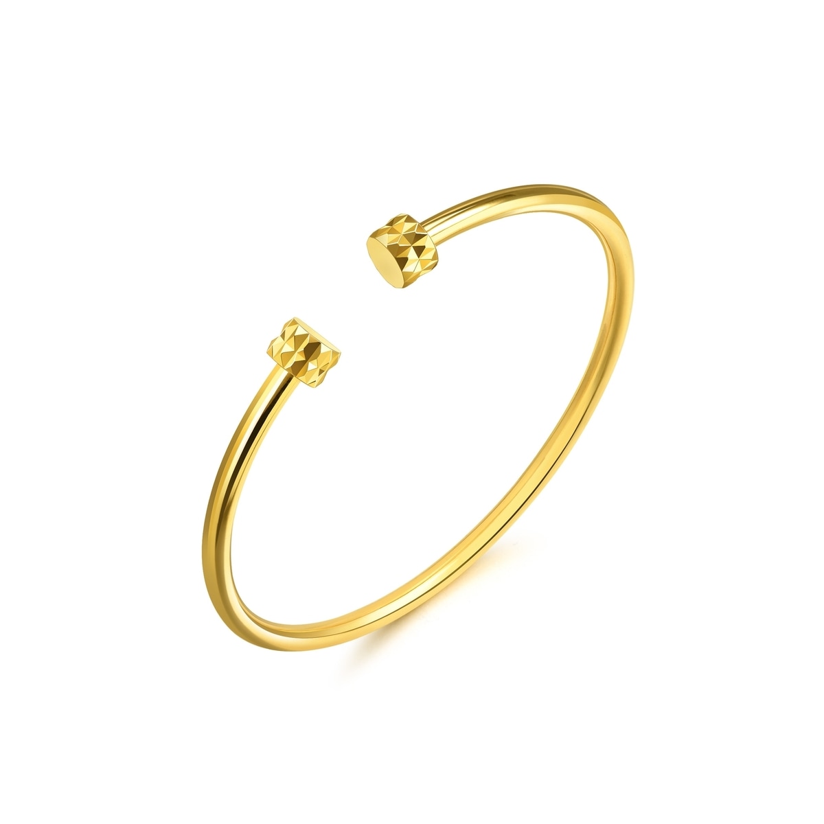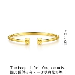 周生生足金手鐲採用創新5G黃金技術,令黃金硬度大大提升,配以多元黃金工藝,打造出更精緻的足金飾品。手鐲採用摩登前衛的開環設計,綴以立體窩釘飾紋,將優雅時尚風格融入日常配搭。