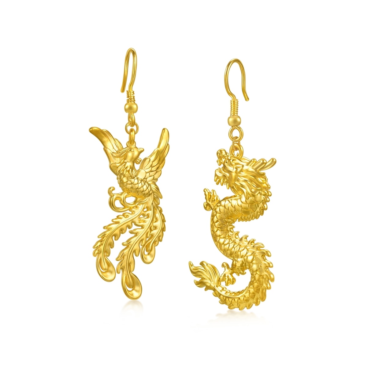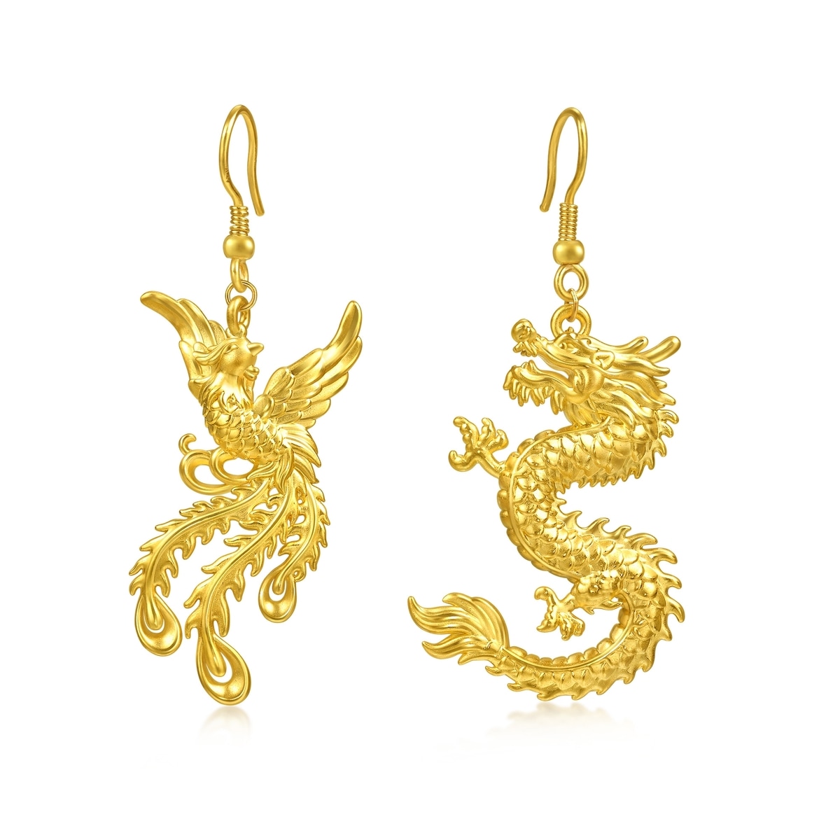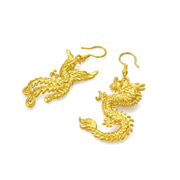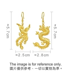 周生生足金龍鳳耳環套裝以卓越硬黃金電鑄工藝打造,浮雕效果細膩呈現龍鳳立體造型,線條流暢,栩栩如生,華貴大氣,祝願新人「龍鳳呈祥、百年好合」。