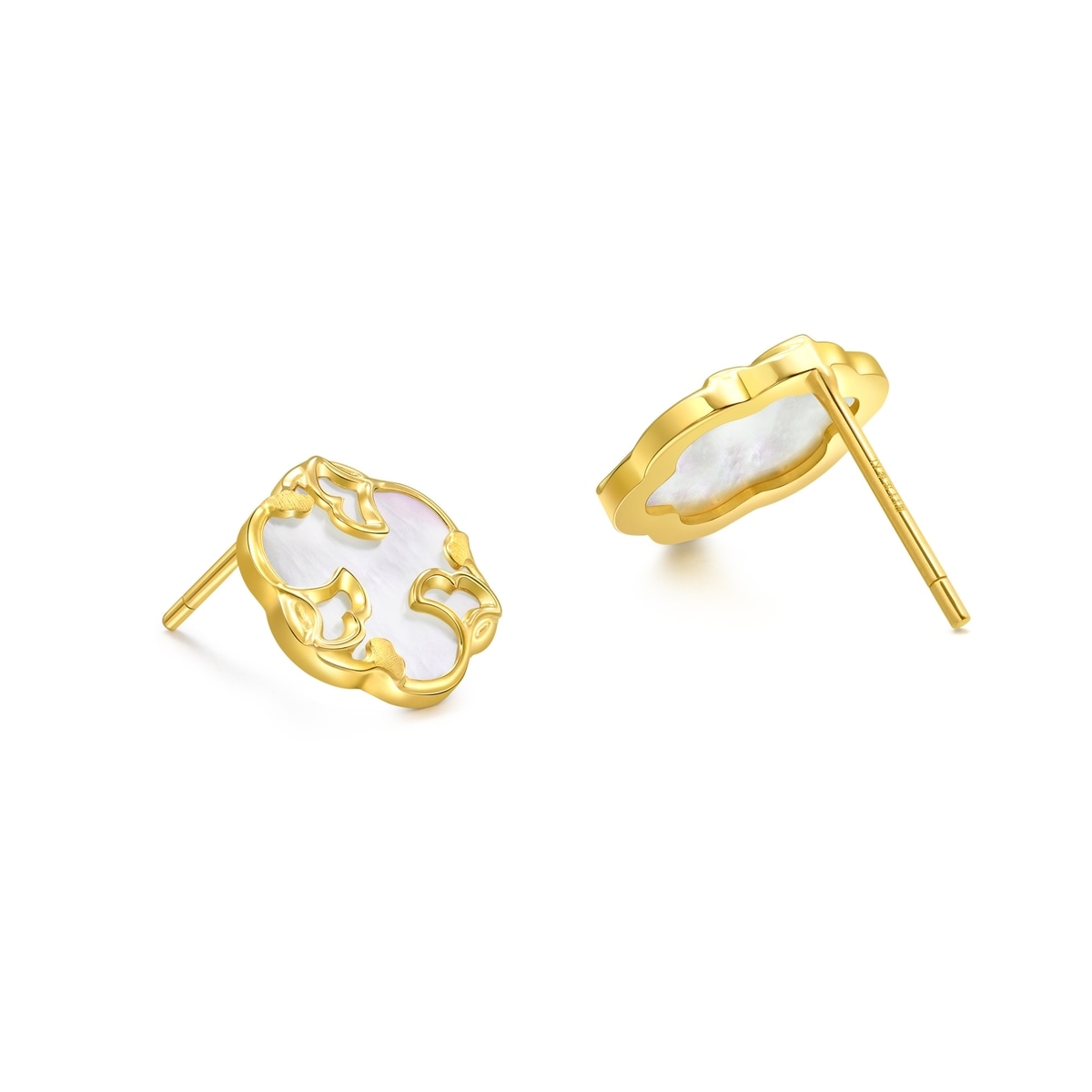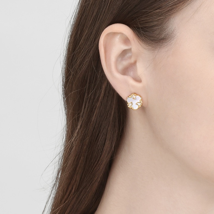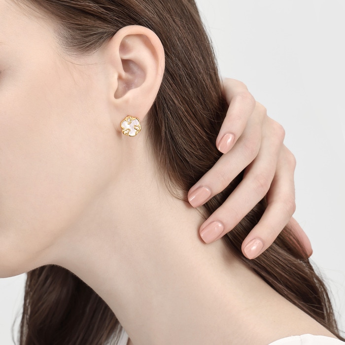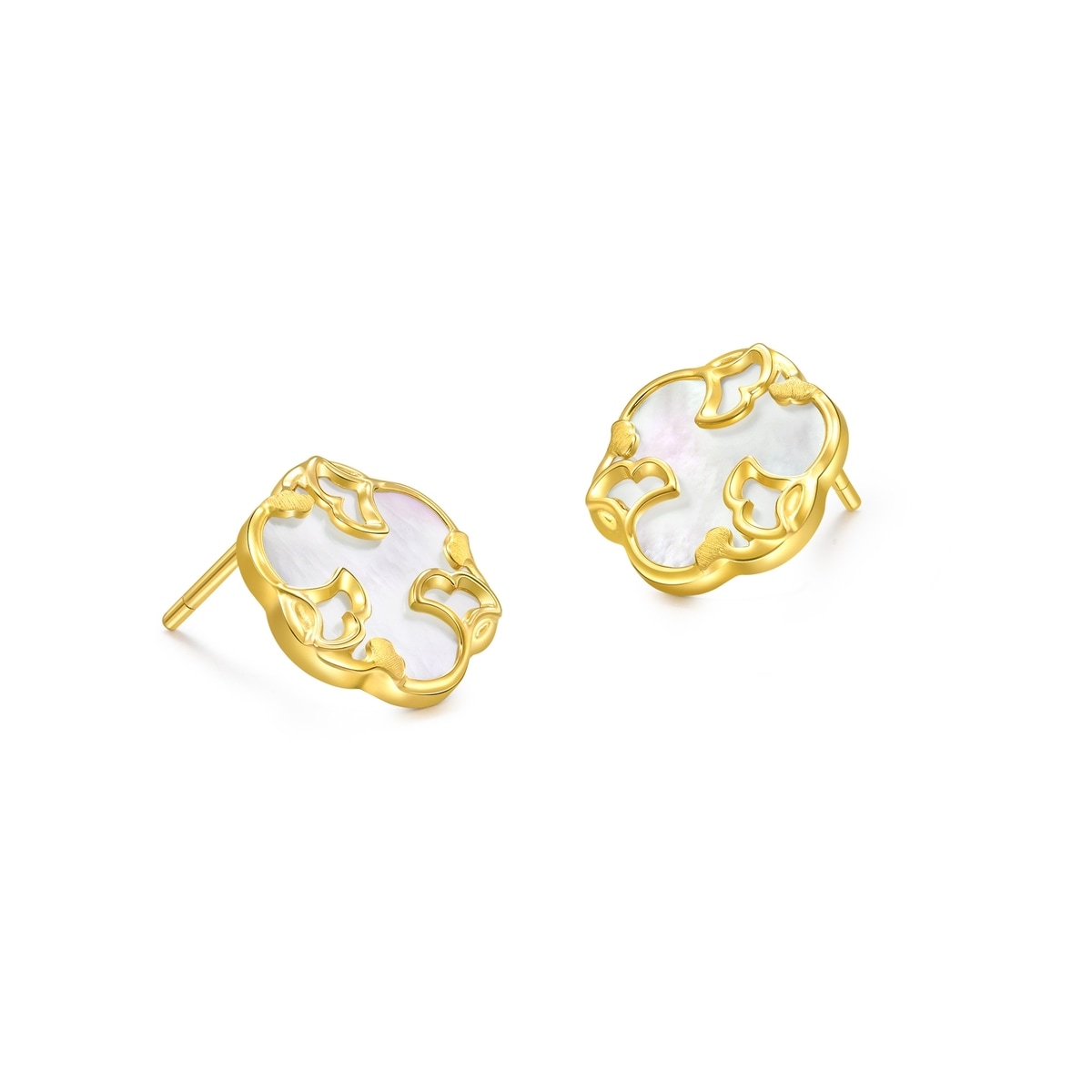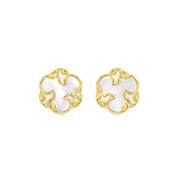 周生生足金耳環靈感源自「銀杏葉」,以卓越黃金工藝,勾勒出葉子的優雅線條,結合天然貝母的輕柔色澤,呈現前所未有的精緻質感。「銀杏葉」蘊含為愛守護一生的幸福寓意,更代表和諧、長壽,為佩戴者帶來滿滿祝福。