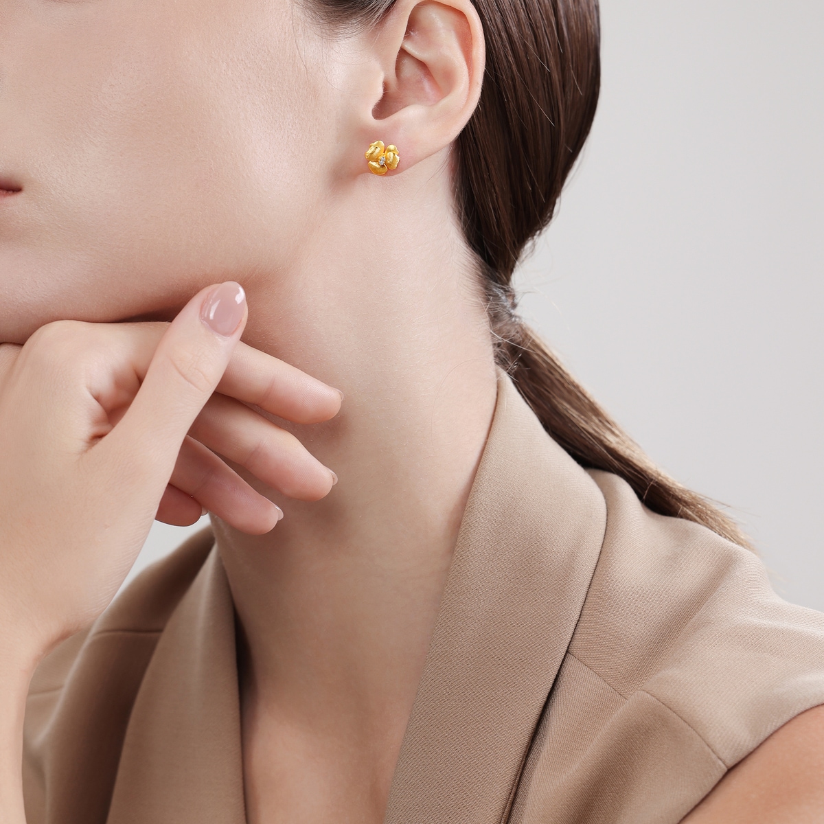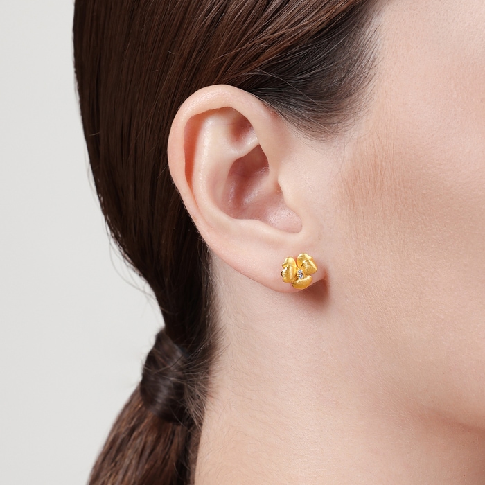 周生生足金耳環以三色堇為設計靈感,結合卓越黃金工藝,巧以美鑽化作花蕊,結合精緻勾絲工藝刻劃出花瓣紋理,造型逼真細緻、高貴典雅,藉著三色堇的花語「請思念我,讓我們交往」,送上真摯表白。