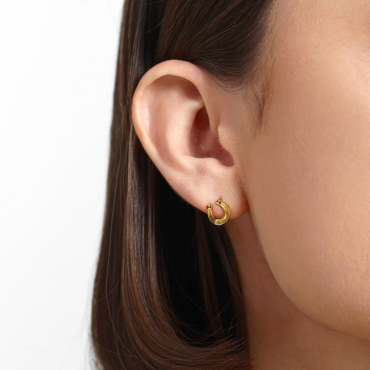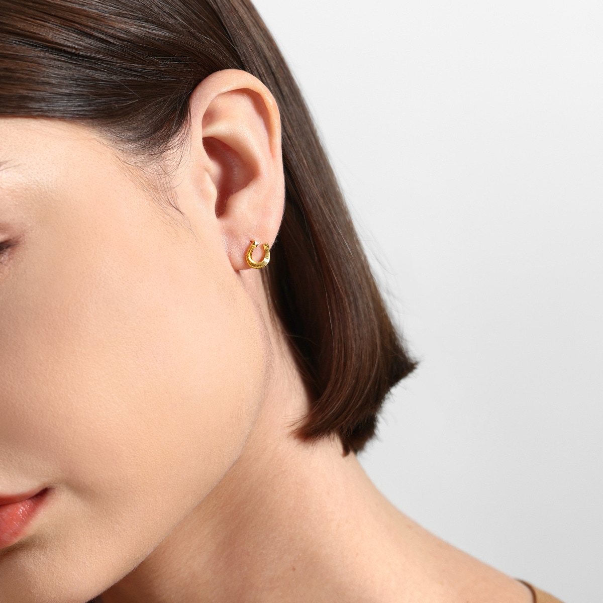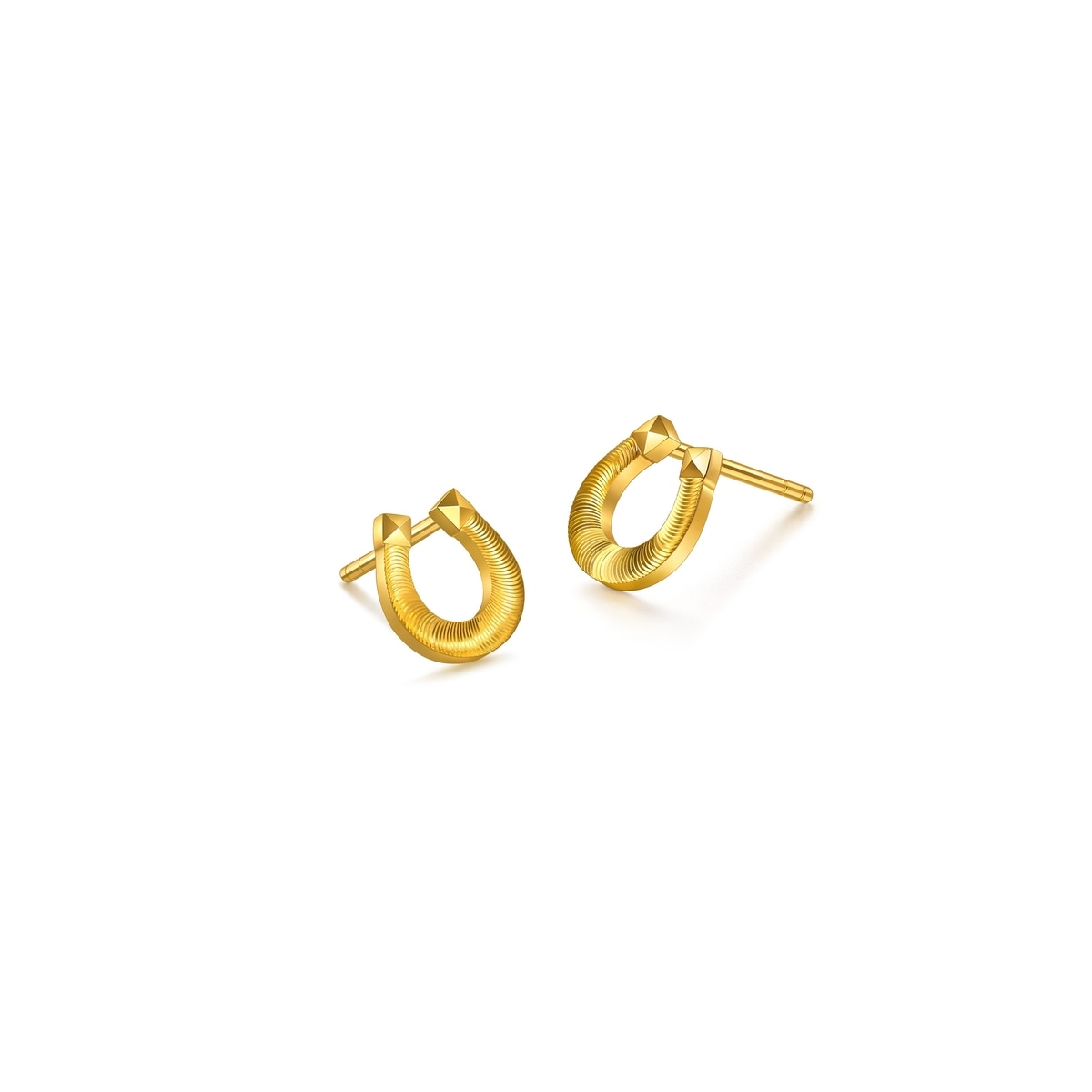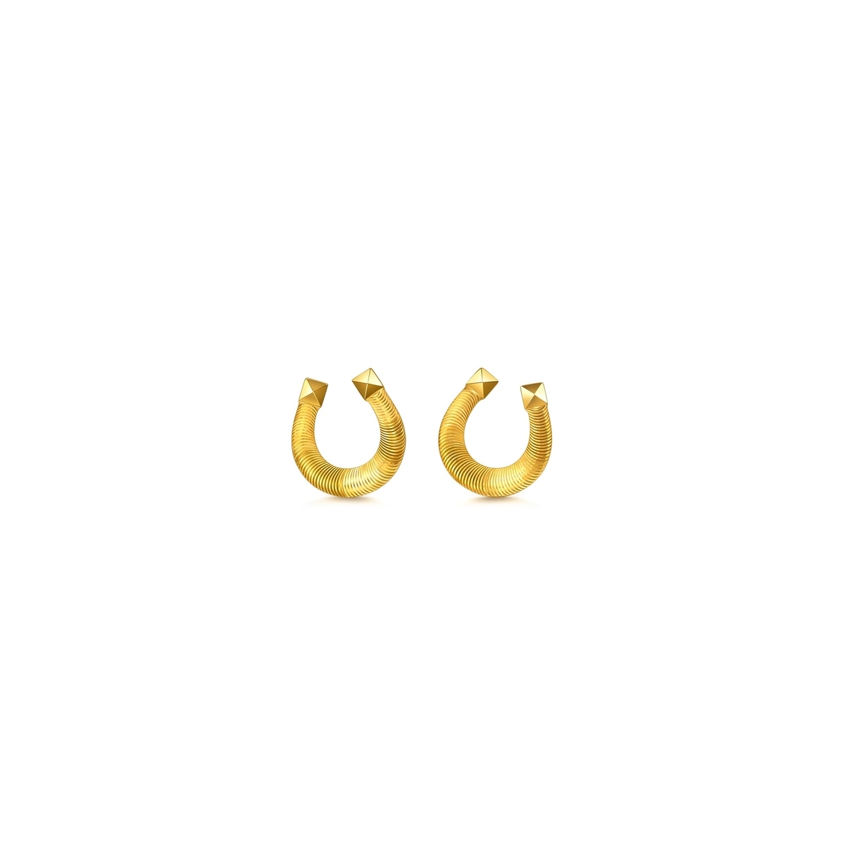 周生生足金耳環以馬蹄鐵為設計元素,採用卓越硬黃金及數碼精雕工藝,賦予獨特貓眼般閃耀光澤,細節精緻立體,結合摩登鉚釘元素,極致時尚奪目。馬蹄鐵是傳統幸運象徵,代表帶來好運與財富,集時尚與祝福於一身。