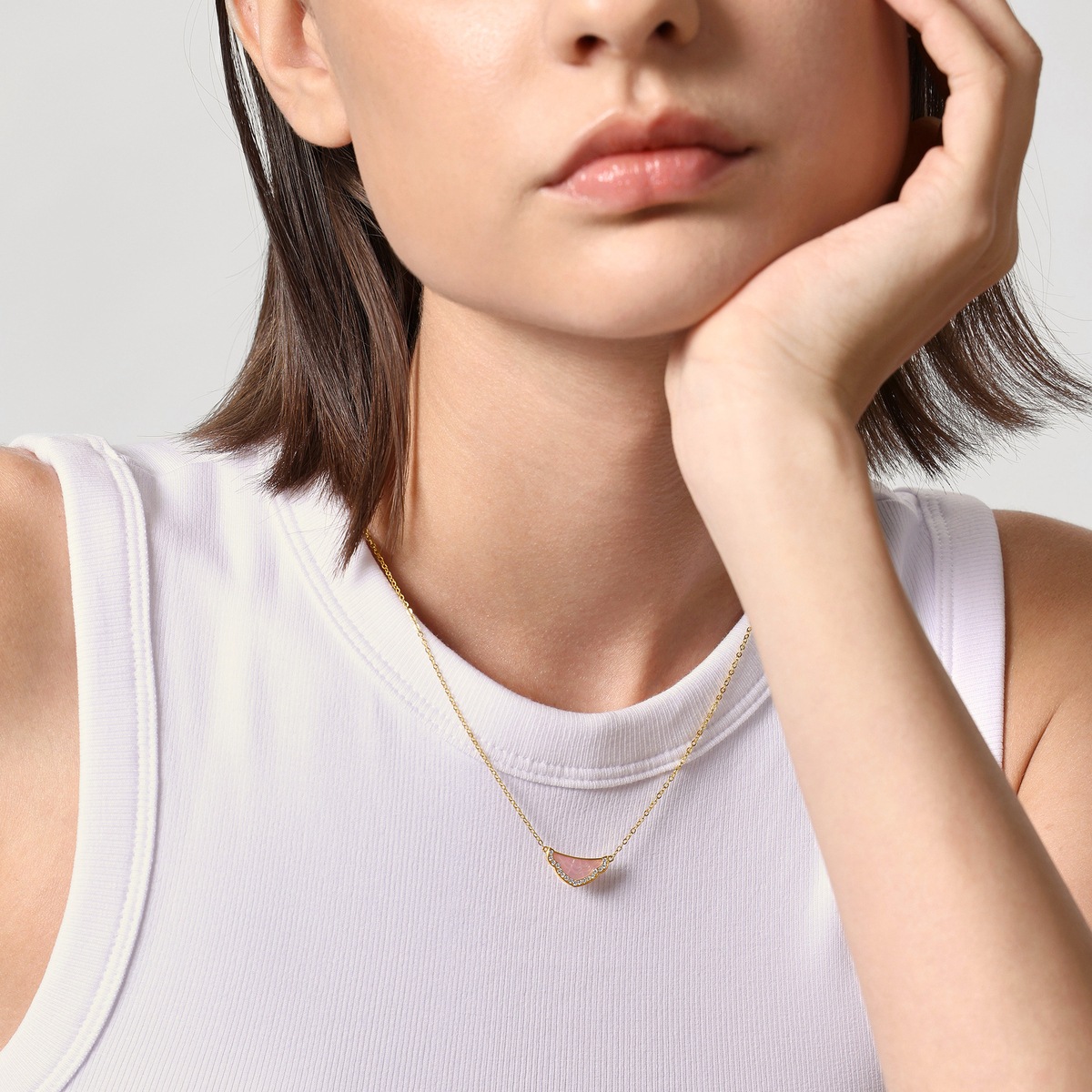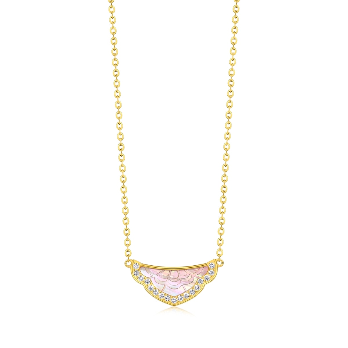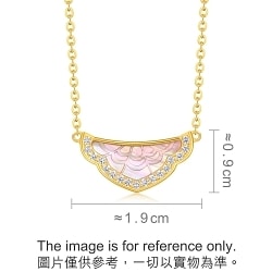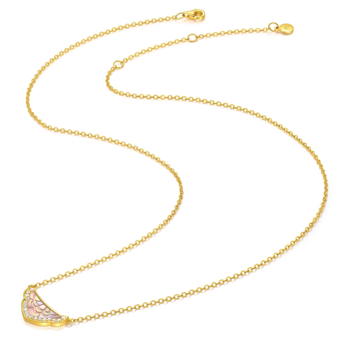 周生生微糖足金頸鍊,設計靈感來自中國古建築上的滴水瓦,以卓越黃金工藝,勾勒出滴水瓦流暢的弧線,結合天然粉色貝母的輕柔色澤,貝母上細緻雕刻了雲紋,呈現出前所未有的精緻質感,瓦邊鑲嵌美鑽點綴,猶如水滴掛在瓦片上,栩栩如生。