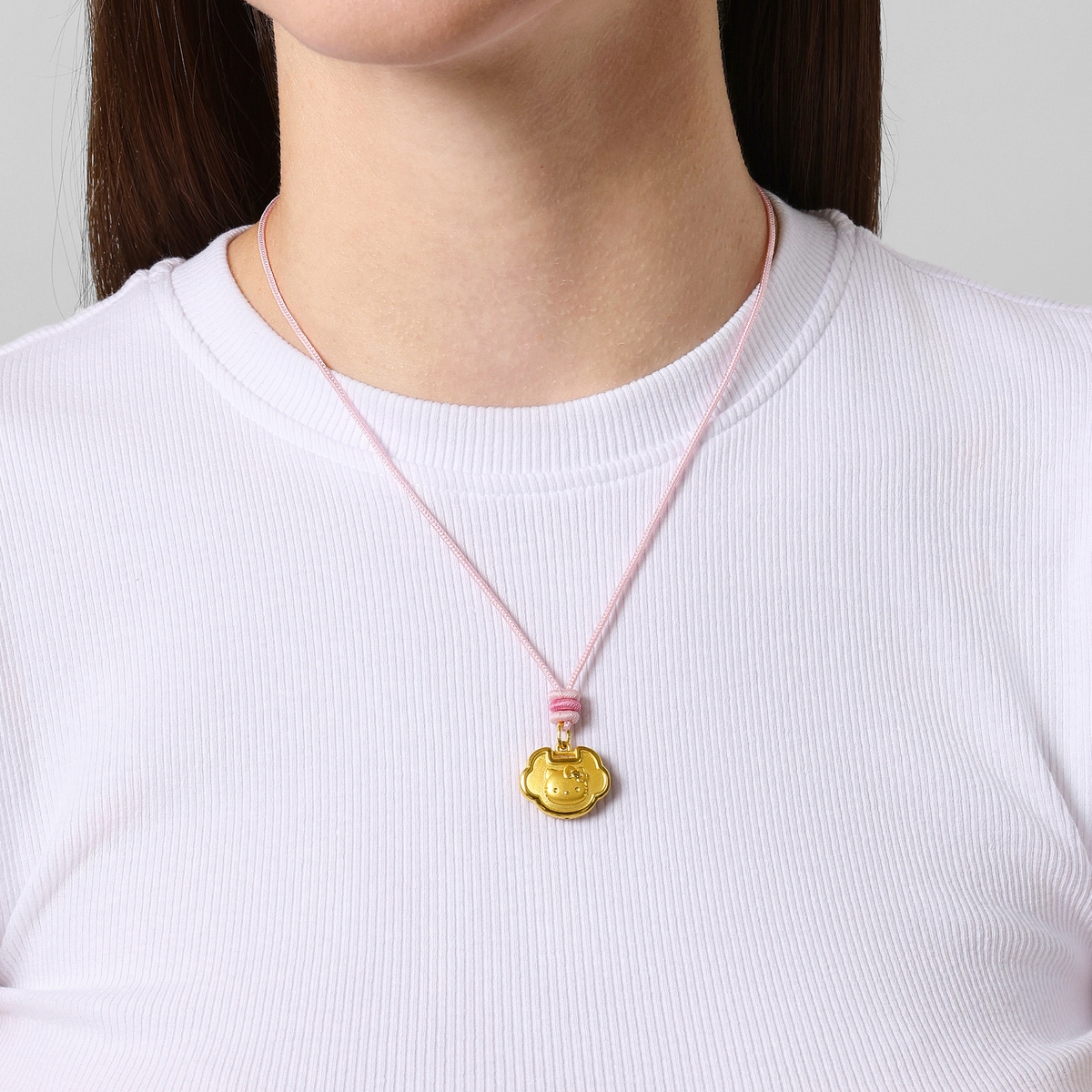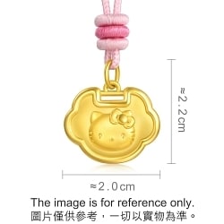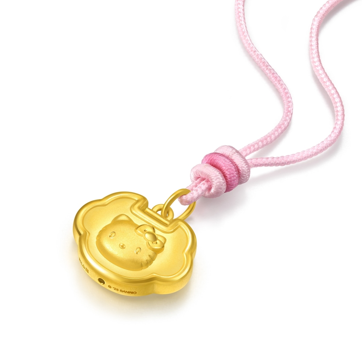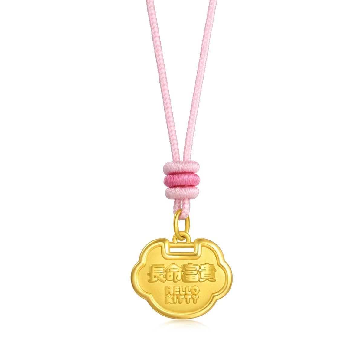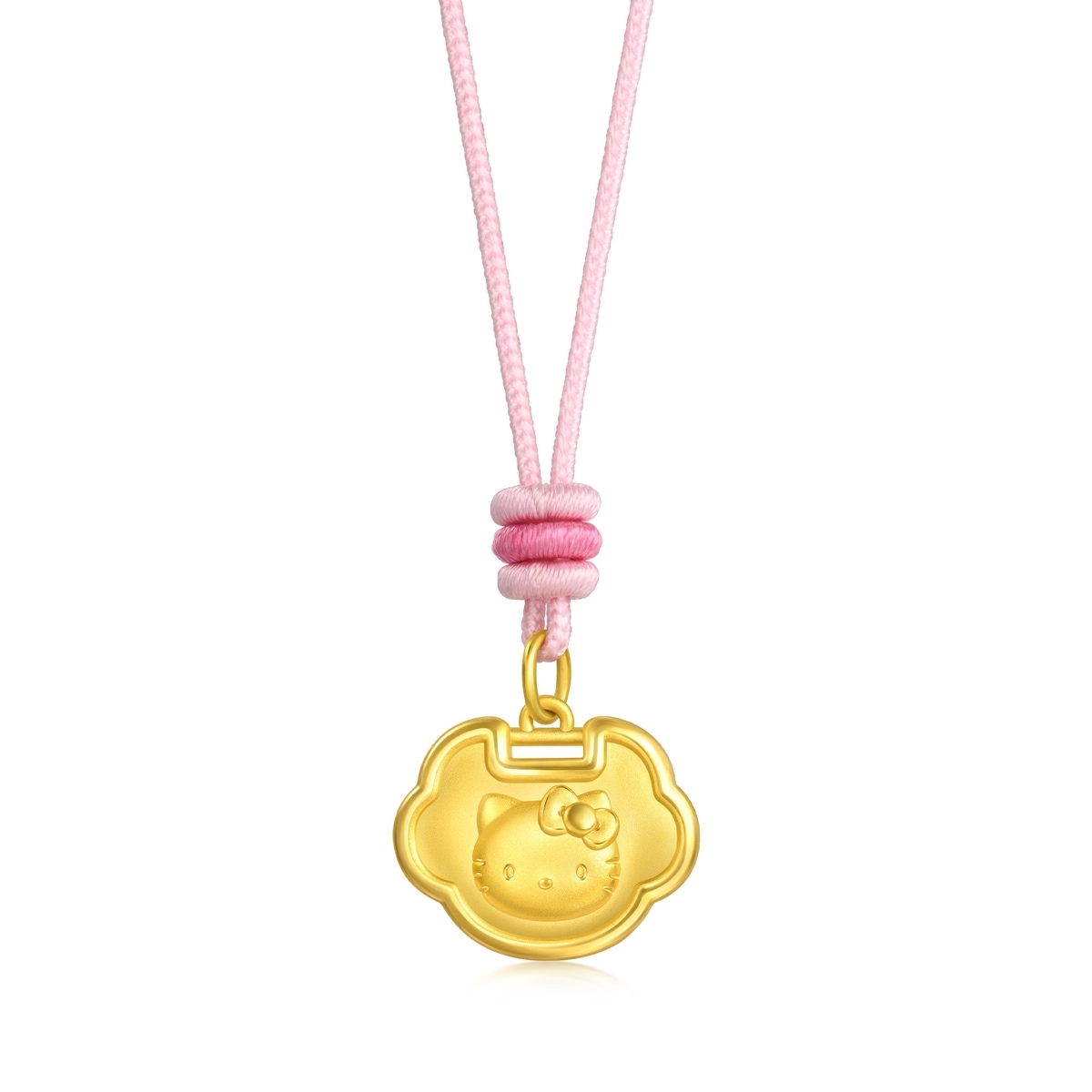 周生生足金Hello Kitty平安鎖頸飾,將Hello Kitty元素注入傳統平安鎖,採用硬金電鑄工藝,造型可愛趣致,教人愛不釋手。背面浮雕「長命富貴」四字祝福,寓意萬事如意、身體健康、榮華富貴,滿載真摯祝願。