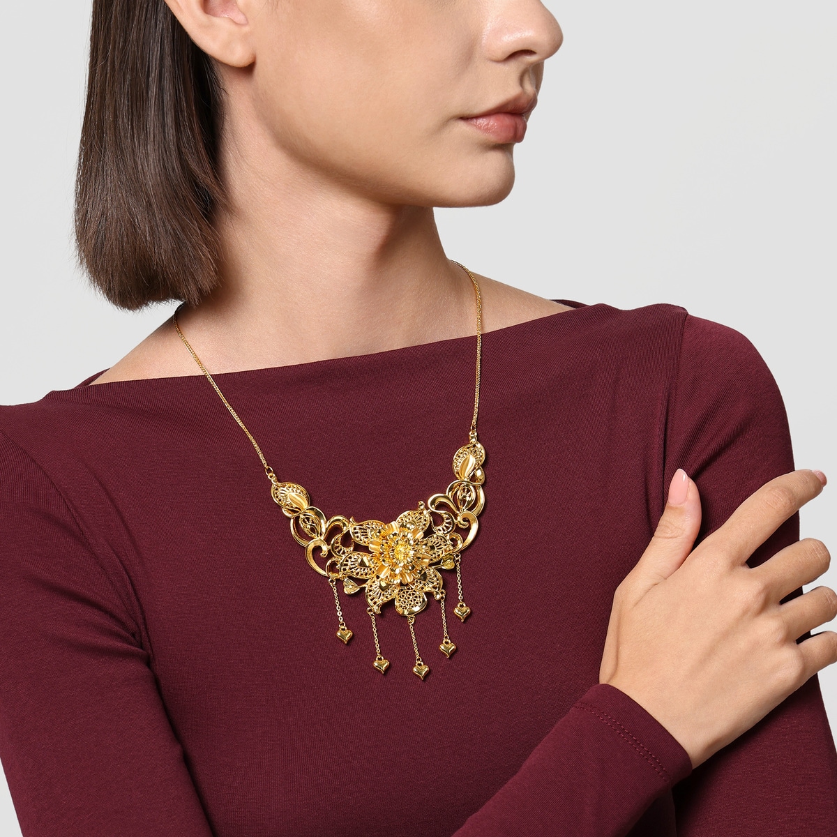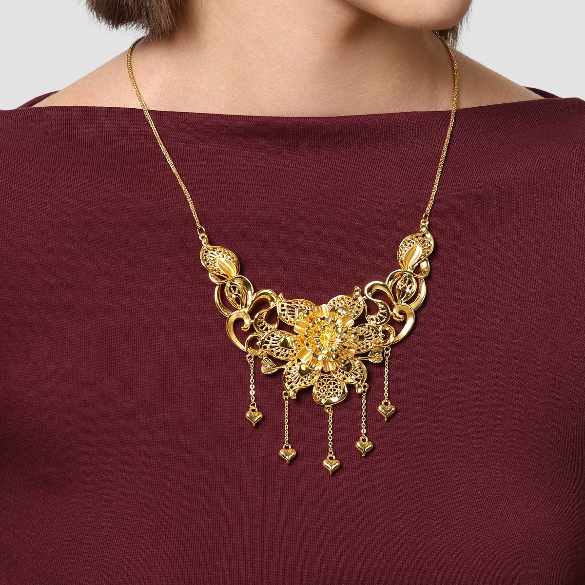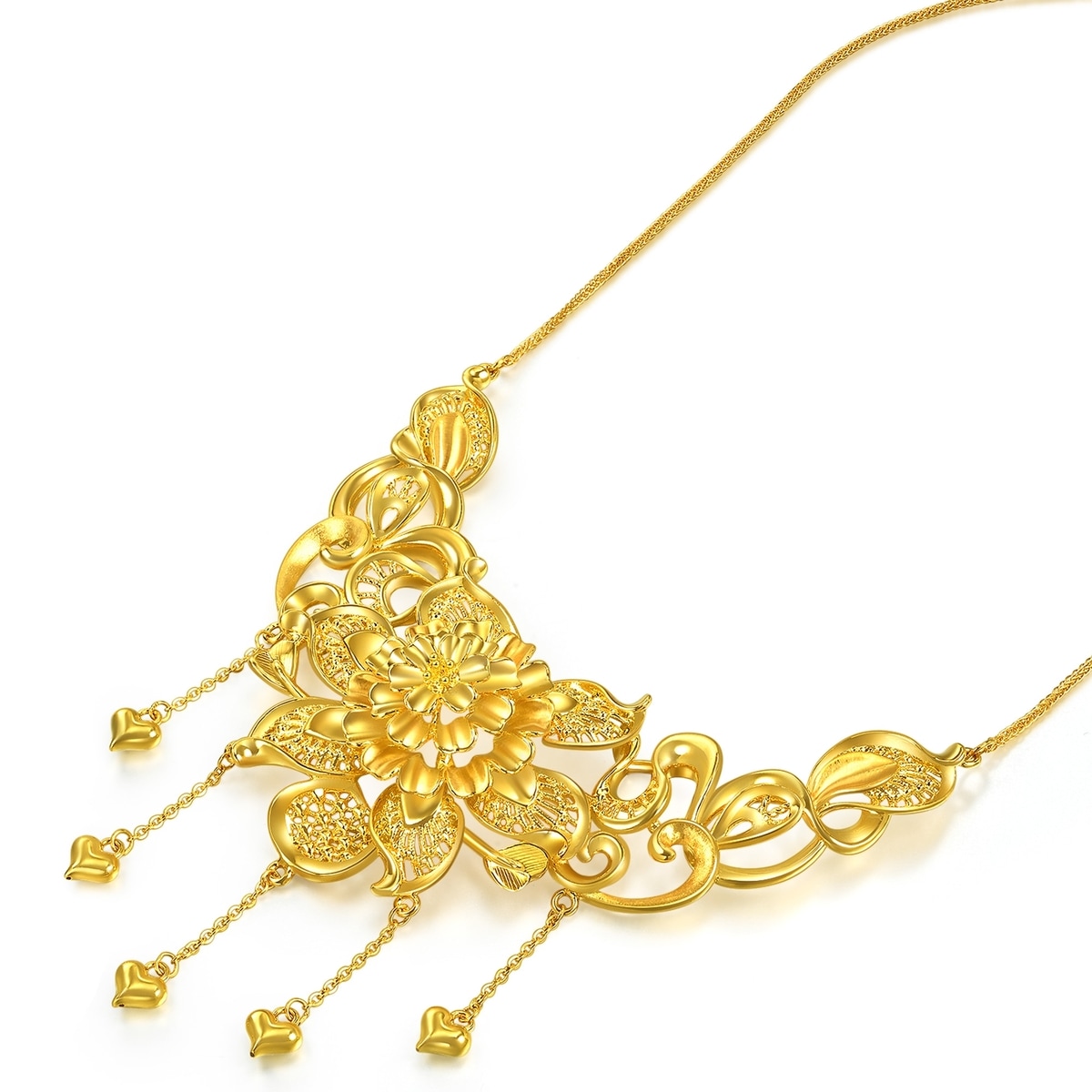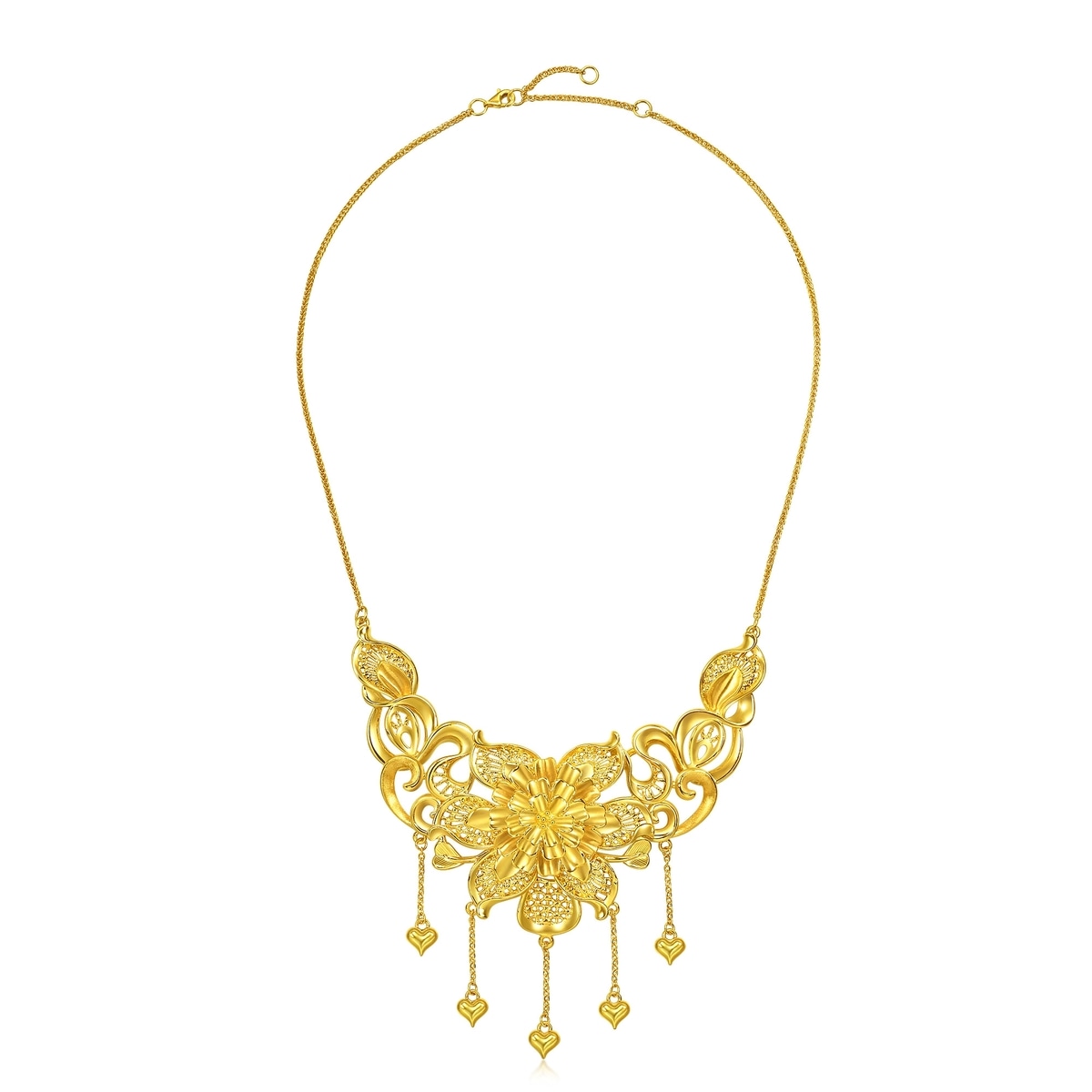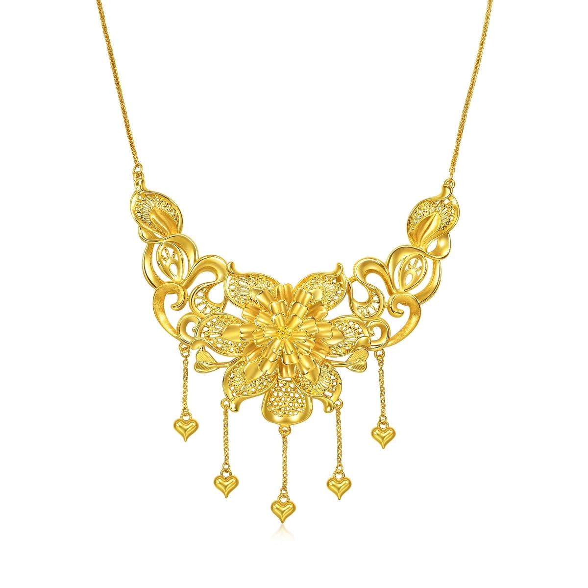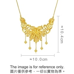 周生生足金頸鍊以花卉為設計元素,採用卓越硬金電鑄工藝,呈現繁花簇擁的華麗姿態,立體造型賦予豐富層次,特別垂掛金珠流蘇,極致靈動柔美,蘊藏花開富貴、花好月圓、百年好合的美滿祝福。