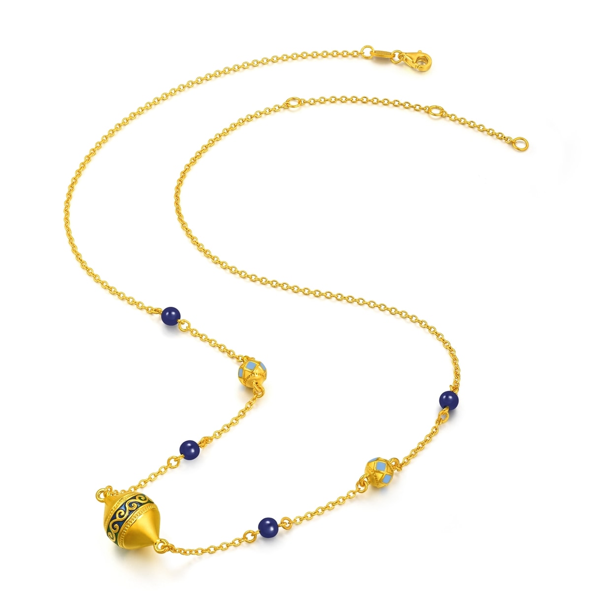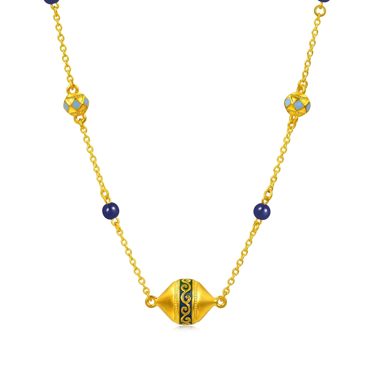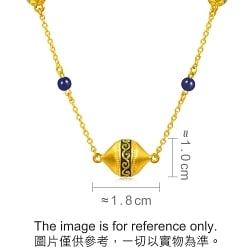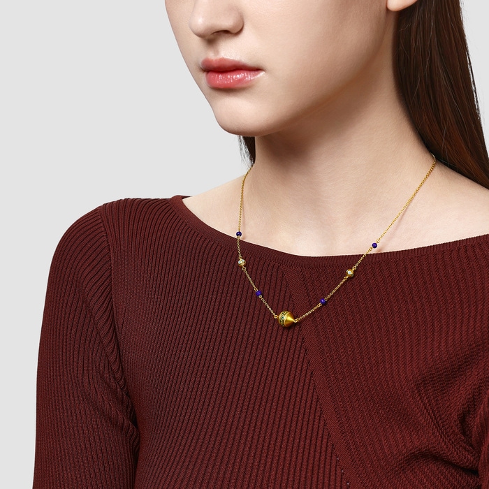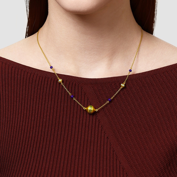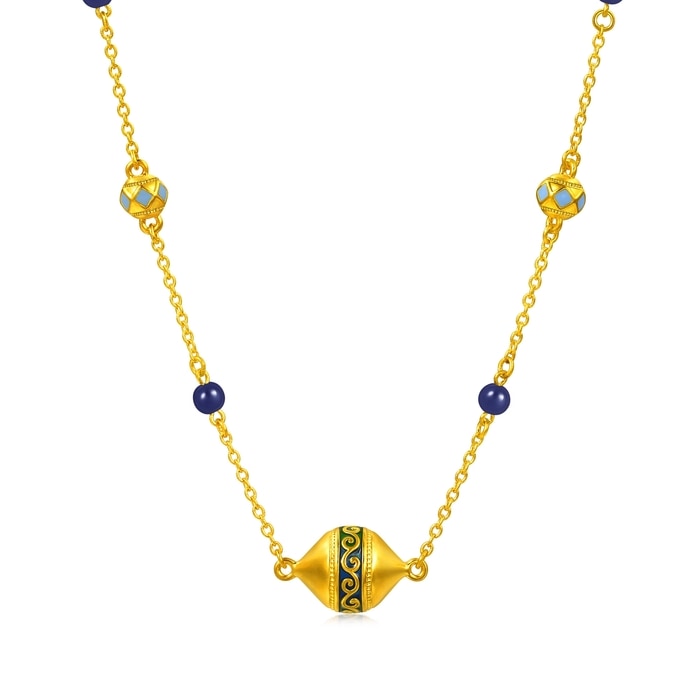 Chow Sang Sang - This gold necklace is inspired by the honeysuckle motif, symbolizing vitality, combined with geometric elements. Crafted with electroforming technique and vibrant colour coating, it showcases bold ethnic beauty. Accented with lapis lazuli to represent blessings of peace, prosperity and elegance.