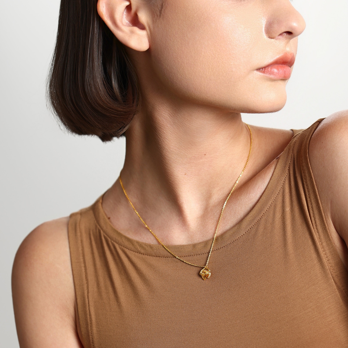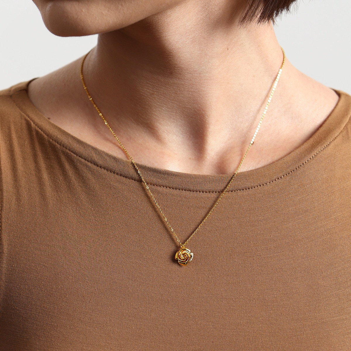 周生生足金鑲嵌鑽石頸鍊以玫瑰花為設計元素,採用卓越硬黃金工藝及鑽石微鑲技術,於立體細緻的玫瑰花瓣表面,精鑲閃耀美鑽,綻放動人花姿,極致浪漫優雅,為日常風格注入時尚魅力。