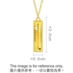 周生生足金頸鍊採用垂墜設計,線條曼妙靈動,以創新5G黃金工藝提升黃金硬度,長方形吊墜表面呈現六邊形蜂巢切割面,營造出高光鏡面效果,反射炫目光芒。頸鍊部分以三款不同組件設計而成,層次豐富,將先進工藝注入潮流美學,輕易配搭各種時尚風格。