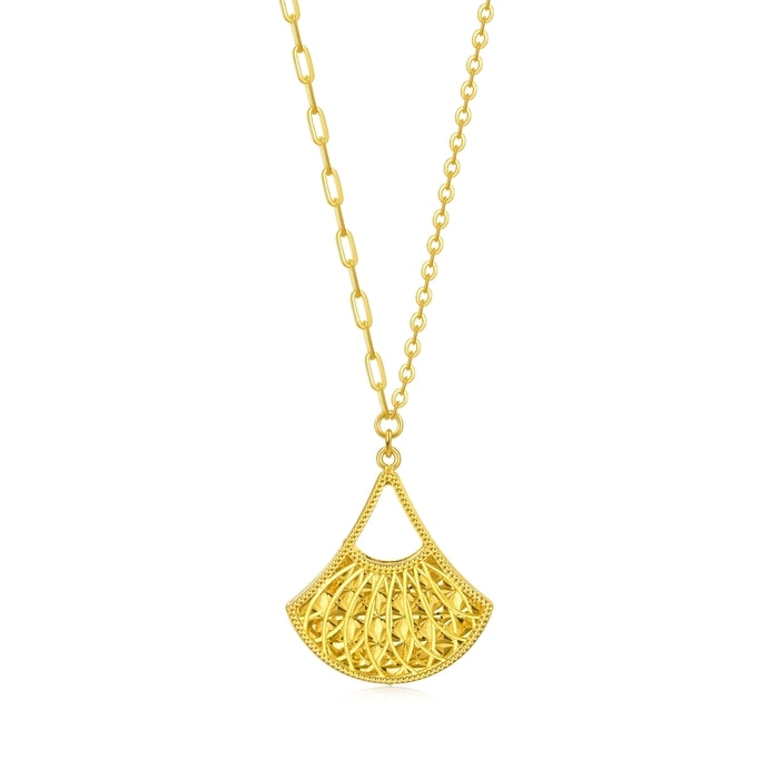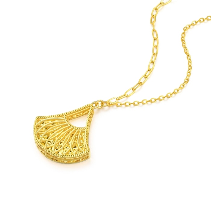 周生生足金頸鍊採用創新5G黃金技術,令黃金硬度大大提升,配以多元黃金工藝,打造出更精緻的足金飾品。頸鍊設計花紋交錯,呈現豐富層次,打造出高光鏡面效果,從不同角度反照出炫目光芒。吊墜線條簡約純粹,鏤空設計營造鮮明對比,彰顯細膩質感,將先進工藝注入潮流美學,成為黃金飾品的時尚新寵。