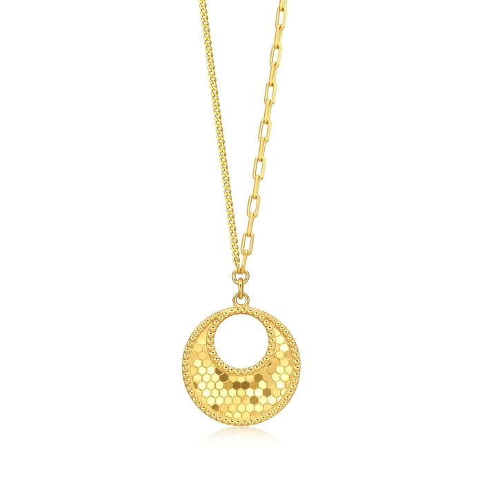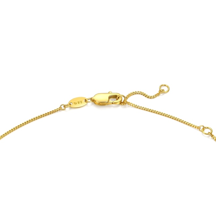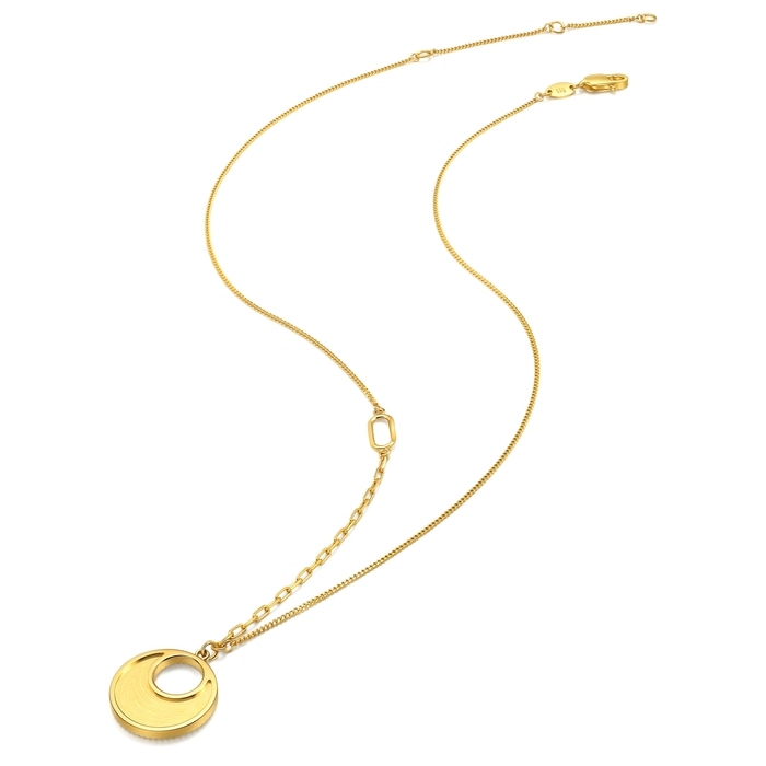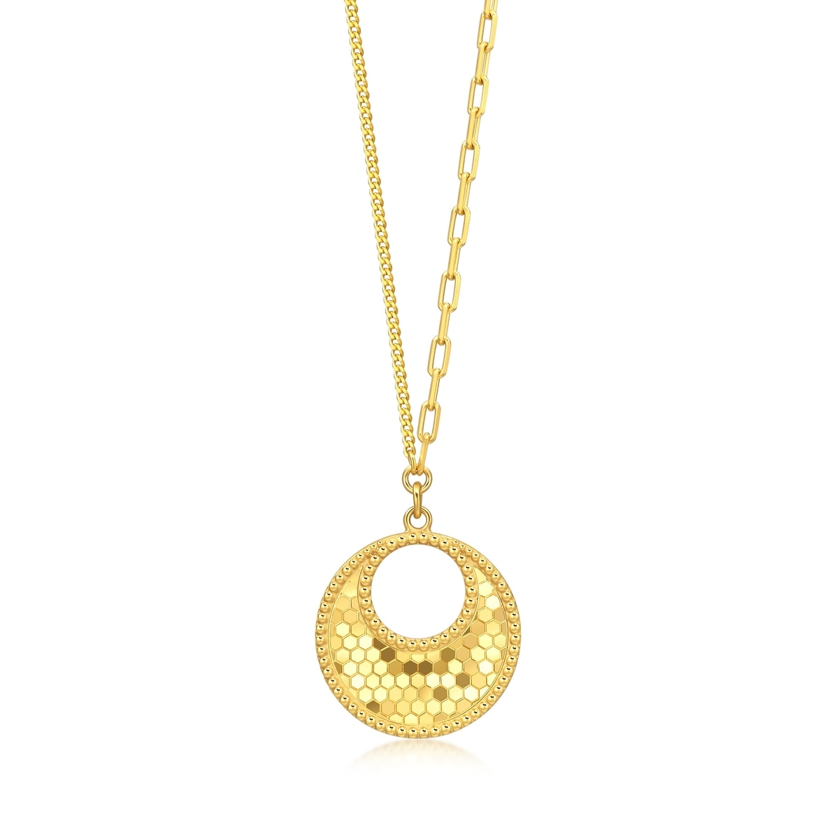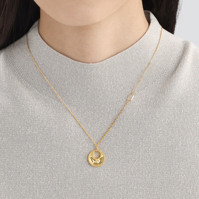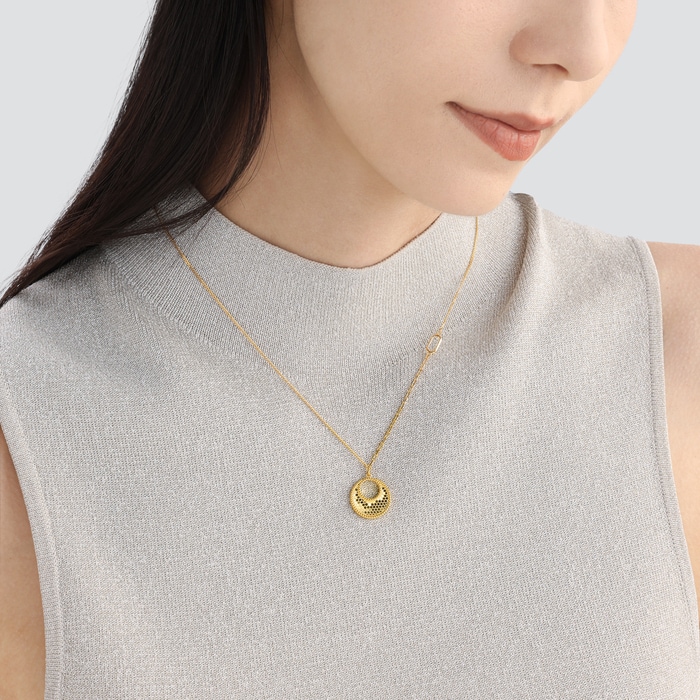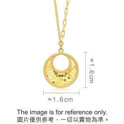 周生生足金頸鍊採用創新5G黃金技術,提升黃金硬度,打造出更精緻的足金飾品。吊墜設計以簡約圓形為造型,表面結合幾何切面,打造出炫目的鏡面效果。金鍊部份採用不對稱設計,彰顯獨特潮流美學。