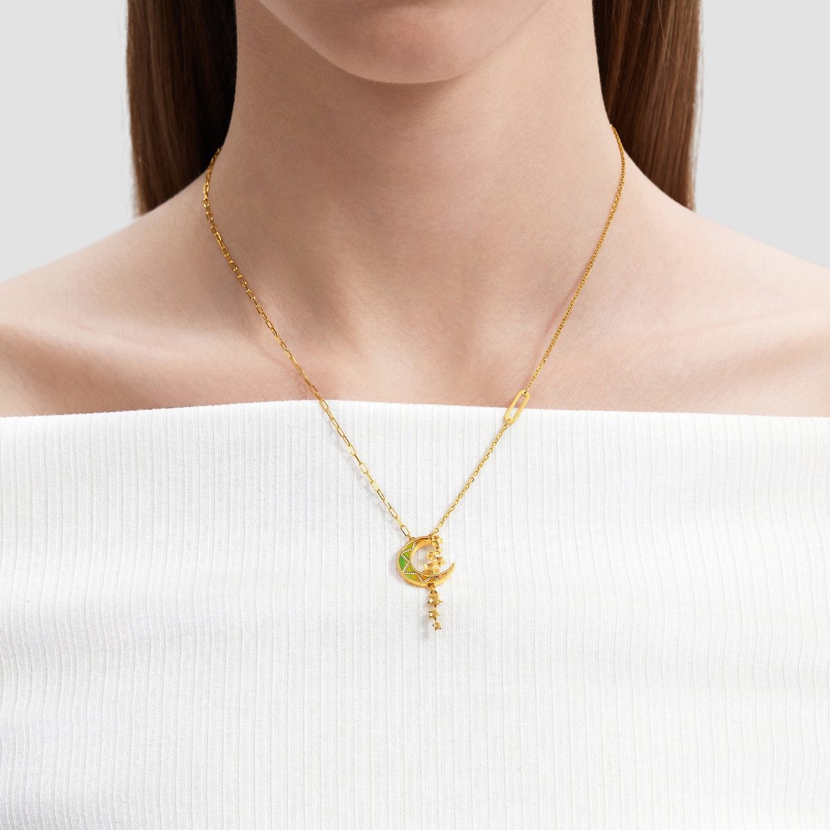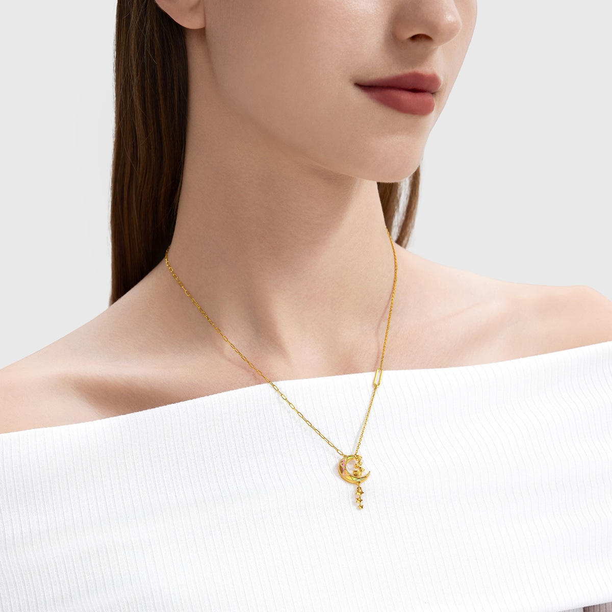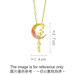 足金頸鍊採用創新5G多元黃金工藝提升黃金硬度,以象徵幸福與希望的星月為設計靈感,糅合精緻工藝勾勒出炫目時尚切面,於不同光源下更折射出無可比擬的幻彩效果,映照出星河下的柔和月光,繁星舞動,流光溢彩,散發無盡魅力與光芒。