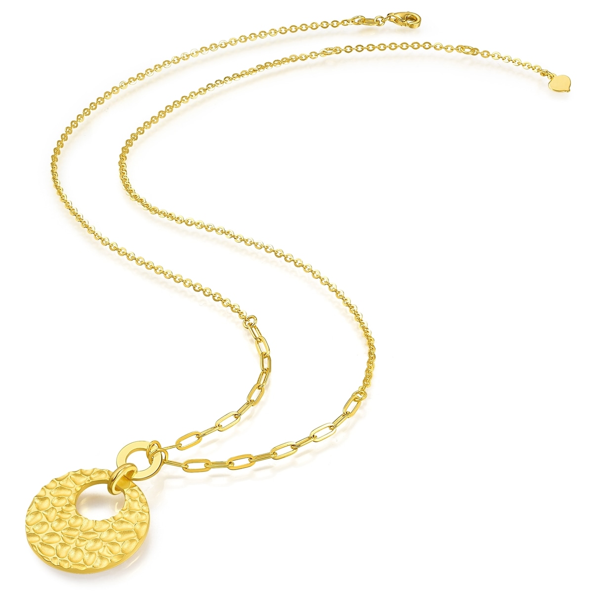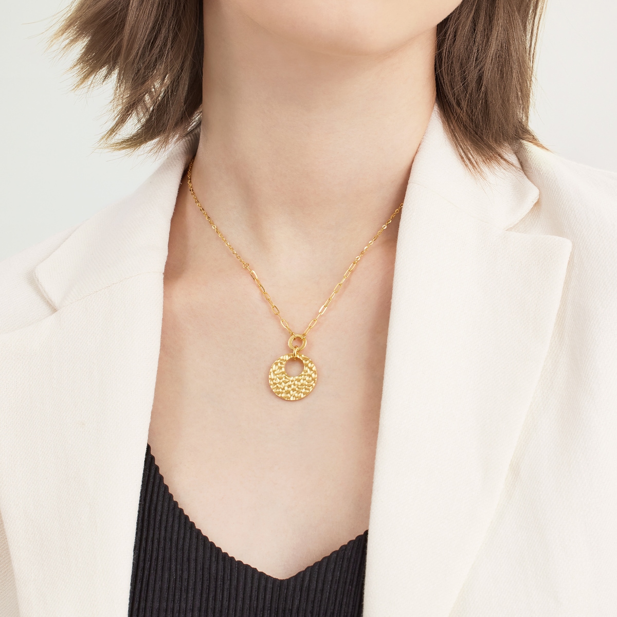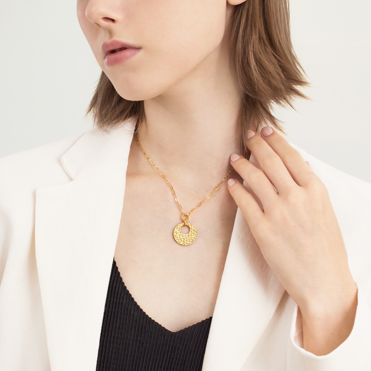 周生生足金頸鍊採用創新5G黃金技術,令黃金硬度大大提升,配以多元黃金工藝,打造出更精緻的足金飾品。簡約圓形設計糅合水光波紋,金光律動,為日常造型注入時尚氣息。