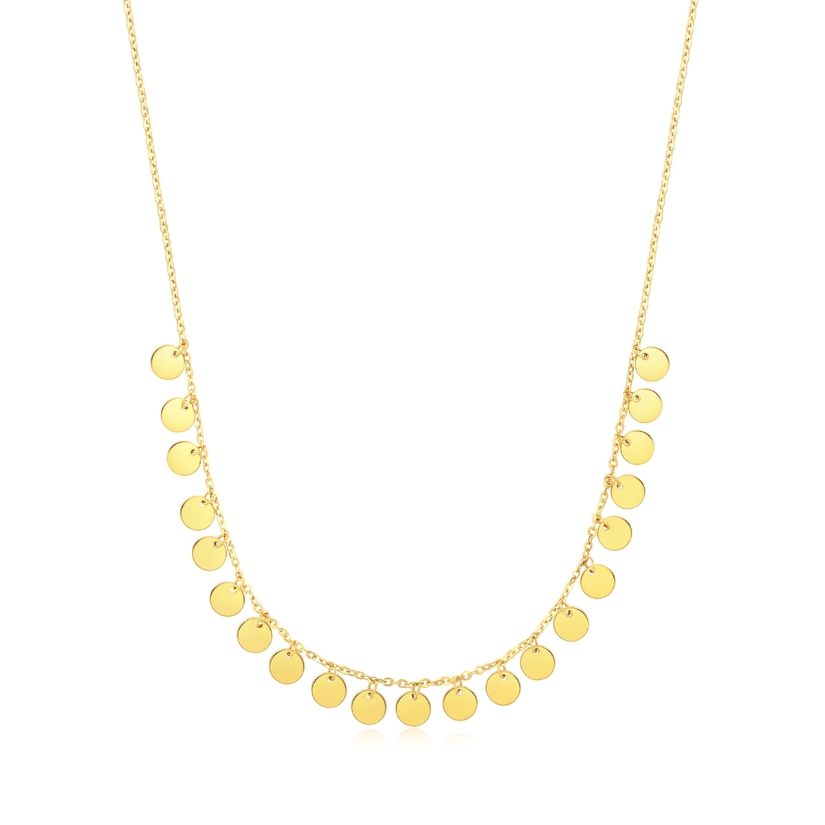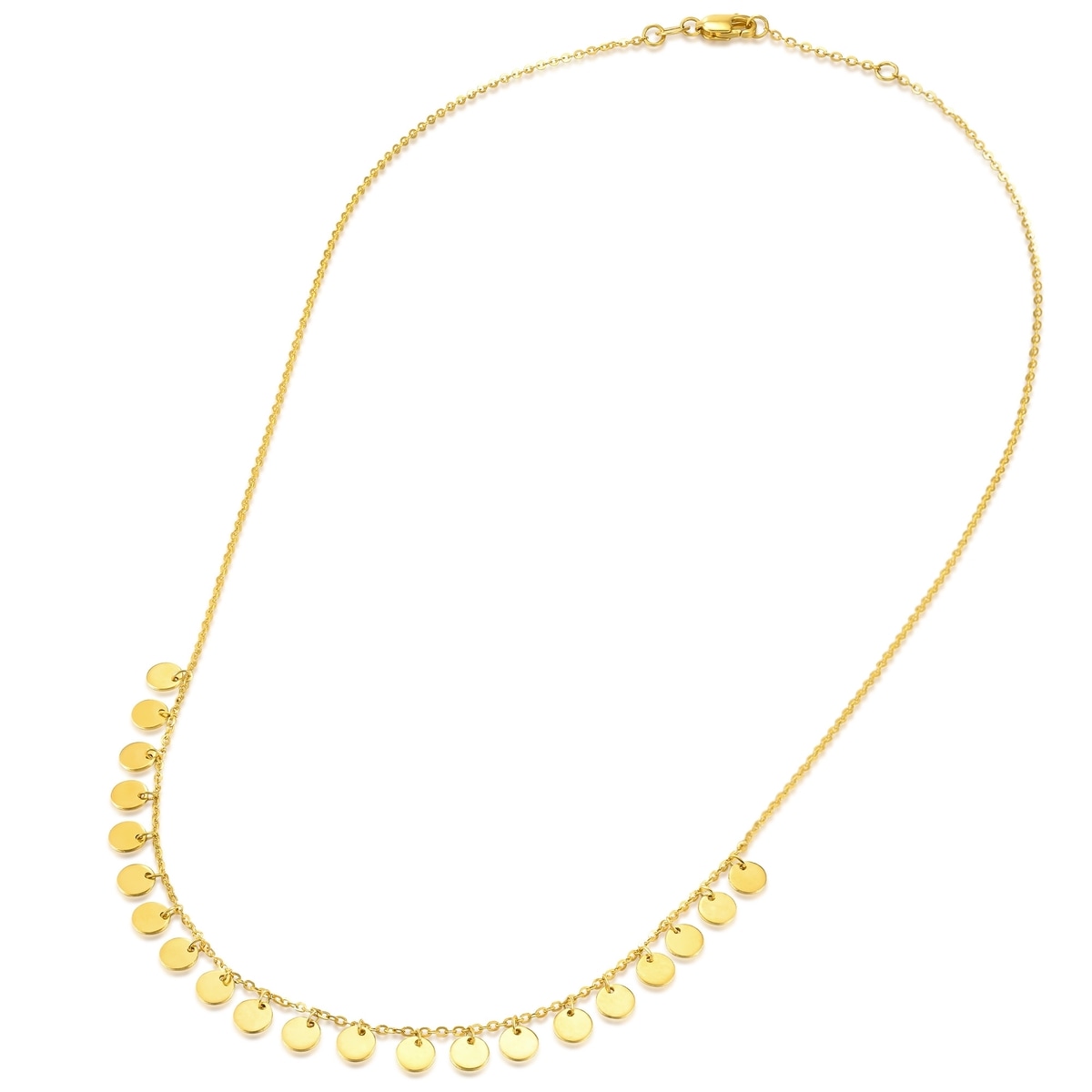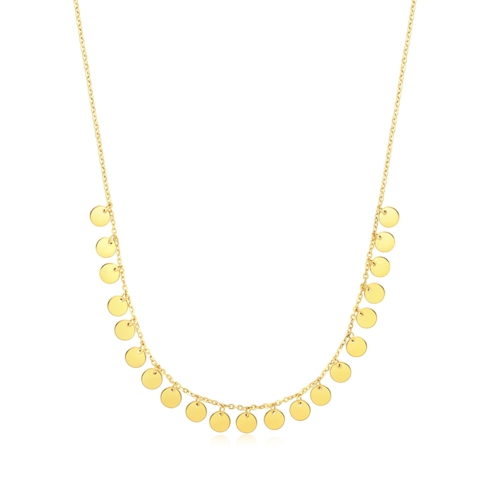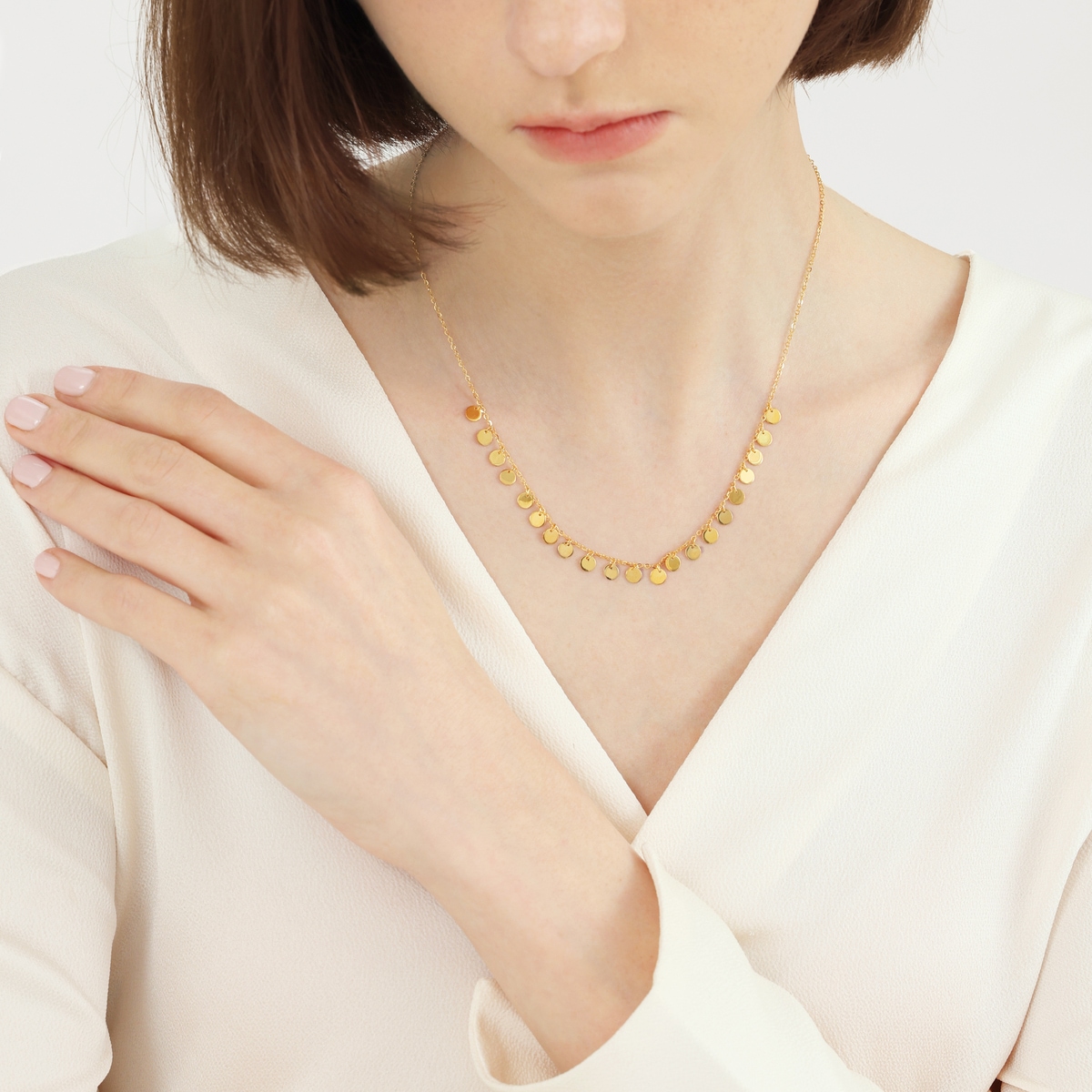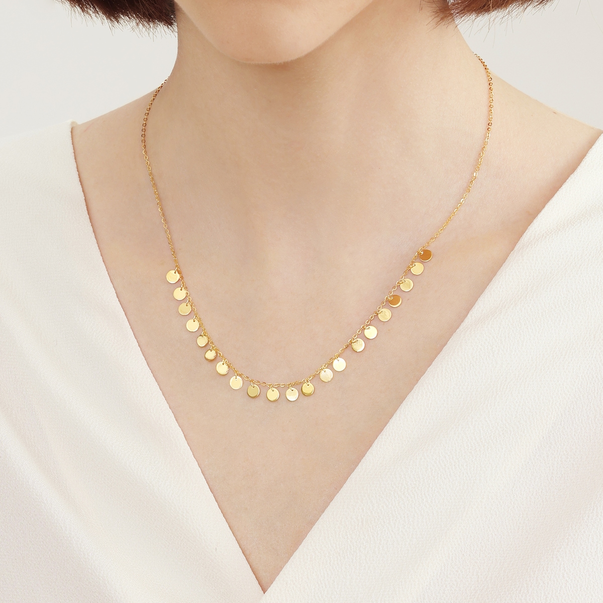 周生生足金頸鍊糅合創新5G多元黃金工藝,提升黃金硬度,打造出各式各樣精巧設計。頸鍊以圓形金片為元素,時尚靈動,舉手投足間閃耀炫目金光,散發無盡魅力,打造優雅時尚風格。