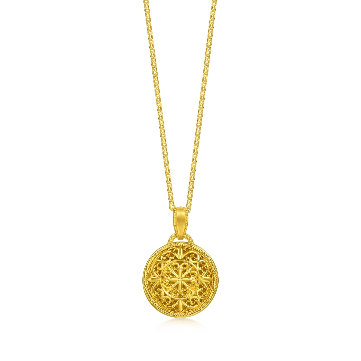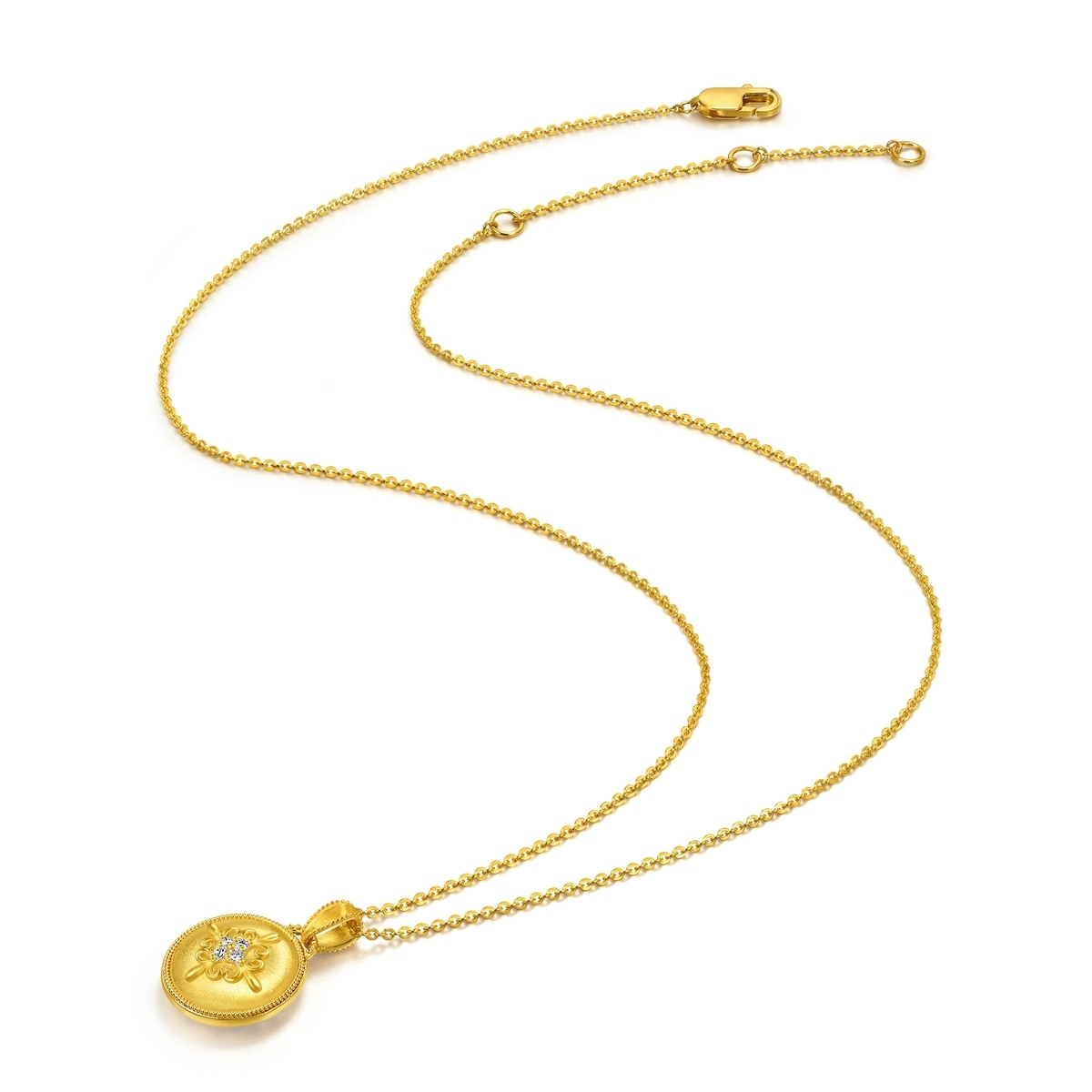 周生生足金鑽石頸鏈採用復古鳶尾花設計風格,以卓越硬黃金工藝及精緻勾絲工藝精雕出金屬紋理,傾注時間以人手打造黃金細緻質感,鏤空圖案別出心裁。精鑲美鑽點綴,高貴典雅,賦予滿滿復古感。
