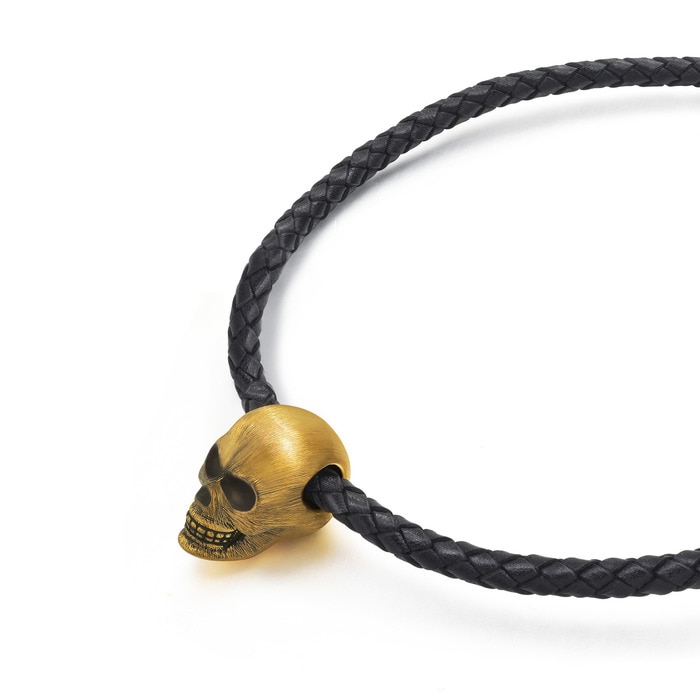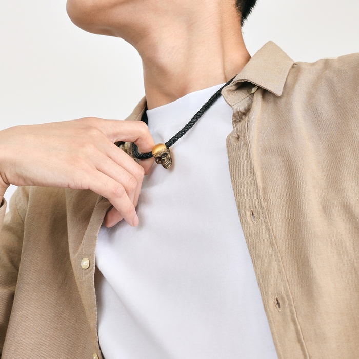 周生生利用硬金電鑄技術打造足金的骷髏頭,造型立體,五官以酷黑工藝作表面處理,再用人手拉絲勾勒出粗獷的線條紋理,簡單一顆鍊墜,加上真皮頸繩,即可展現黑色魅力,型格前衛。中性設計適合男女佩戴,易於混搭其他珠寶,打造個性風格。