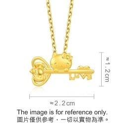 周生生足金吊墜以Hello Kitty愛情之匙為設計靈感,工藝精緻細膩。Hello Kitty手握以標誌性蝴蝶結為元素的愛情鑰匙,結合「LOVE」字及心形圖案,象徵打開幸福之門,守護甜蜜愛情。